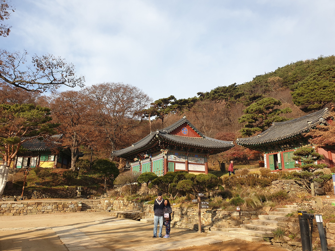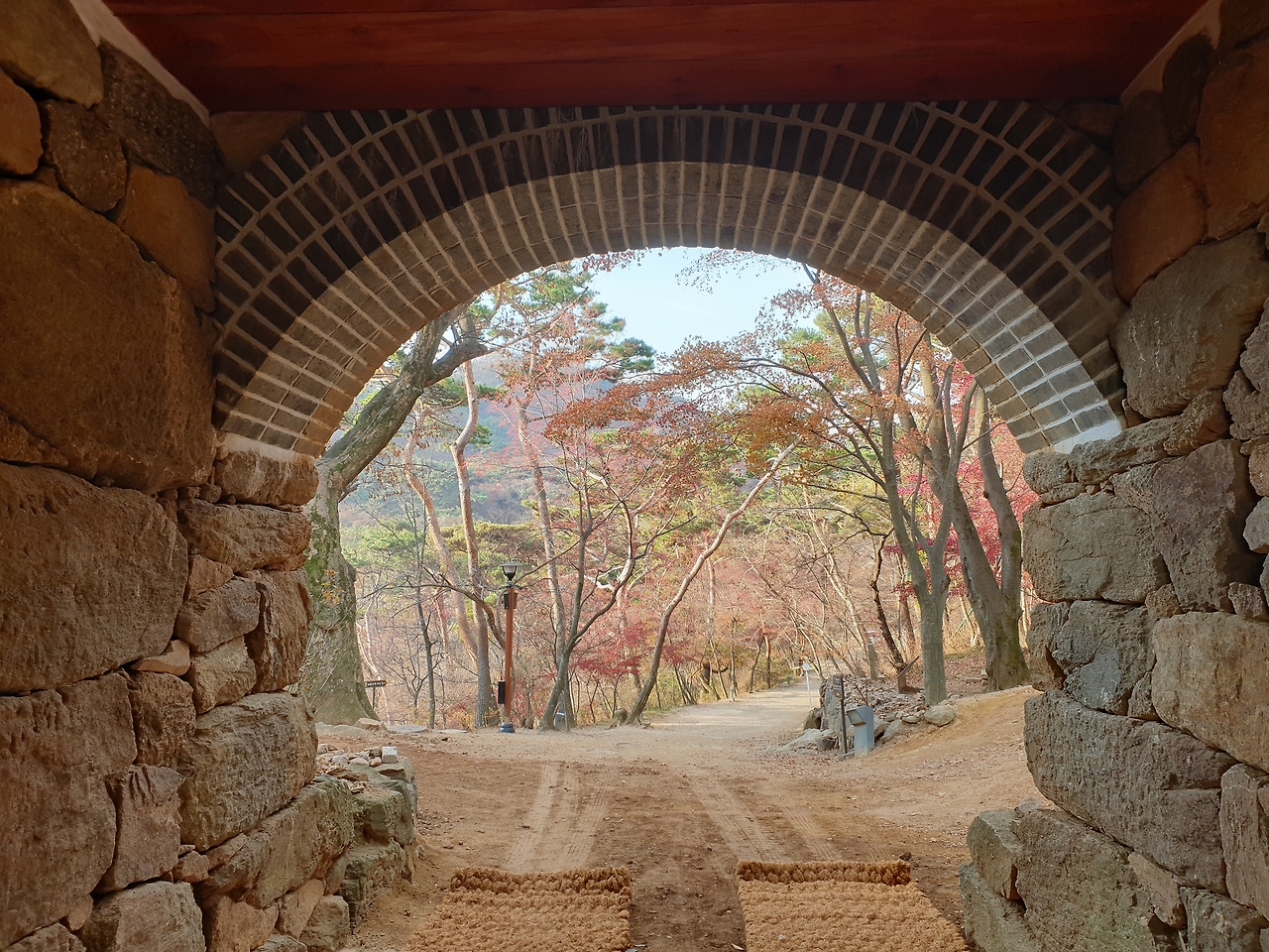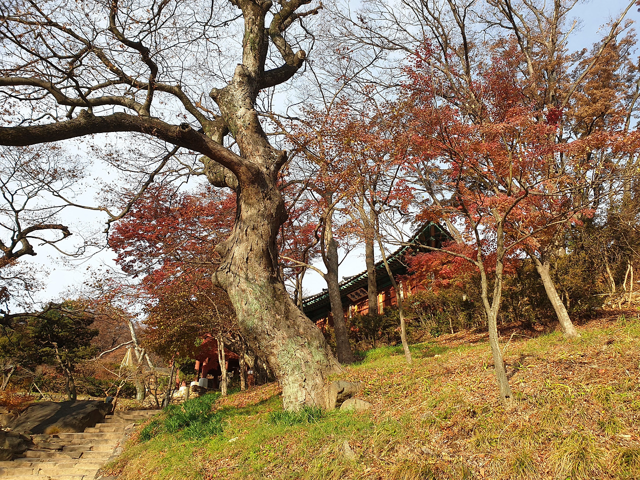 전등사 아래에 닿았다. 남문 앞을 지나 동문 앞 주차장에 자전거를 세워두고 걸어서 오르기 시작했다. 양헌수 장군 기념비를 지나 호젓한 산길을 얼마간 내려가니 위로 절 건물이 보이기 시작했다. 대웅전은 수리 중이었고 약사전, 명부암 등이 고색창연하다. 정족산 둘레길을 걸어야 마땅하지만 갈 길이 멀어 그냥 내려와야만 했다.