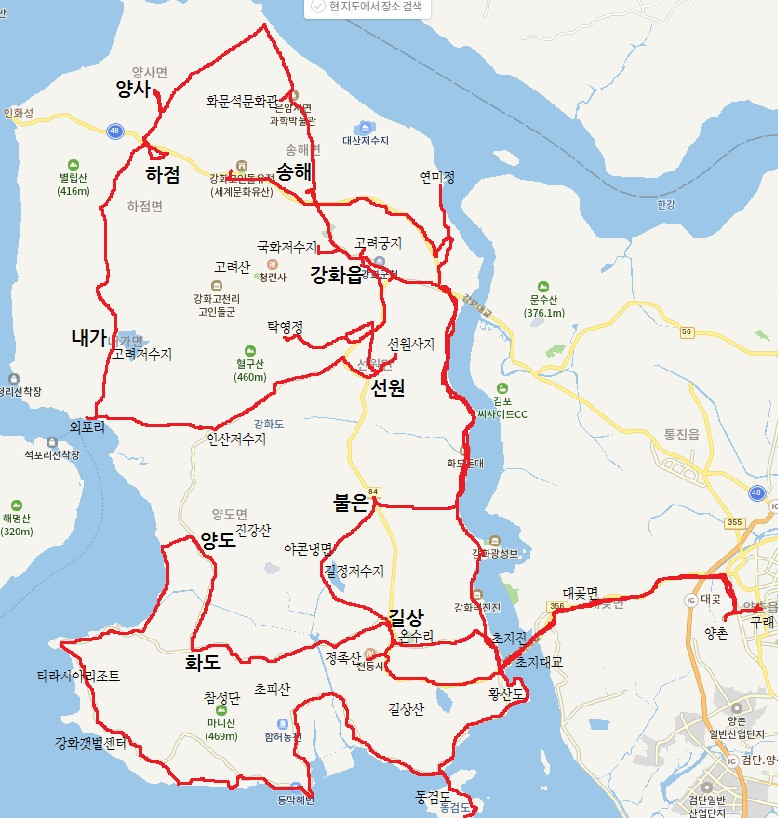 해질 시간을 의식해 더 가지 않고 내륙으로 방향을 틀어 양도면을 지나 탑재삼거리에서 가능포로로 접어들었다. 평지가 계속되고 저 멀리 마니산이 차츰 가까워지고 어느새 화도면에 이르렀다. 마니산 참성단 가는 길 초입을 지났다. 참성단은 단군에게 제사 지내는 곳이니 민족의 성지다.