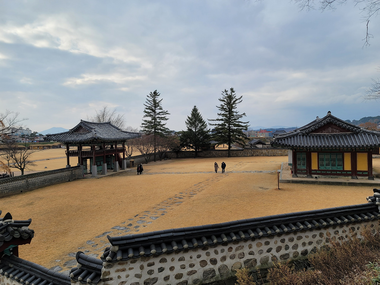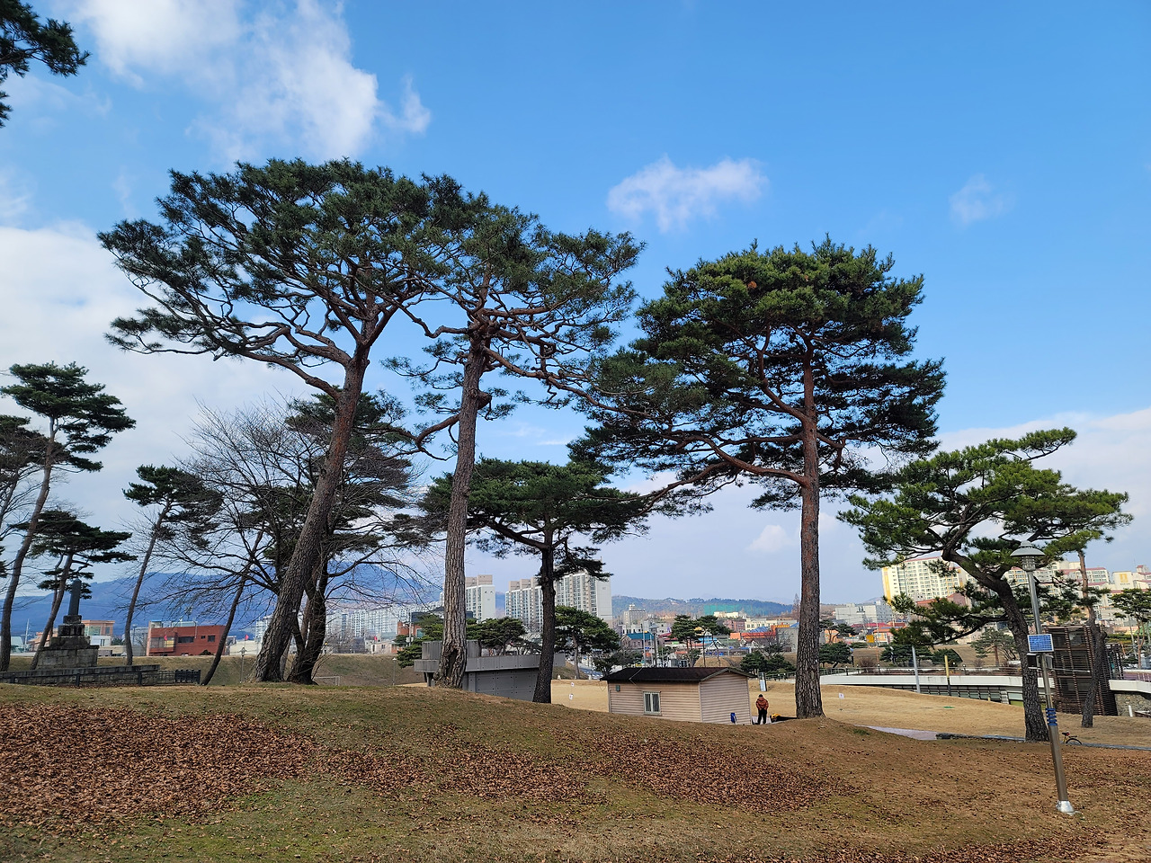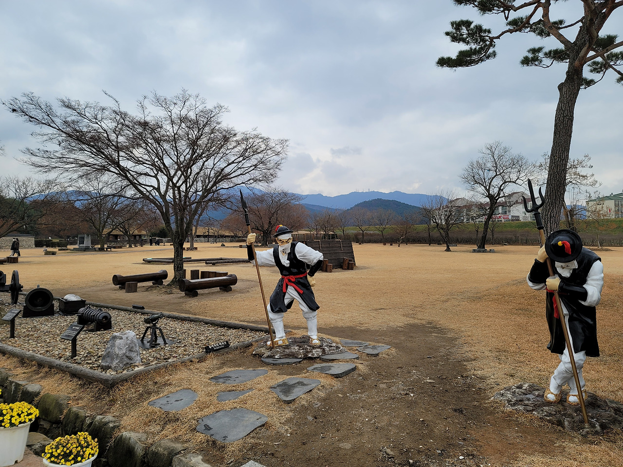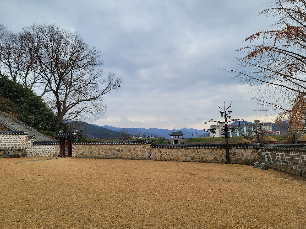 해미읍성은 홍성에서 본 좀 어수선했던 홍주성과는 사뭇 달랐다. 훨씬 더 넓었고 깔끔하게 잘 단장이 되어 있었다. 곳곳에 초가집이 있어서 마치 민속촌에 온 느낌이었다. 이렇게 넓은 잔디밭을 본 기억이 별로 없었다. 서서히 걸음을 북쪽으로 향했다. 우람한 건물의 동헌에 이르르니 돌계단이 있기에 계단을 올라가보았다. 언덕 위에 청허정(淸虛亭)이 있었고 울창한 소나무숲이 그곳에 있었다. 볼것이 많았고 사진 찍고 싶은 장면이 곳곳에 널려 있었다. 동헌 옆 객사 앞의 소나무는 참 묘하게도 생겼다.