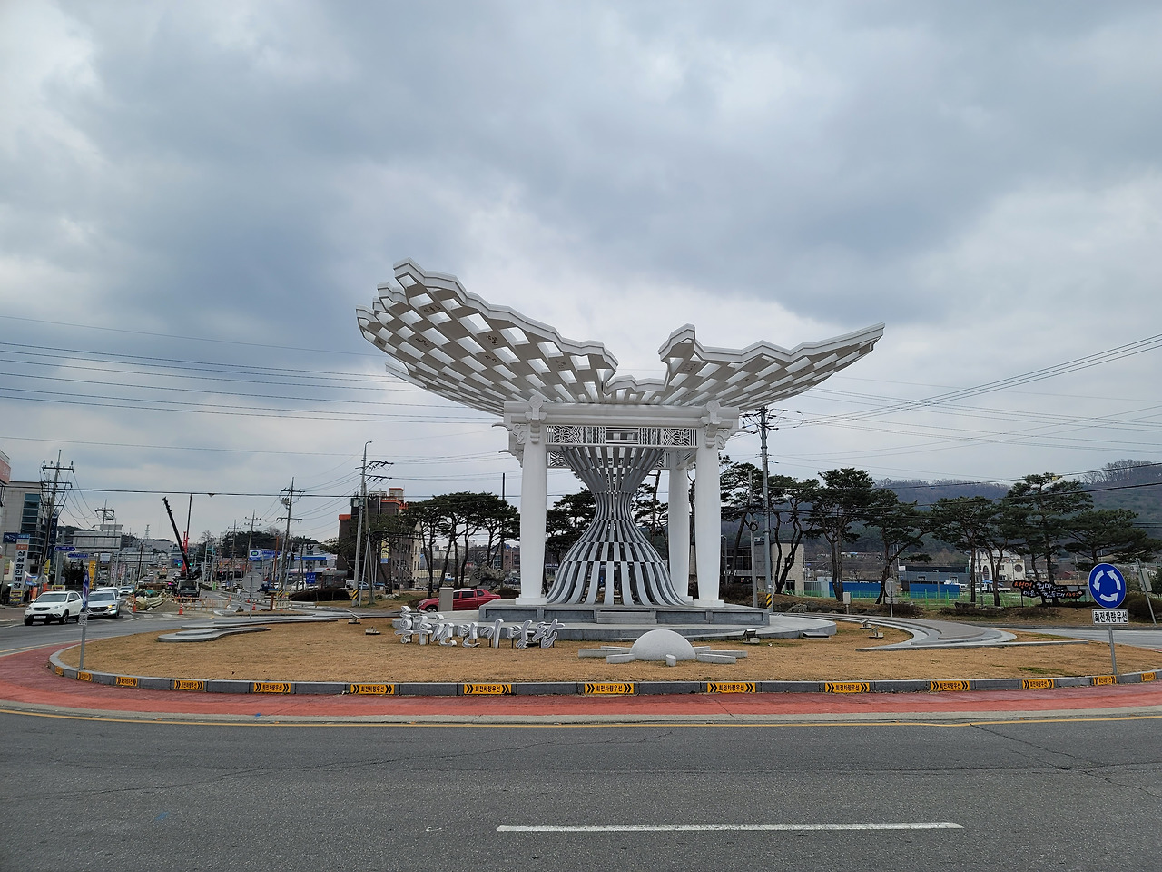 홍성온천 앞을 지나 홍성우체국을 거쳐 옥암2교차로에 이르니 웅장한 조형물이 서 있었고 홍주천년기념탑이라 씌어 있었다. 이 네거리의 한쪽 모퉁이에 홍주문화회관이 있다. 좌회전하면 보령, 우회전하면 예산이라 씌어 있었지만 직진하면 어느 방향인지는 붙어 있지 않았다. 서산 방향이라는 표지가 없었다. 스마트폰의 지도를 꺼내 보고 직진해야 함을 알 수 있었다. 서서히 오르막이 시작되었다. 저 멀리 산 아래에 도로가 나 있었고 차들이 맹렬히 달리고 있었다. 그 도로는 보령, 광천에서 오는 23번 국도였다.