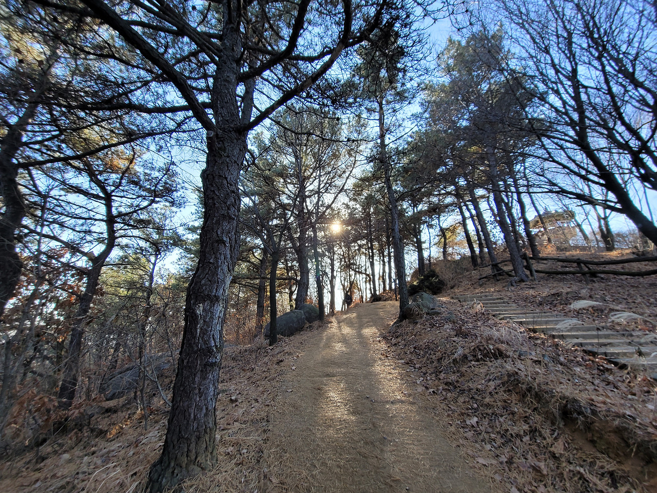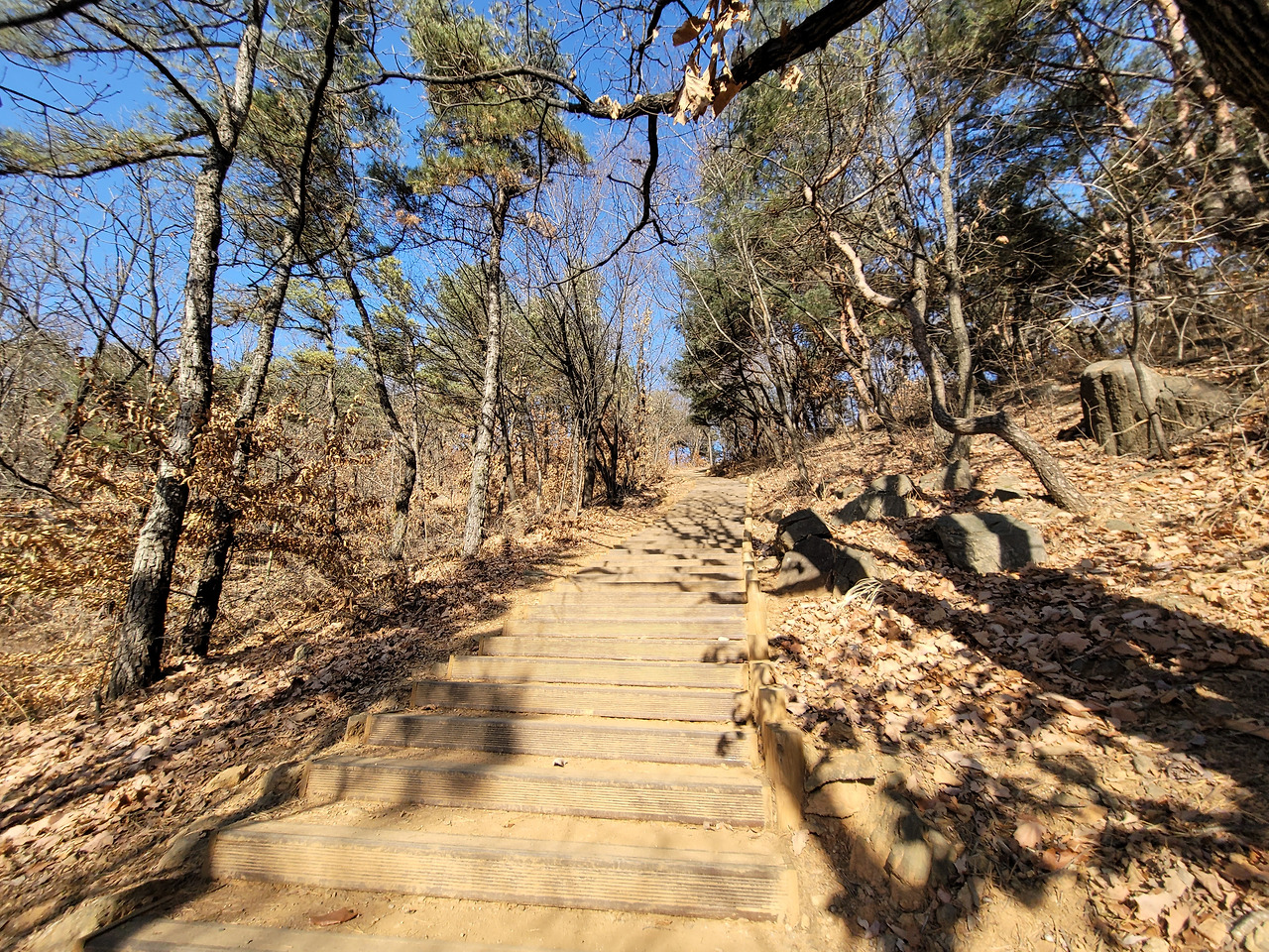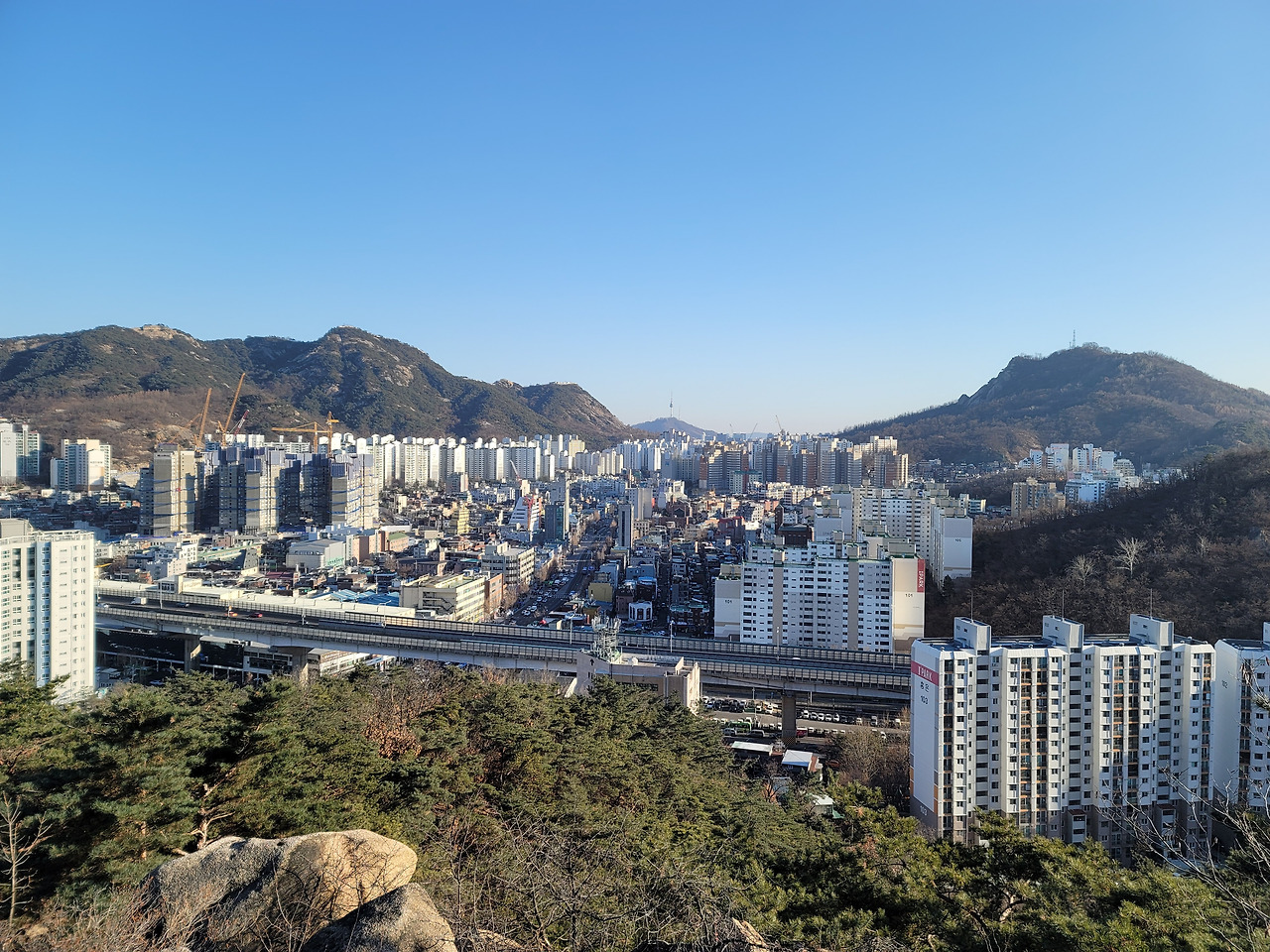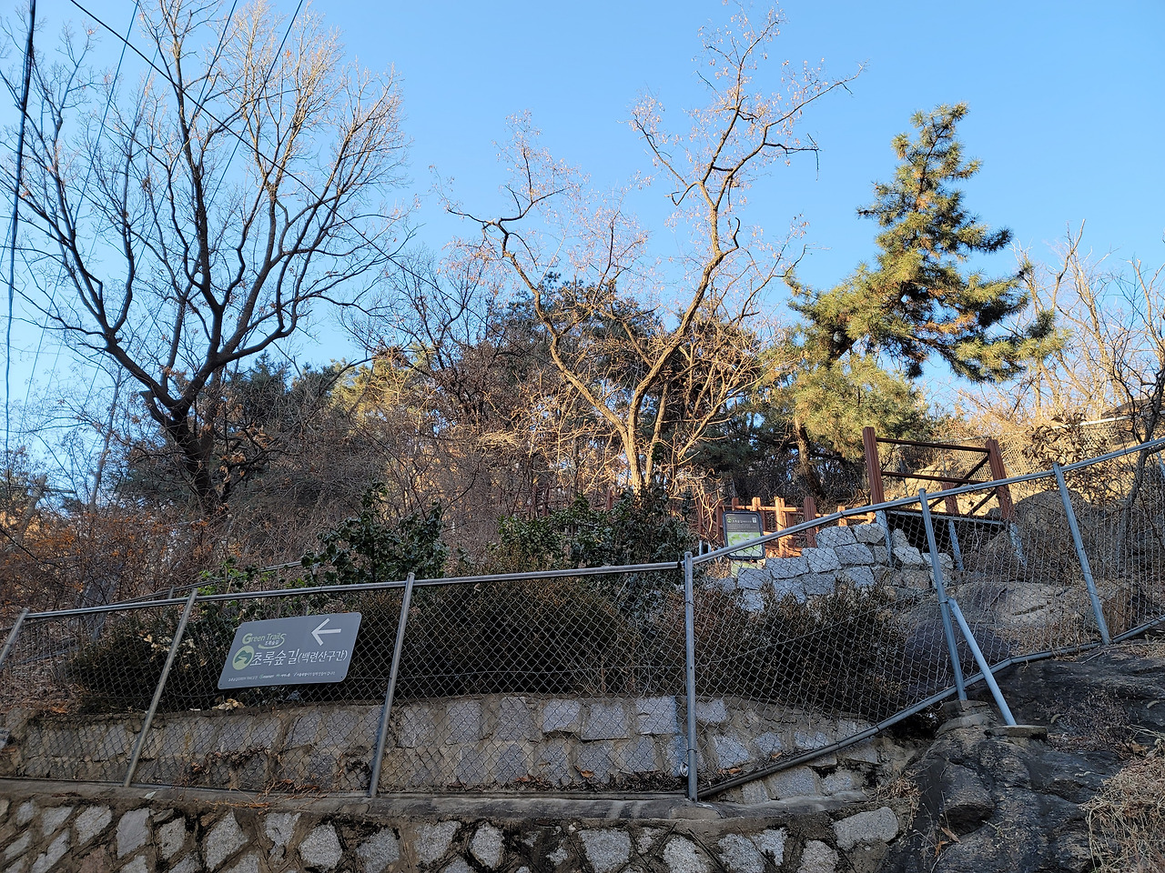 이런 전망 좋은 백련산은 서울 시내 다른 산들보다 소음이 적다. 도로와 떨어져 있기 때문일 것이다. 그래서 조용하게 산행할 수 있다. 주된 길은 길게 뻗은 능선길이다. 몇 군데 내려가는 길이 나 있다. 서쪽으로는 은평구, 동쪽으로는 서대문구이다.