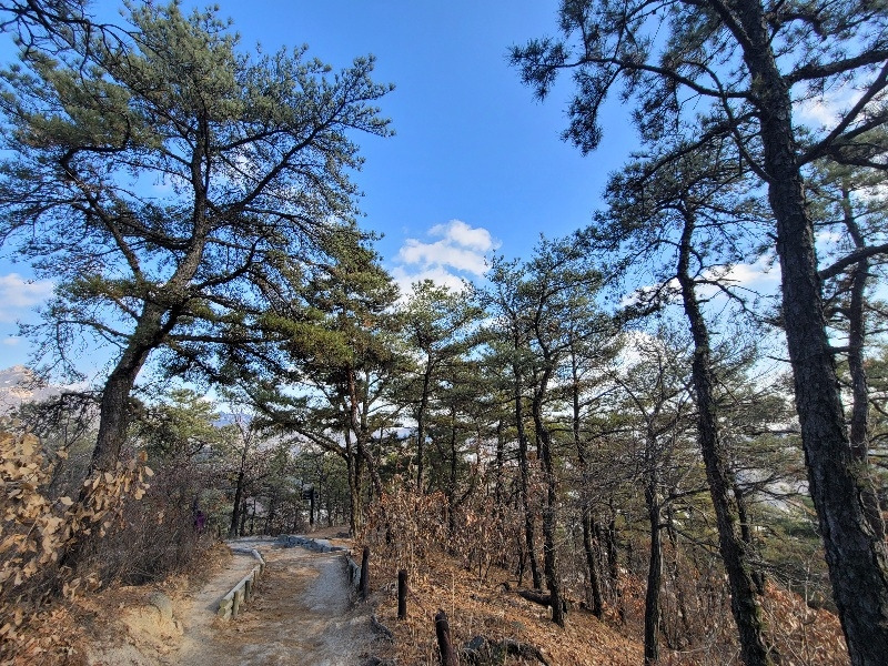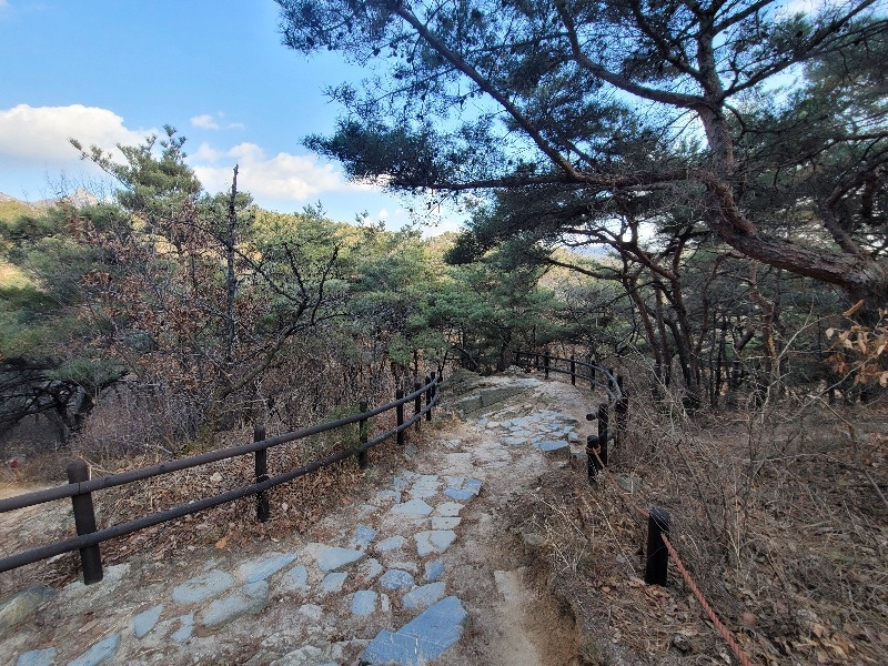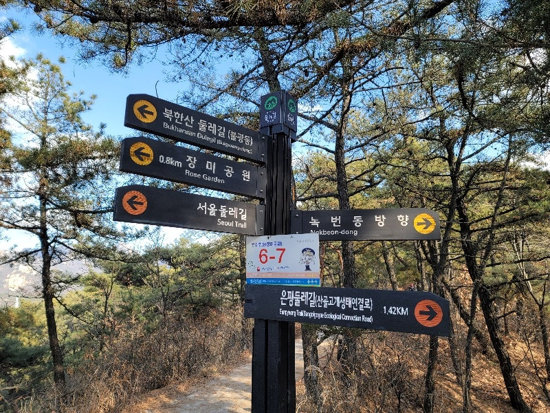 길은 곧 두 갈래로 나뉜다. 오른쪽의 북한산자락길(옥천암)과 왼쪽의 북한산둘레길 7구간(옛성길)으로. 그러나 두 길은 완전히 갈라지지 않고 나중에 만난다. 북한산둘레길(옛성길)이 능선길이고 북한산자락길은 좀 더 아래에 있다.