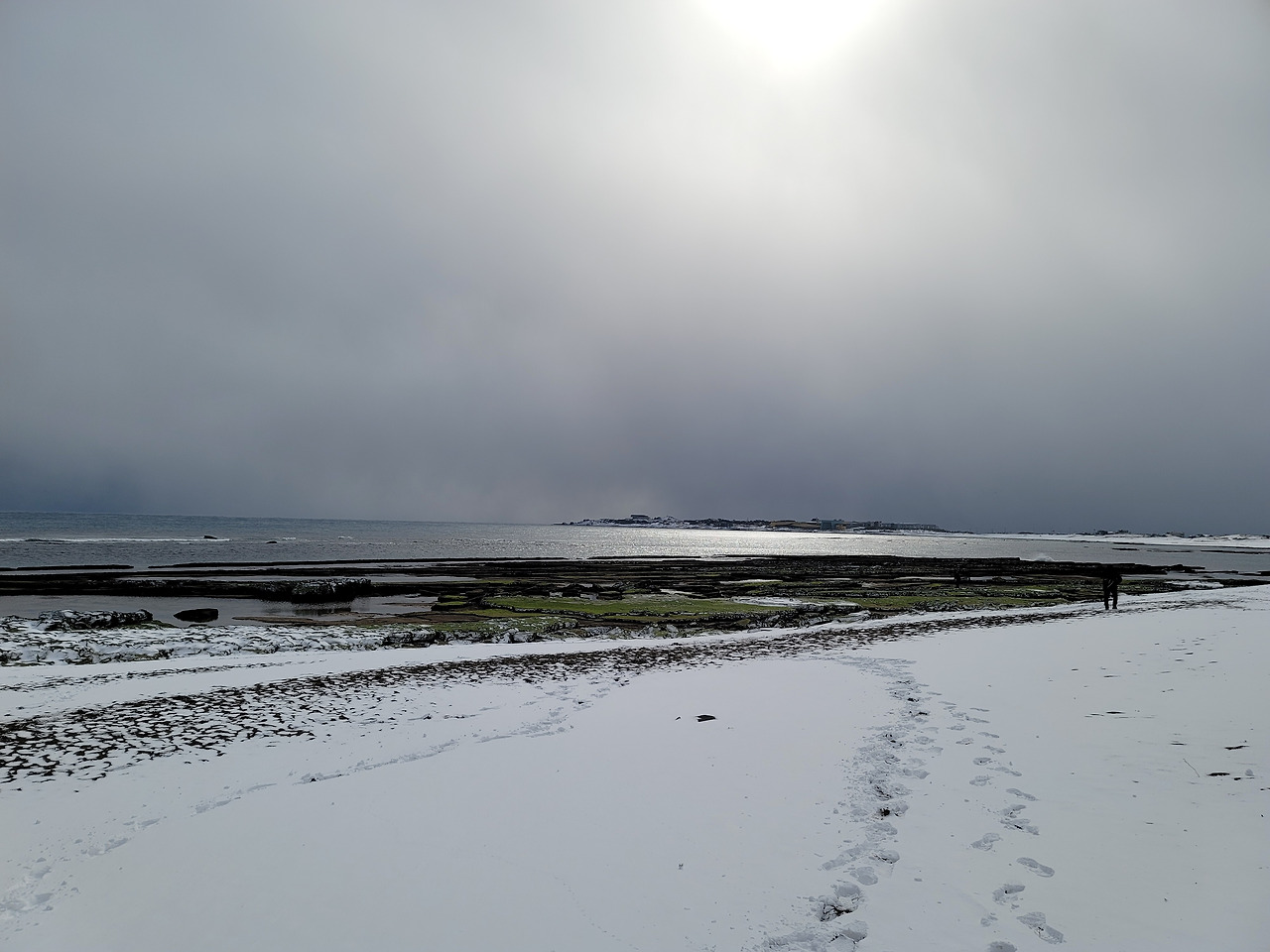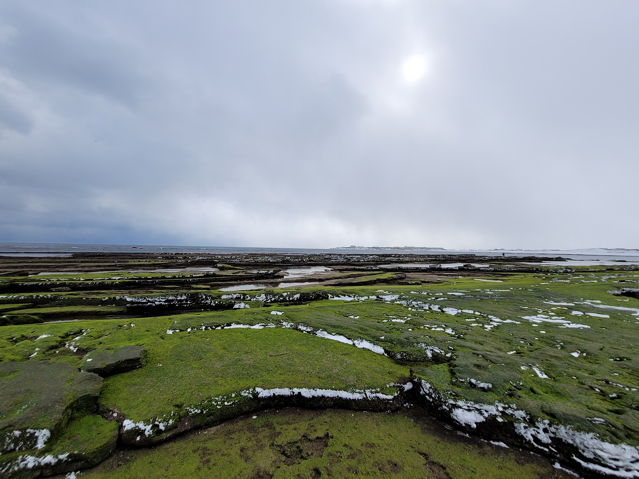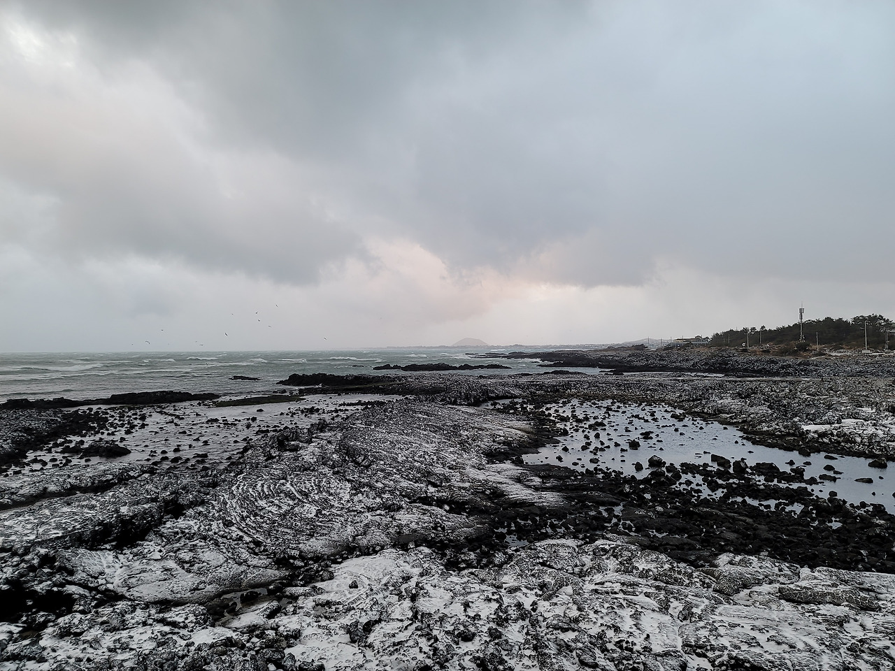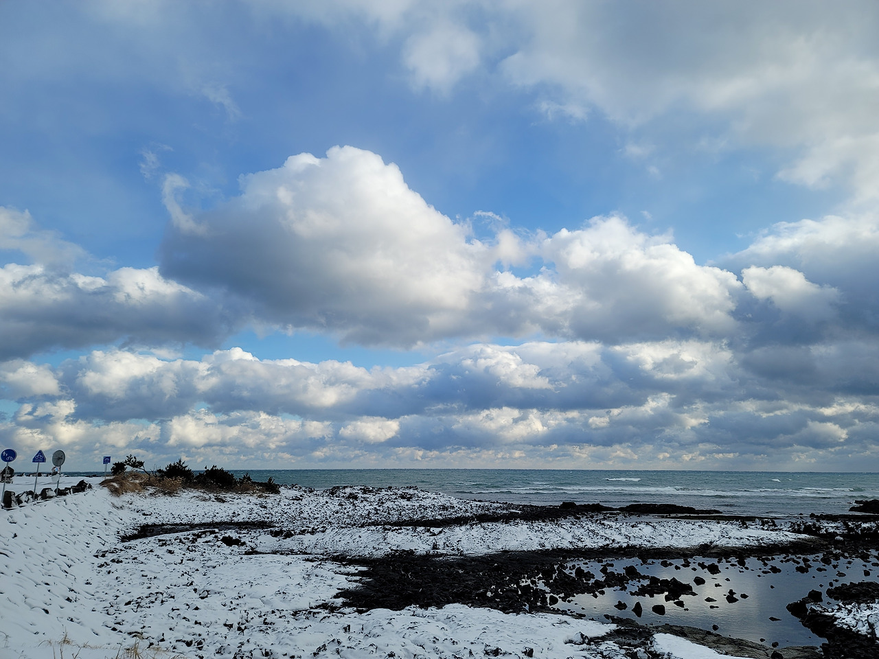 넷째날 우리는 제주도 서쪽의 비양도를 탐방하기로 했다. 동쪽 끝에서 서쪽 끝까지 간다. 길은 눈으로 덮여 엉금엉금 가야 했다. 가끔 길에서 노루를 발견하기도 했다. 목장을 지날 때면 몇 마리씩 모여서 서 있는 말떼도 보고... 한림항으로 가는 도중에 배가 뜨는지 확인해보니 결항이라 해서 한경면의 엉알해변으로 목적지를 바꾸었다. 출발한 지 거의 4시간만에 엉알해안에 이를 수 있었다.