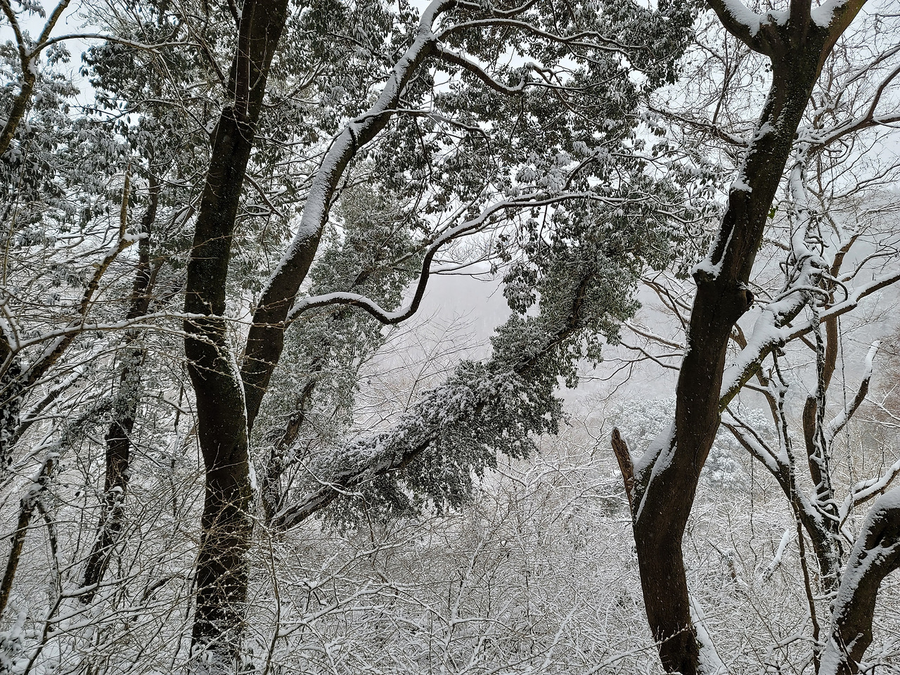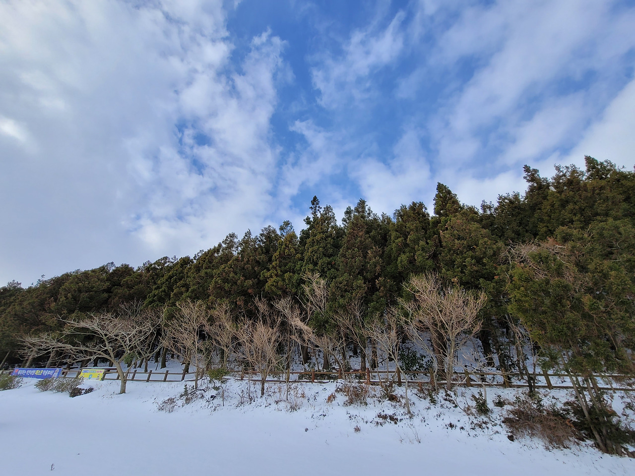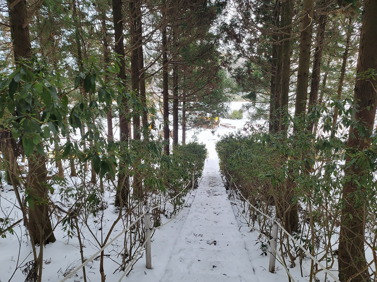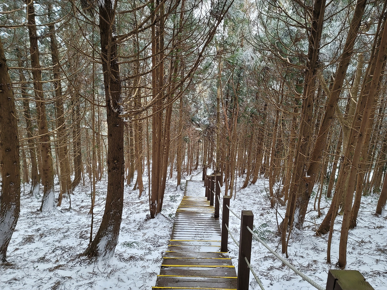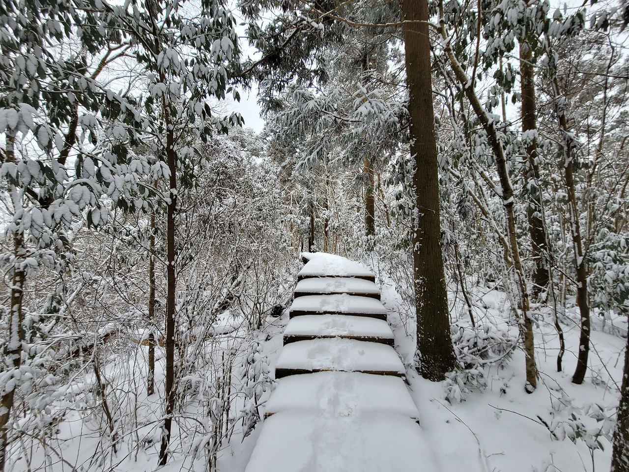 일행 넷은 차를 몰고 1,100고지에 이른 다음 잠시 쉬었다가 영실로 향했다. 주차장에 차를 세워두고 아이젠을 장착한 뒤 뚜벅뚜벅 영실 탐방안내소로 걷기 시작했다. 1.5km 떨어진 탐방안내소까지도 은근히 멀었다. 11시까지만 입장이 허용되었고 입구를 통과한 게 그 무렵이었다. 숲속길로 들어섰다. 내 위에 놓인 다리를 몇 개 건너니 가파른 경사가 시작됐다. 아이젠이 없이는 도저히 올라갈 수 없는 길이었다.