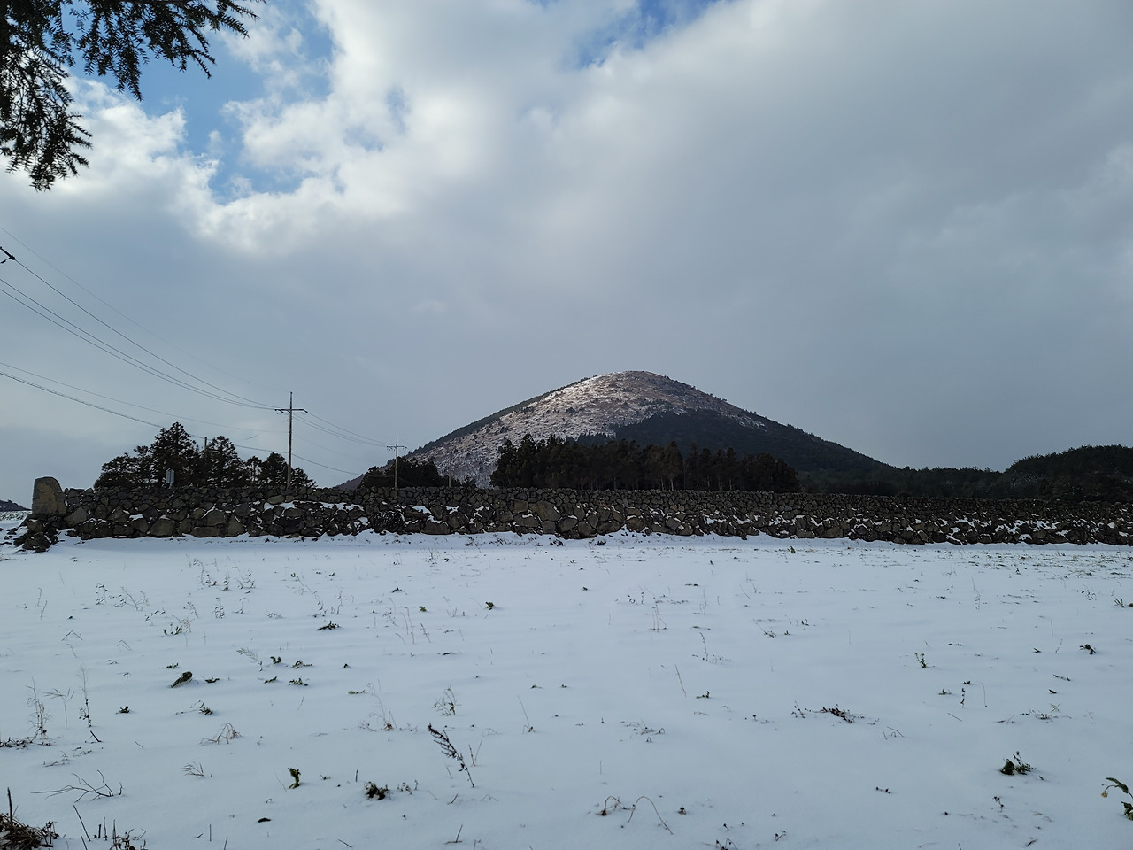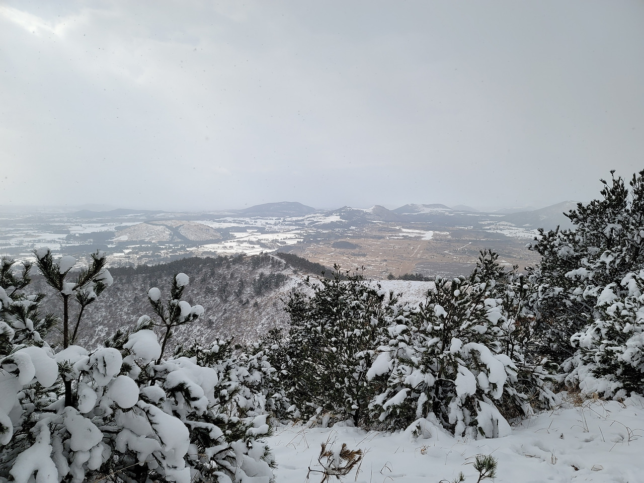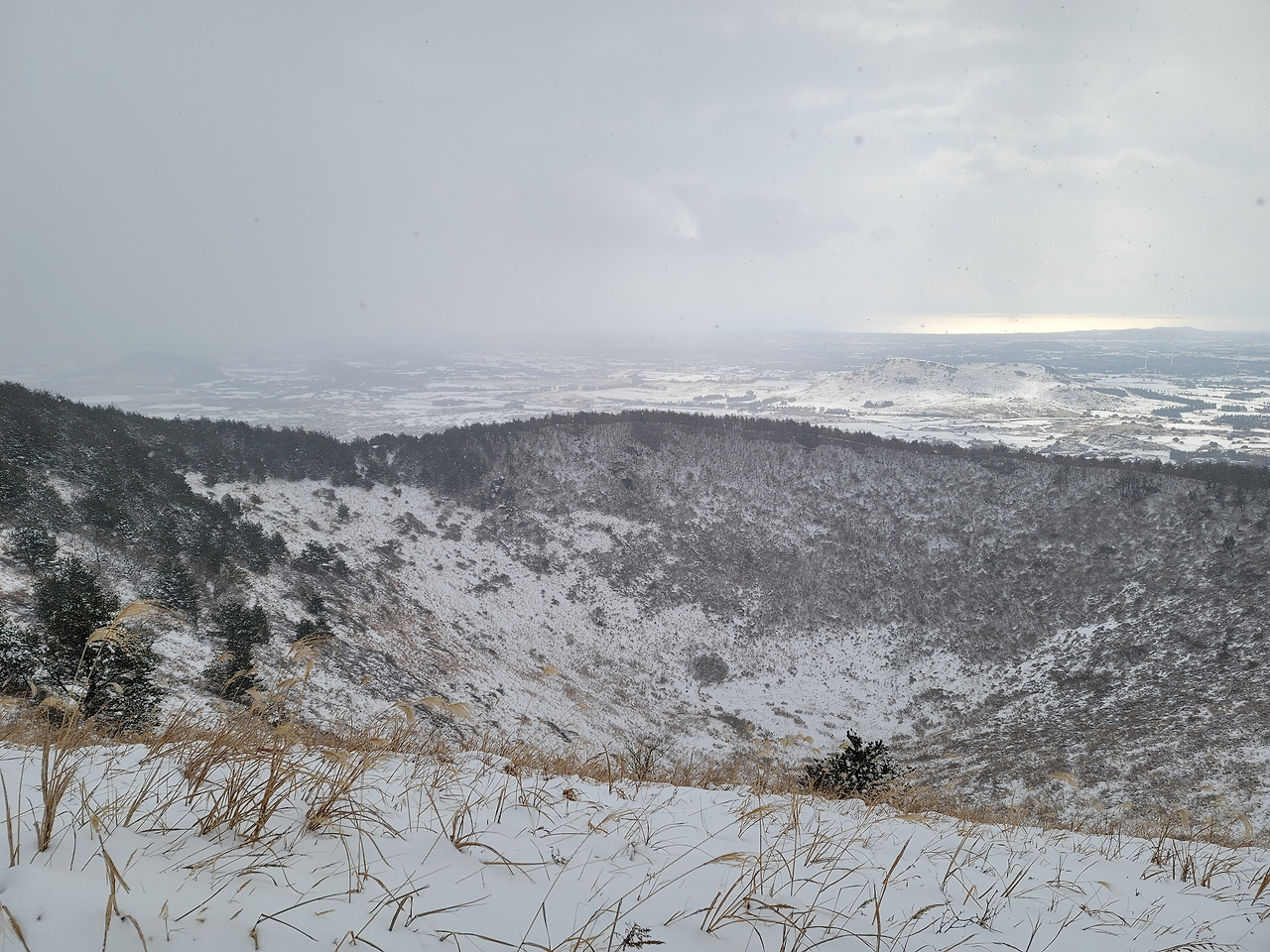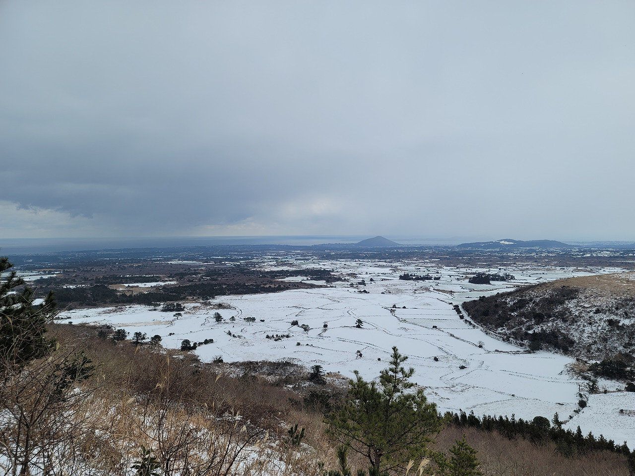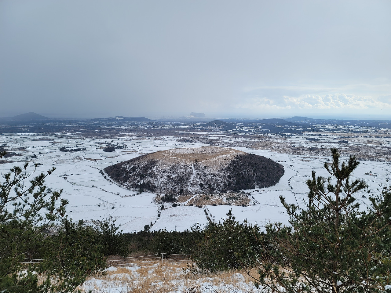 제주도 여행 5일차인 마지막날 우리는 다랑쉬오름으로 향했다. 그곳은 비자림에서 가까웠고 역시 길에는 눈이 가득 쌓여 있어 조심조심 접근해야 했다. 주차장에 차를 세워 놓고 정상을 향해 난 길을 걸어오르기 시작했다. 30분만에 산 둘레길에 올라섰고 정상은 조금만 더 가면 있었다. 날이 흐려 일출봉이며 우도 등이 선명하게 보이진 않았다. 다만 다랑쉬오름의 분화구는 잘 내려다보였다. 분화구 둘레에 난 길을 한 바퀴 걸었다. 거의 한 시간 걸렸던 거 같다. 해발 382m의 다랑쉬오름에서 동쪽으로 내려다보이는 작은 오름이 하나 있었으니 그것이 바로 아끈다랑쉬오름이었다.