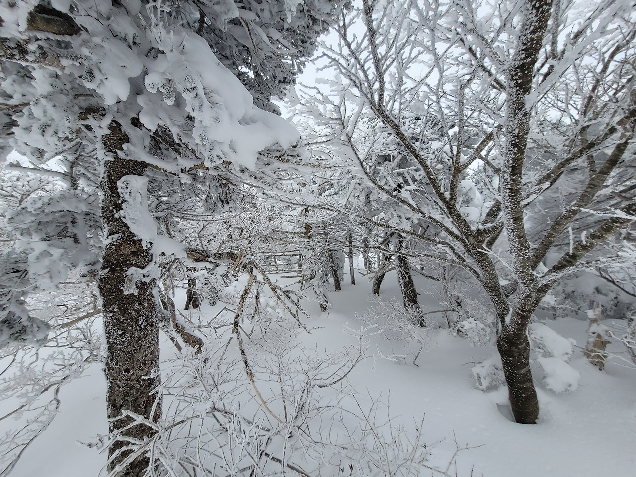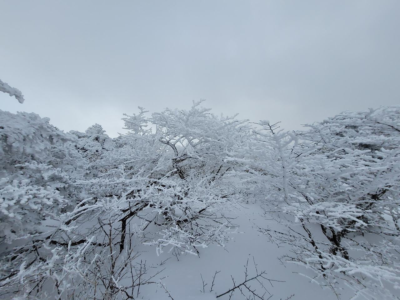 내려오면서 스마트폰의 카메라 셔터를 끝없이 눌러댔다. 도저히 찍지 않고는 지날 수 없는 광경들이 속속 이어졌다. 일행 세 명은 이미 저만치 앞에 내려가고 있었지만 난 누르고 또 눌렀다. 나무에 입혀진 눈의 모양이 어느 하나 같은 게 없었다. 그러다 그만 스마트폰의 배터리가 방전되었음을 발견했다. 이런 낭패가! 하지만 이제 남은 길이 멀지 않아 아쉬움을 달래기로 했다. 그런데 그게 아니었다. 병풍바위가 기다리고 있었다. 거의 90도 가까운 병풍바위의 모습을 담을 수가 없었던 것이다. 그 위에서 너무나 많은 사진과 동영상을 찍다보니 배터리가 급격히 소진됐던 거다. 아쉬움을 한껏 안고 터덜터덜 탐방안내소로 내려와야 했다.