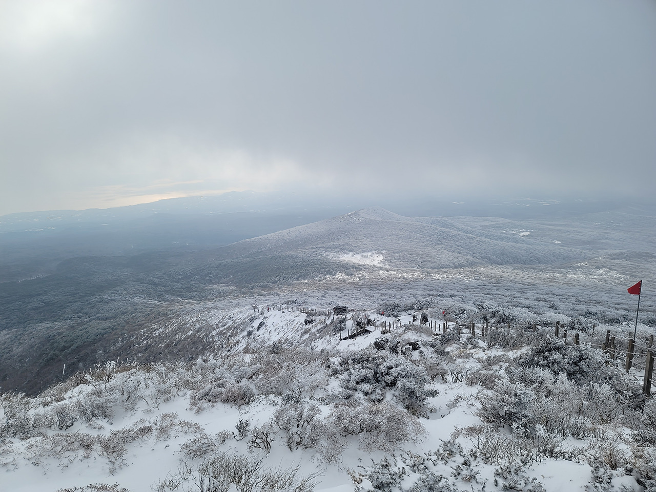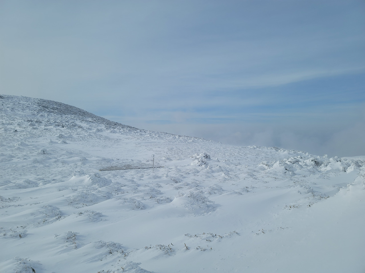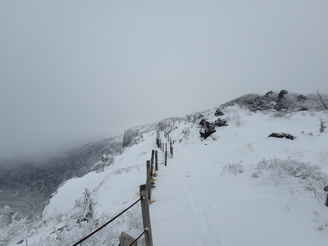 눈이 끝없이 쏟아져 내렸다. 시계는 제로여서 도무지 먼 풍경을 알 수 없었다. 1시간쯤 걸었을까 길이 갑자기 평평해졌다. 탁 트인 평원이 나왔다. 그리고 얼마 가지 않아 윗세오름 대피소였다. 이미 많은 등산객들이 그곳에 와서 몸을 녹이고 있었다. 컵라면을 먹는 사람도 많았고... 우리도 준비해온 간식을 꺼내 먹은 뒤 밖으로 나오니 위쪽으론 한라산 정상이 손에 잡힐 듯했고 사방으로 설원이 펼쳐져 있었다. 이런 장관을 본 것은 몇 십 년만인가!
