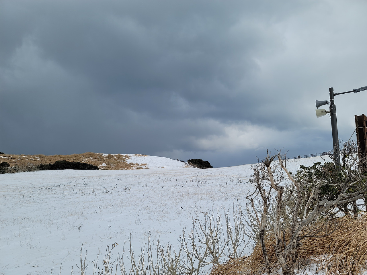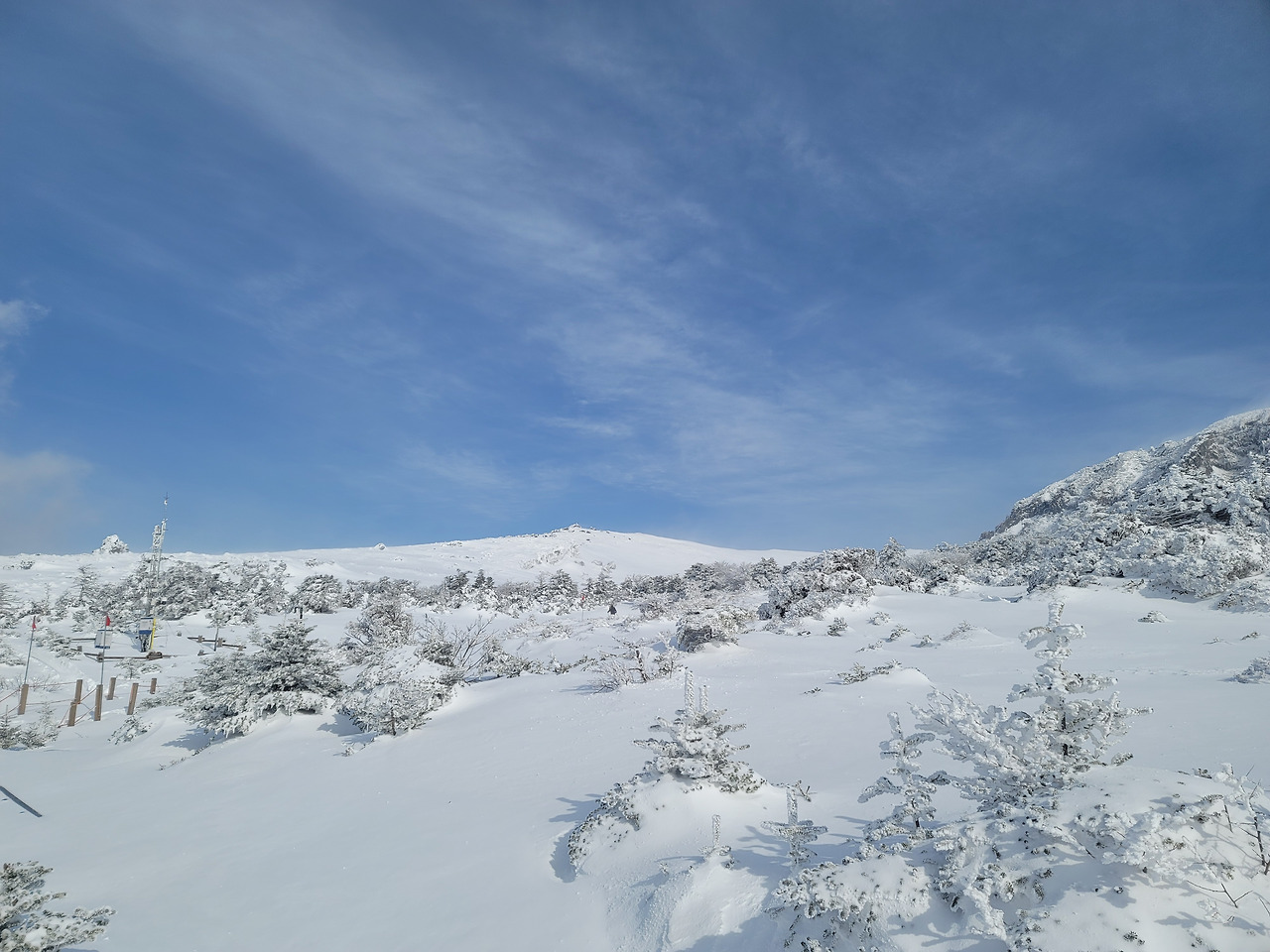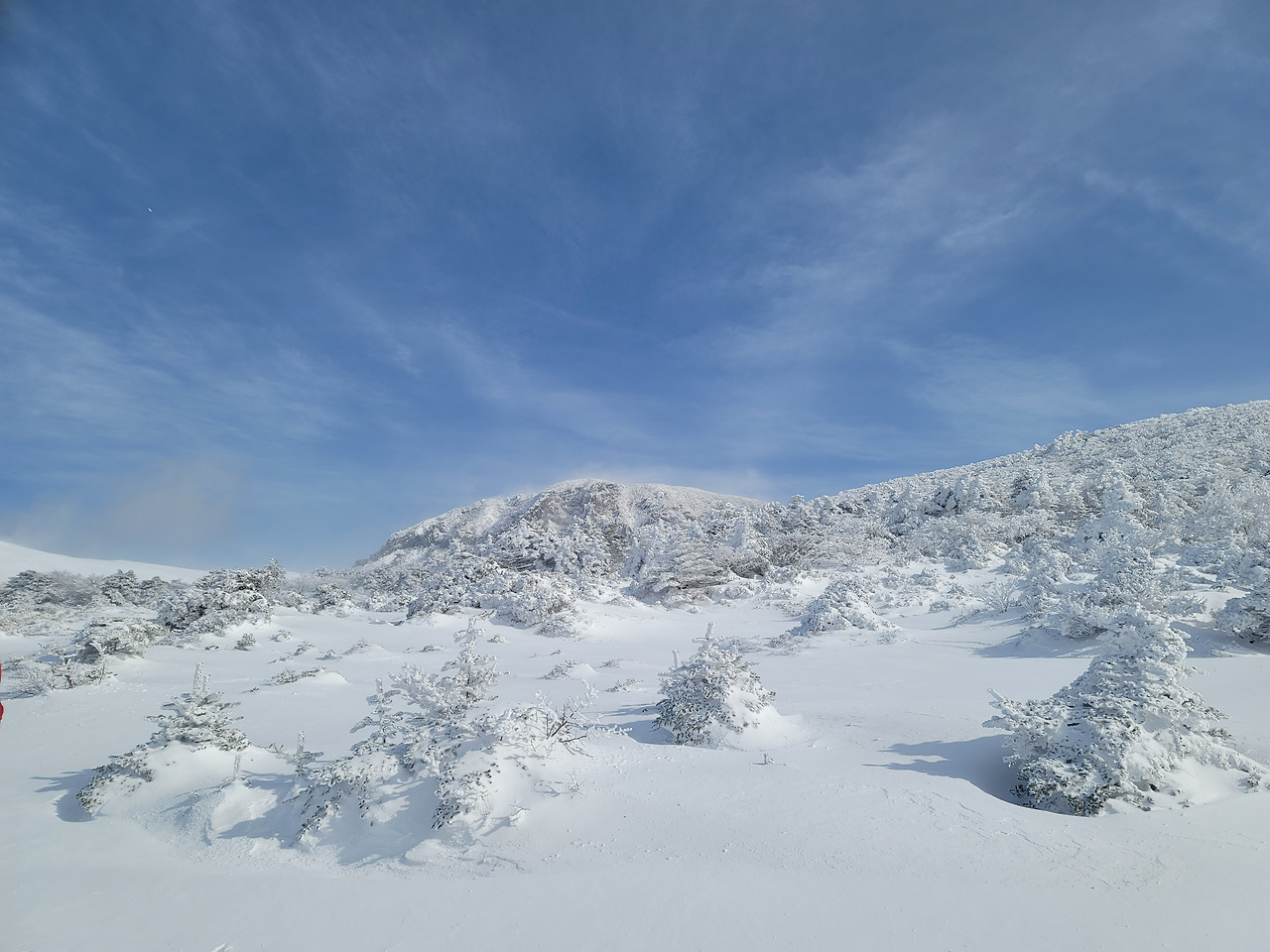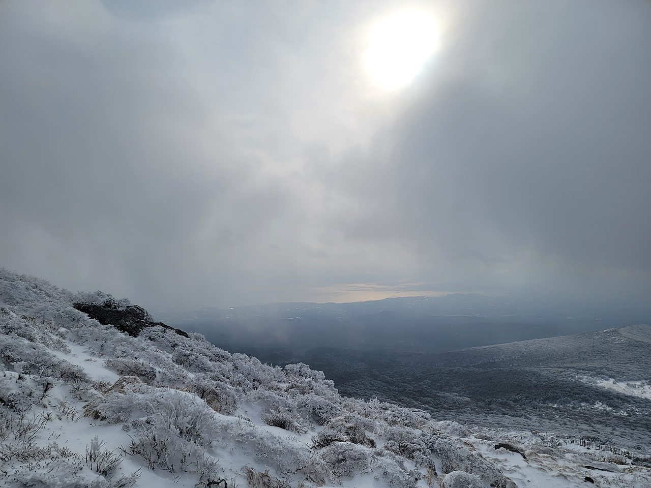 눈이 끝없이 쏟아져 내렸다. 시계는 제로여서 도무지 먼 풍경을 알 수 없었다. 1시간쯤 걸었을까 길이 갑자기 평평해졌다. 탁 트인 평원이 나왔다. 그리고 얼마 가지 않아 윗세오름 대피소였다. 이미 많은 등산객들이 그곳에 와서 몸을 녹이고 있었다. 컵라면을 먹는 사람도 많았고... 우리도 준비해온 간식을 꺼내 먹은 뒤 밖으로 나오니 위쪽으론 한라산 정상이 손에 잡힐 듯했고 사방으로 설원이 펼쳐져 있었다. 이런 장관을 본 것은 몇 십 년만인가!