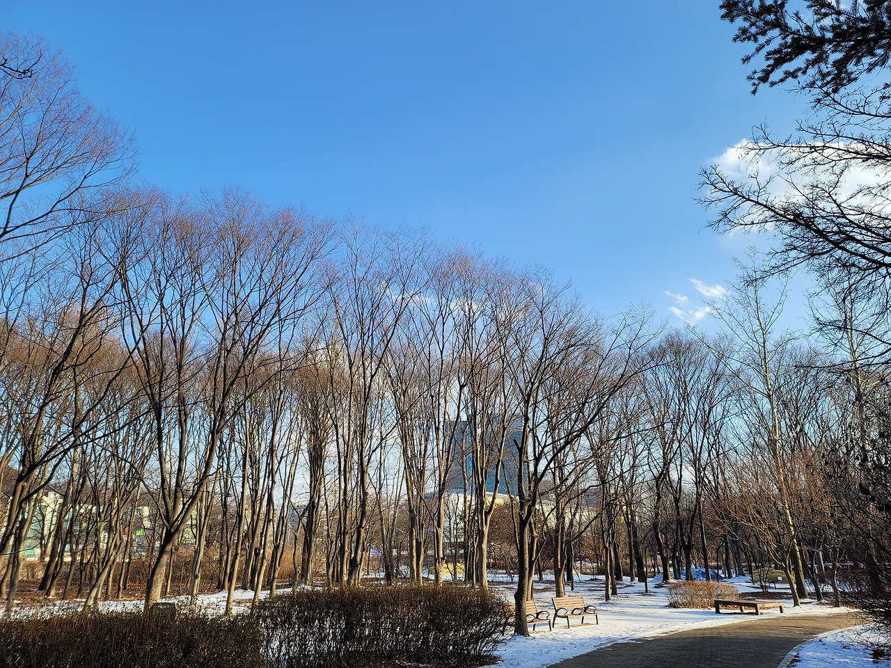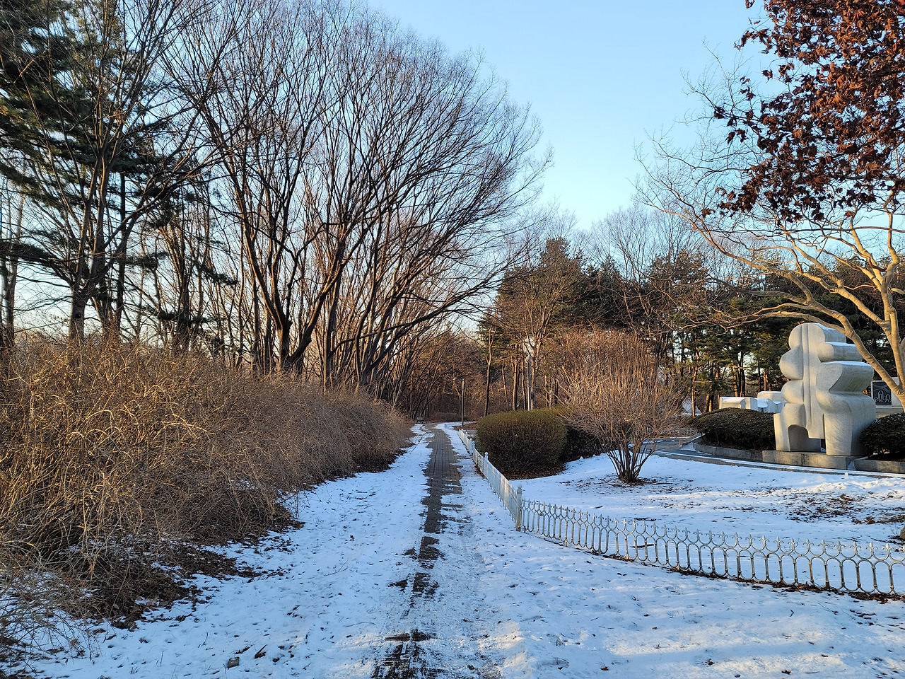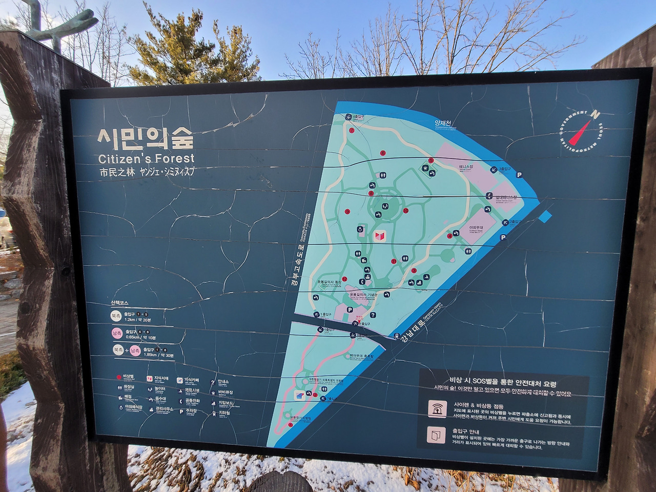 양재시민의숲은 86아시안게임, 88서울올림픽을 앞두고 공원을 조성하기 시작해 1986년에 개장했다고 한다. 경부고속도로가 바로 옆을 지나는데 숲이 여간 울창하지 않다. 북쪽에는 테니스장이 있고 숲에는 여러 갈래로 길이 나 있고 바비큐장, 야외 예식장도 있다. 아름드리나무들이 하늘을 찌를 듯 높이 치솟아 있다. 경부고속도로가 바로 옆에 있어 그 차들이 내뿜는 소음만 아니라면 더 없이 근사한 숲이다. 옥에티다.