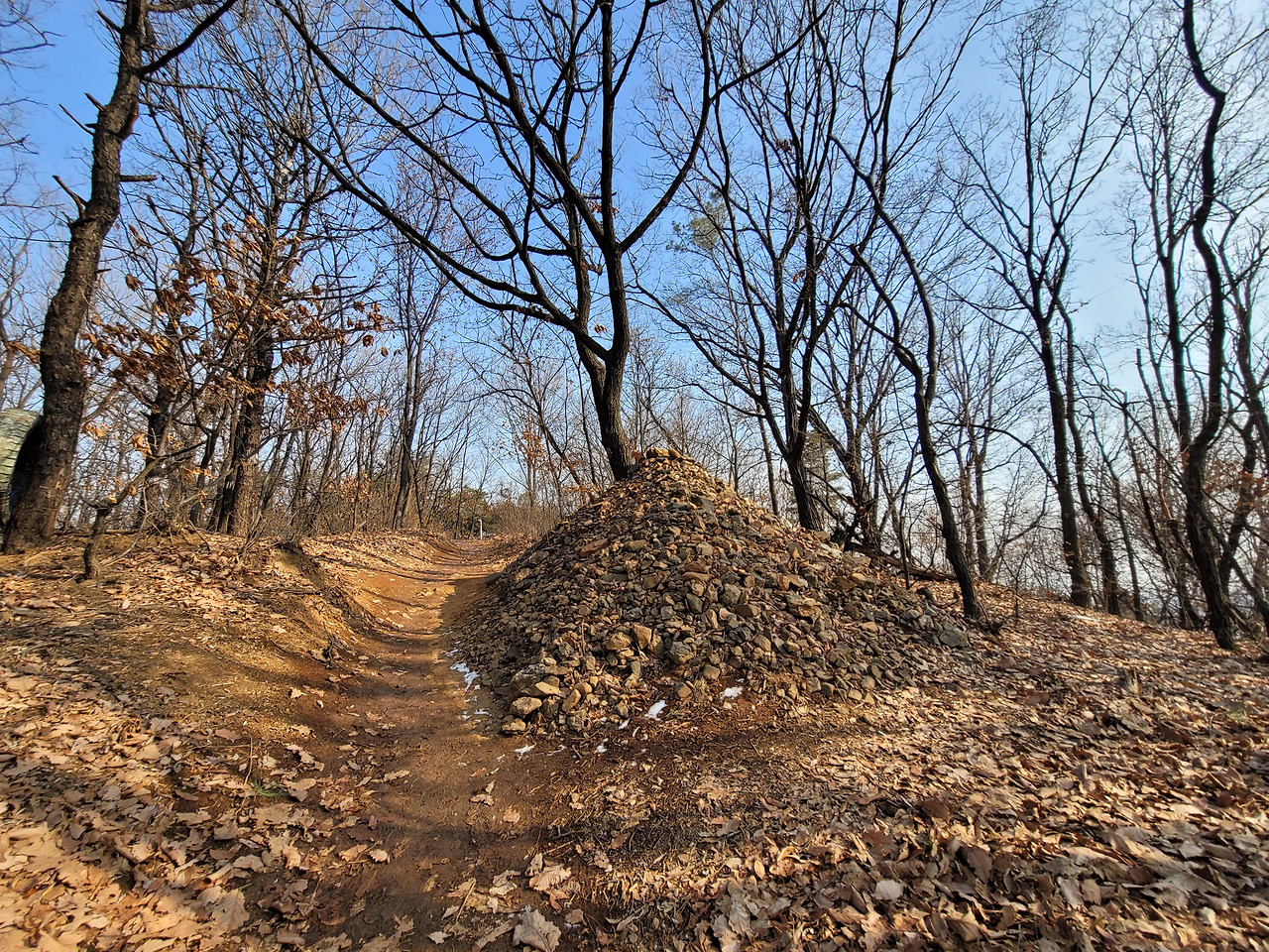 국기봉에서 북쪽으로 난 길이 양천둘레길이면서 부천의 향토유적숲길이다. 이 길은 까치울터널 위를 지난다. 국기봉에서 까치울너널 방향으로 가는 도중 동쪽에 거대한 밭이 산속에 있다. 신월자연텃밭농원이다. 이곳을 지나면 절골과 능고개가 있다. 절골의 유래를 적어 놓은 안내판의 설명이 재미있다. 옛날에 이곳에 절이 있었는데 절에 빈대가 너무 많이 중이 절을 버리고 도망갔다는 것이다. 절골에서 능고개를 지나자마자 까치울터널 위이고 이곳에 공원이 조성되어 있다.