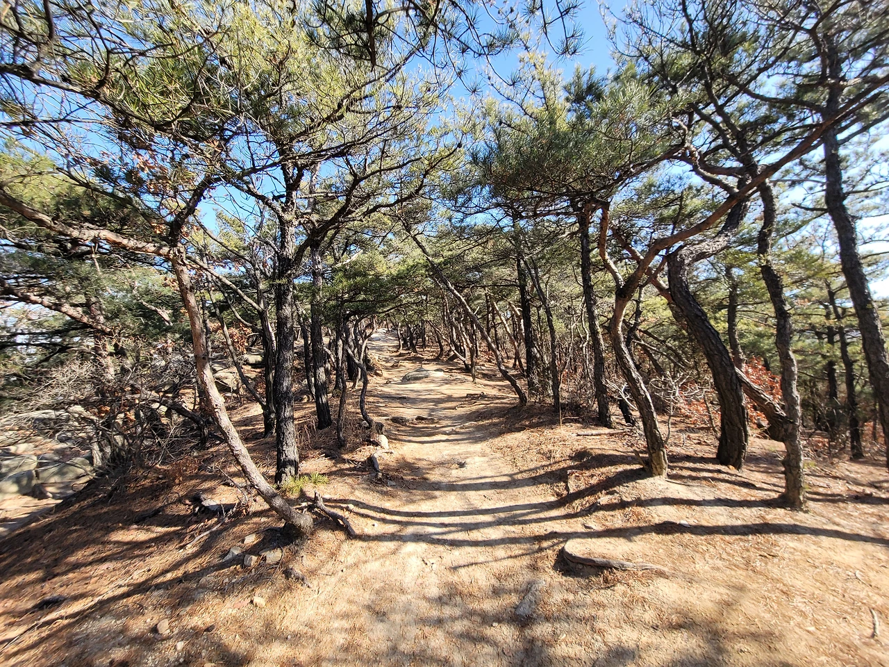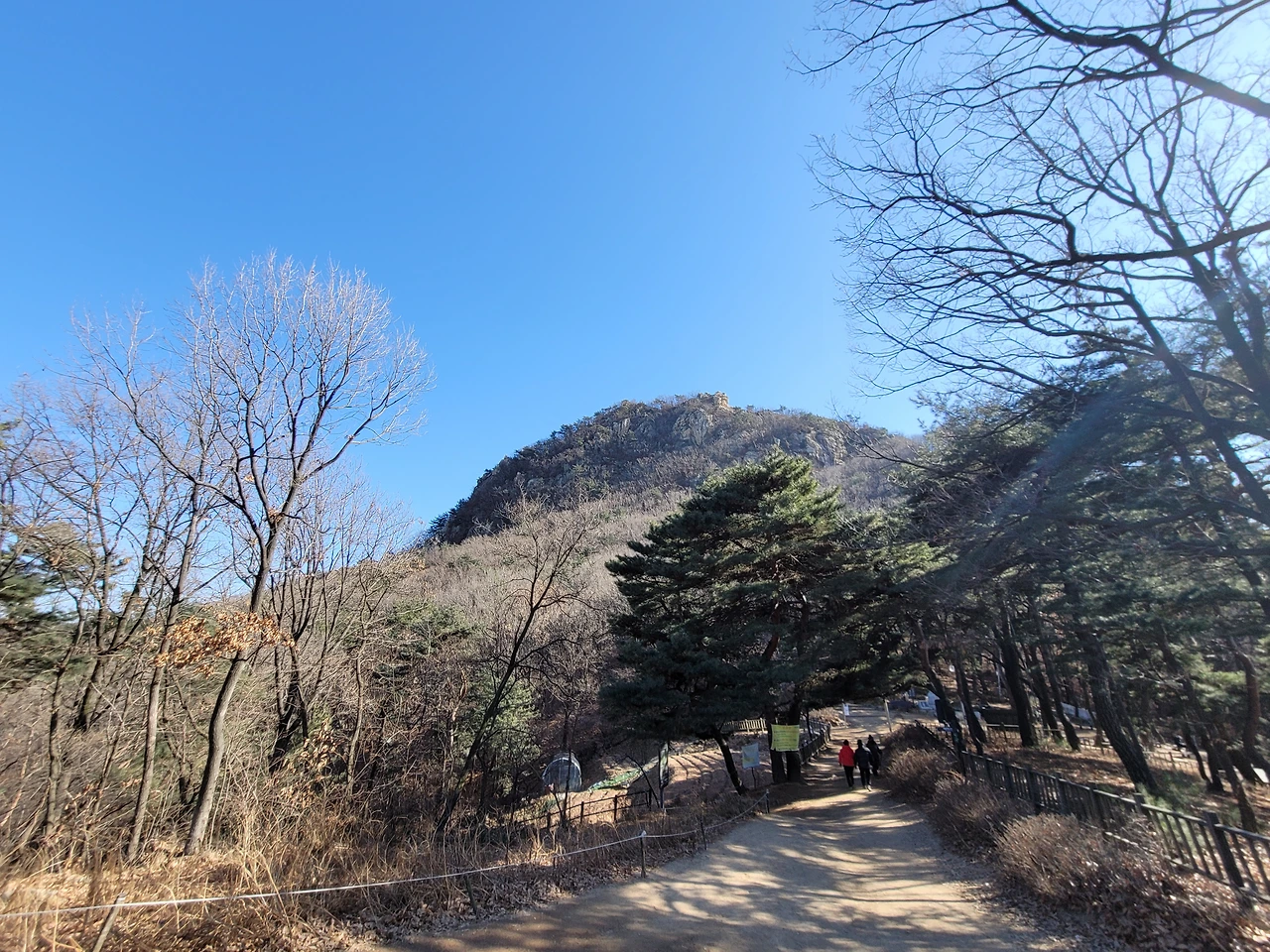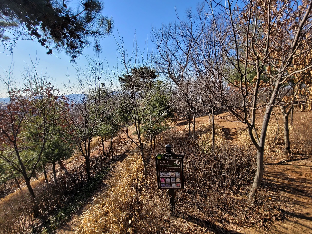 호암산 정상에서 호압사로 내려가는 길은 경사가 매우 가파르다. 처음에는 바윗길이 이어지다가 데크 계단길이 나온다. 물론 데크길 옆에는 원래 있었던 등산로가 남아 있어 그 길을 이용하는 사람들도 있다. 내리막을 다 내려오면 호압사이다. 호압사는 태조 이성계의 꿈에 호랑이 모습의 괴물이 나타났고 호랑이 기세를 누르기 위해 왕사 무학대사를 시켜 지었다고 한다. 유서 깊은 사찰이다.