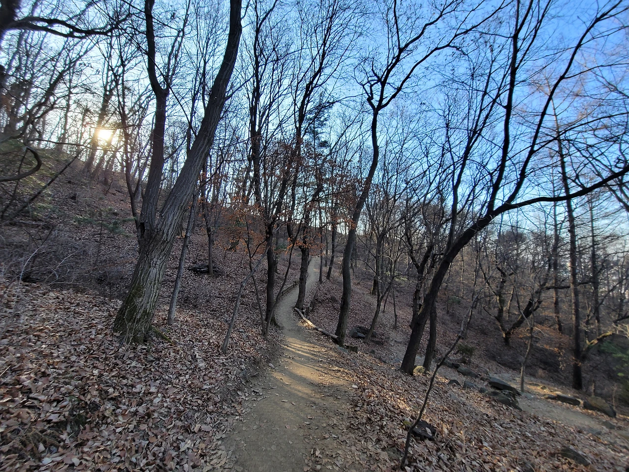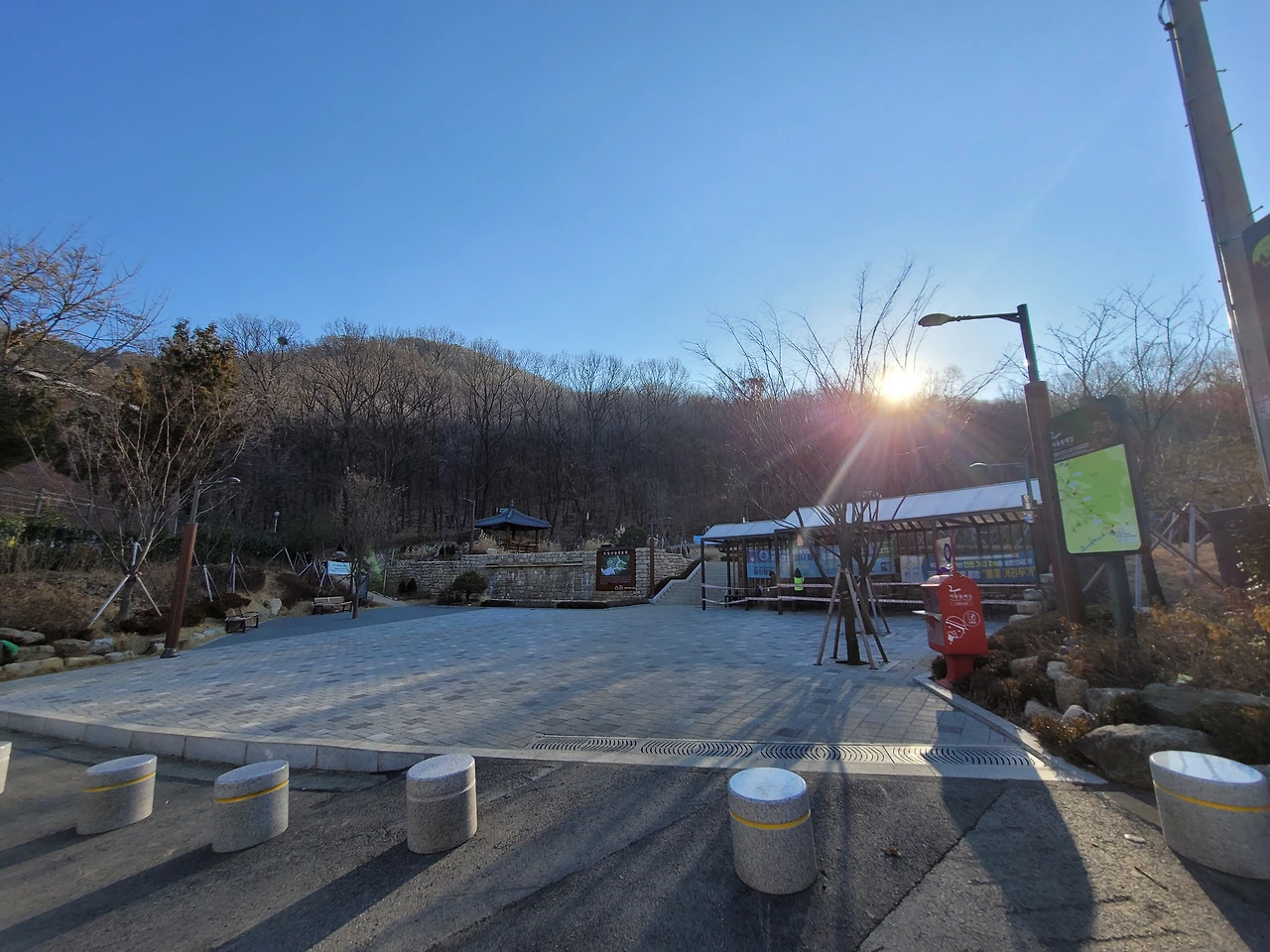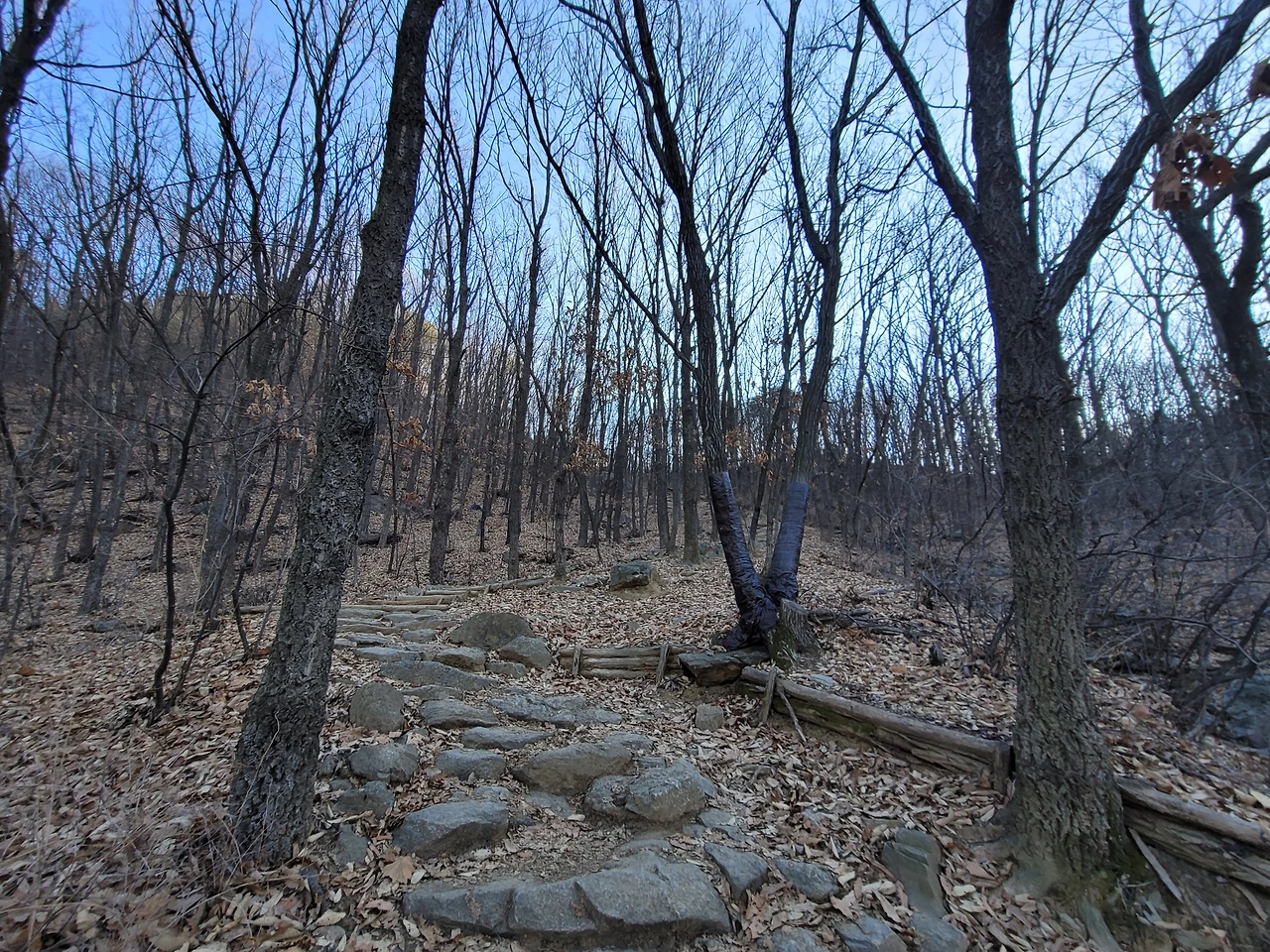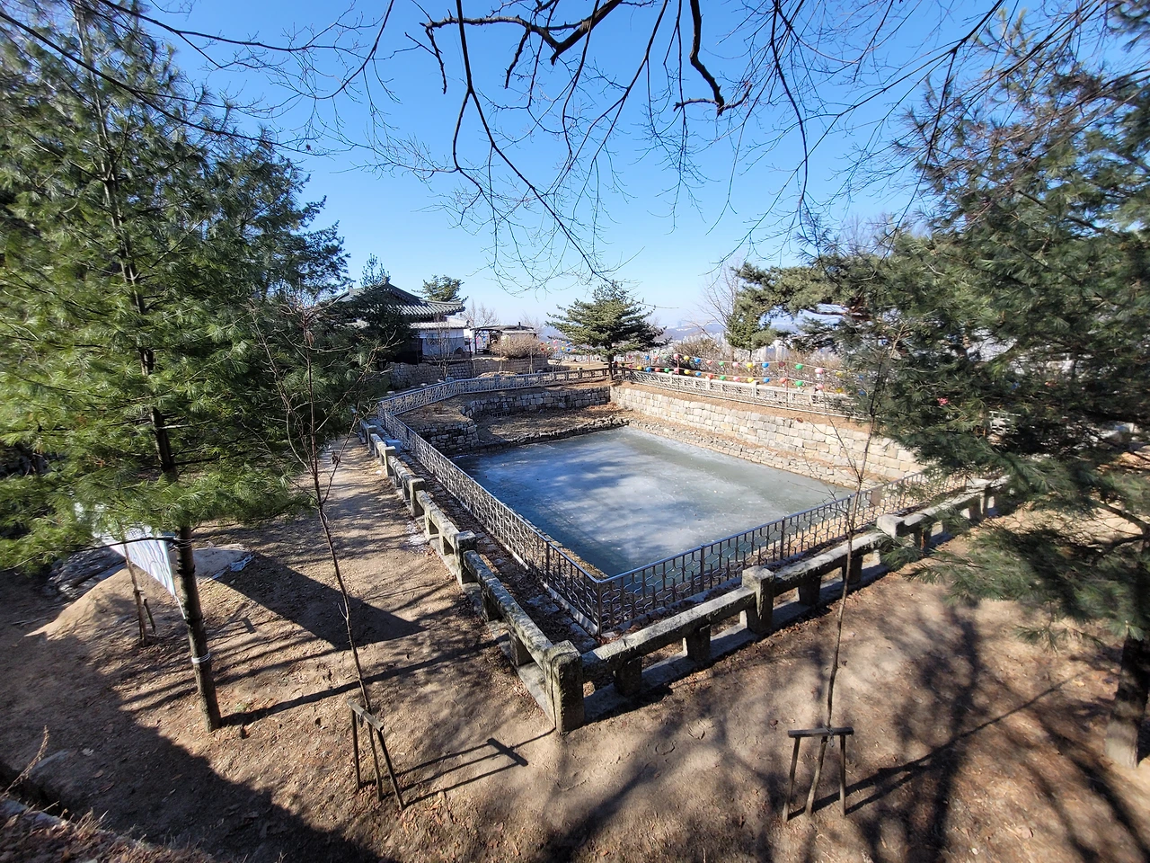 호암산 정상에서 호압사로 내려가는 길은 경사가 매우 가파르다. 처음에는 바윗길이 이어지다가 데크 계단길이 나온다. 물론 데크길 옆에는 원래 있었던 등산로가 남아 있어 그 길을 이용하는 사람들도 있다. 내리막을 다 내려오면 호압사이다. 호압사는 태조 이성계의 꿈에 호랑이 모습의 괴물이 나타났고 호랑이 기세를 누르기 위해 왕사 무학대사를 시켜 지었다고 한다. 유서 깊은 사찰이다.