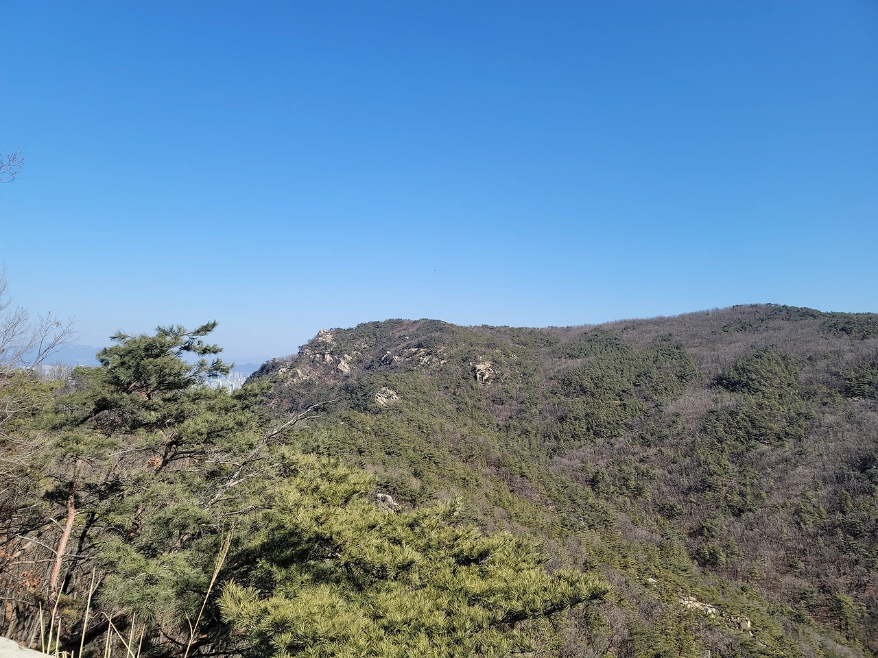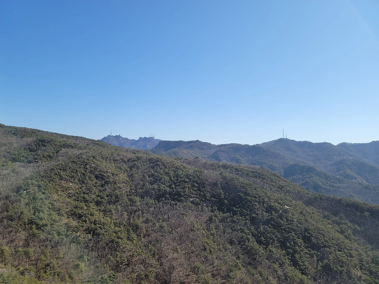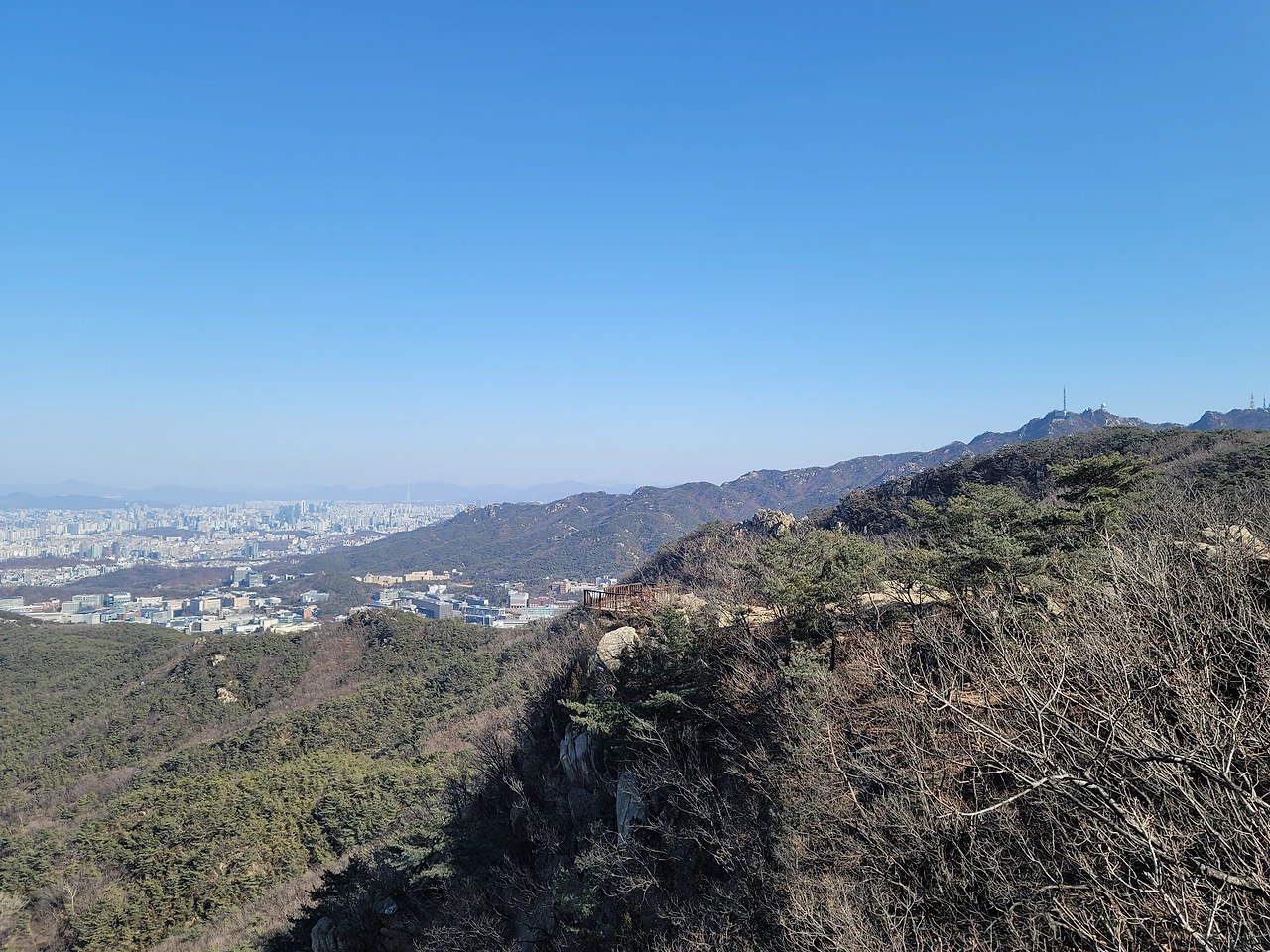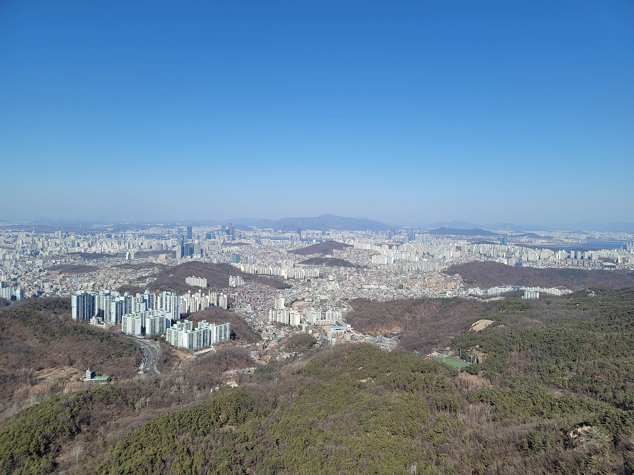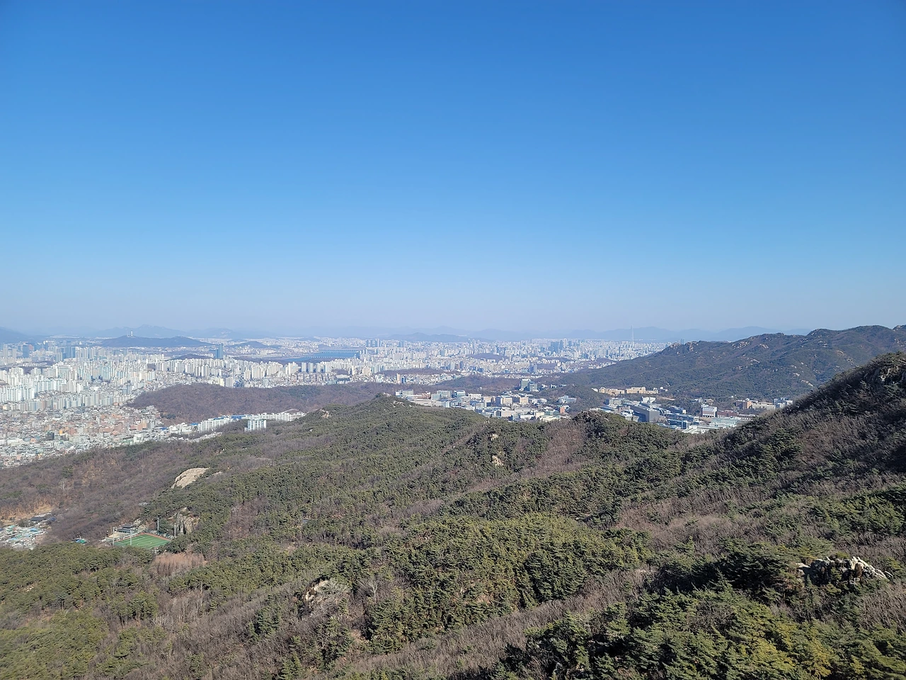 호암산 정상에서는 남쪽 방향은 안 보이고 북쪽, 동쪽, 서쪽은 전망이 탁 트여 있다. 전망이 참으로 장관이다. 멀리 보이는 북한산이 낮게 보이는 것은 호암산이 꽤나 높다는 뜻일 것이다. 해발 800m대의 북한산이 낮게 보이니 더 가까이 있는 남산이 아주 낮게 보이는 것은 당연하다. 보라매공원 옆의 국사봉은 한참 아래로 보인다. 바로 산 아래로 삼성동 방향으로 뻗은 산자락은 숲이 대단히 울창하다. 저 멀리 산자락 끝에 잔디 깔린 운동장이 보이는데 관악제2구민운동장이다.