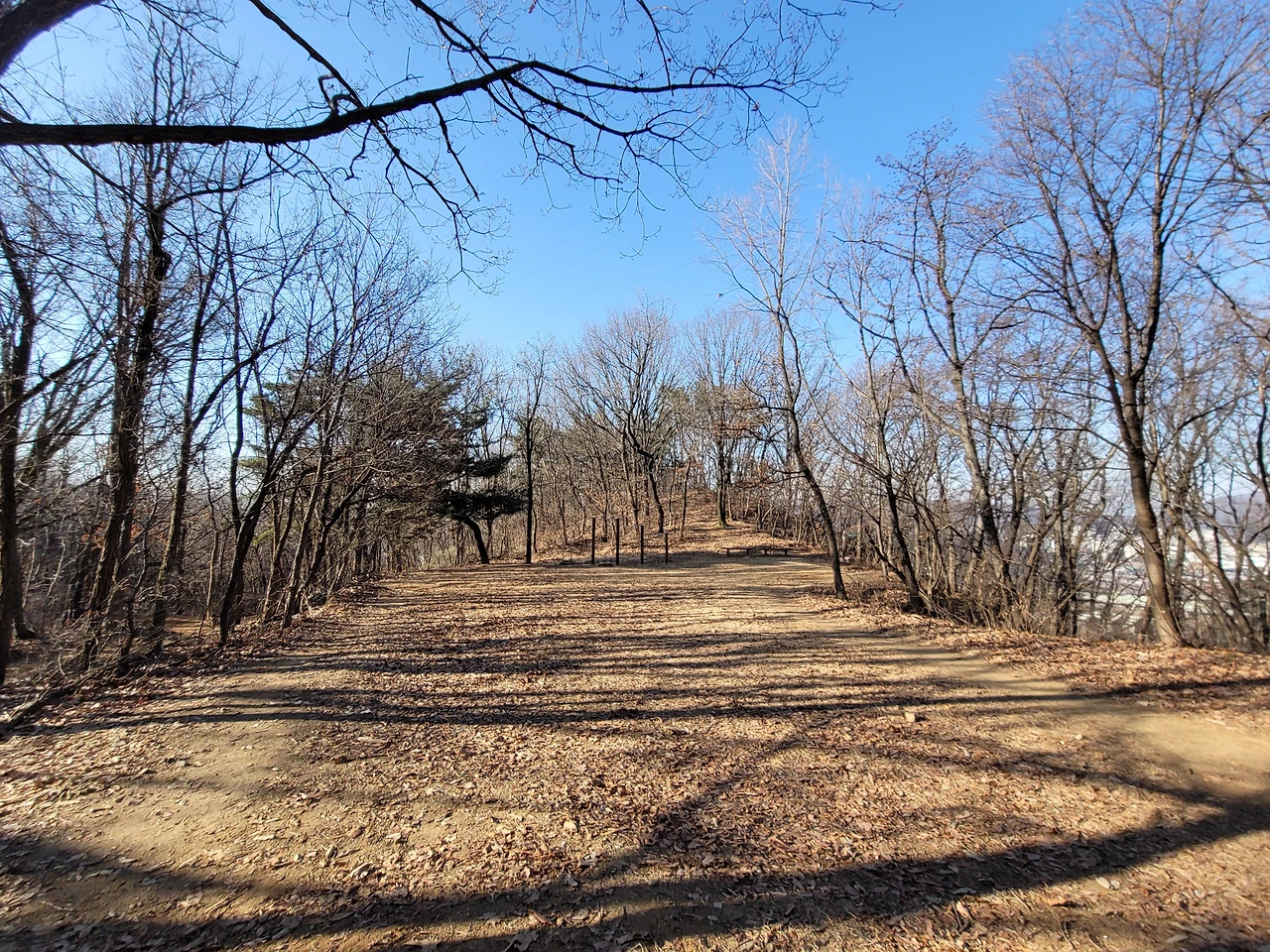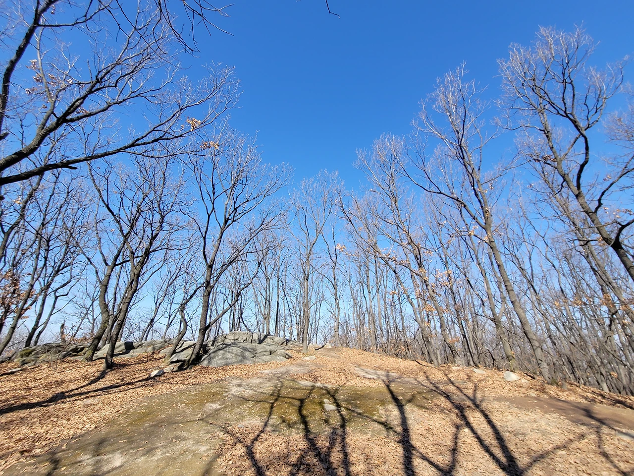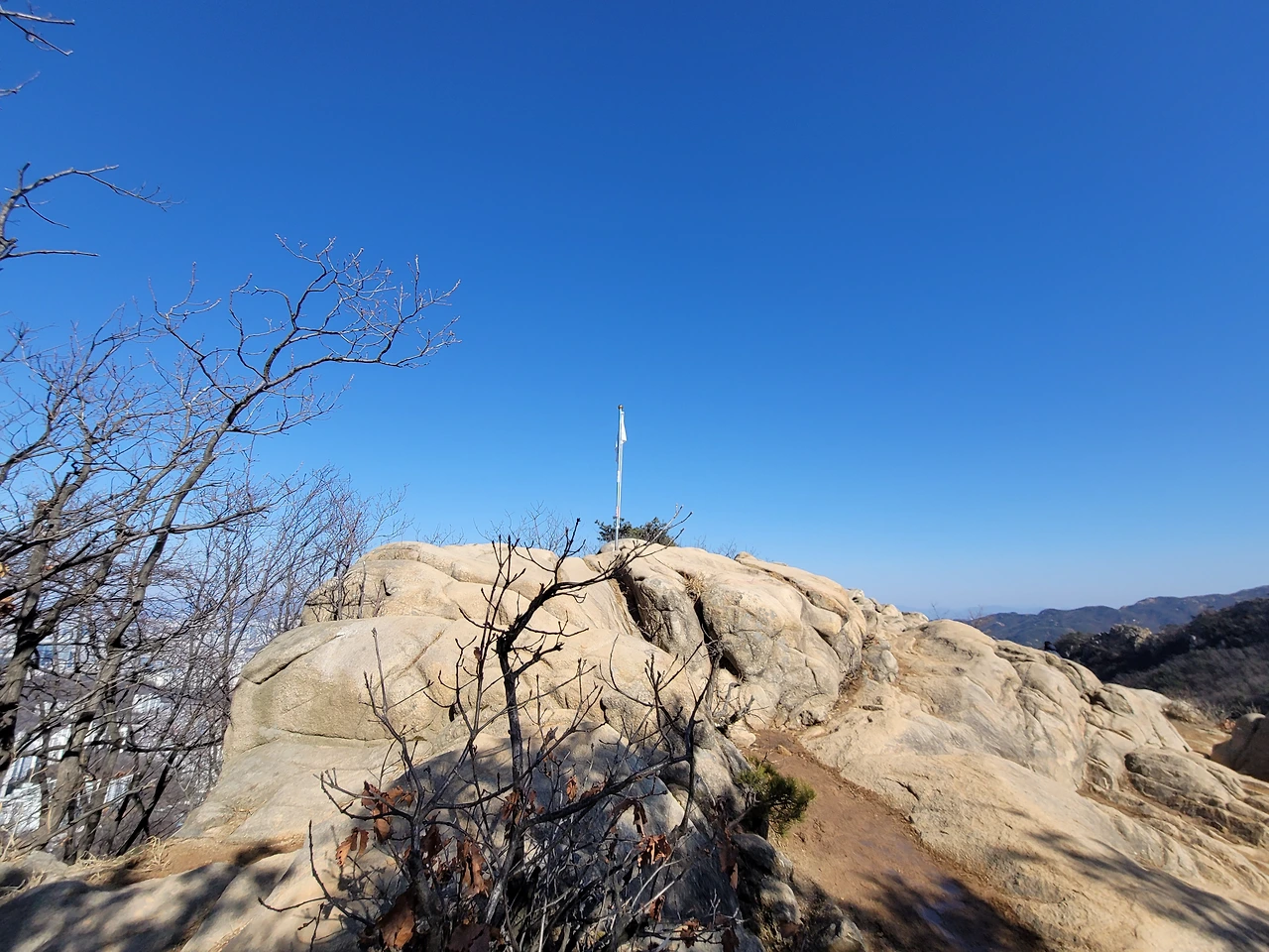 불영암을 지나 능선길을 좀 더 가면 갈래길이 나타난다. 호압사로 내려가는 길, 호암산 정상으로 올라가는 길, 삼성산과 관악산으로 가는 길이 갈라진다. 호암산 정상으로 향하는 길은 쉽게 잘 분간이 되지 않는다. 바위가 많은 경사진 지대여서 딱 하나의 길이 있지 않고 경사 지대 전체가 길이라 해도 과언이 아니다. 계속 올라가면 헬기장이 나타나고 바로 이어서 태극기가 펄럭이는데 민주동산국기대라 적혀 있다. 그리고 그 옆에 전망대가 있다. 호암산 정상이다.