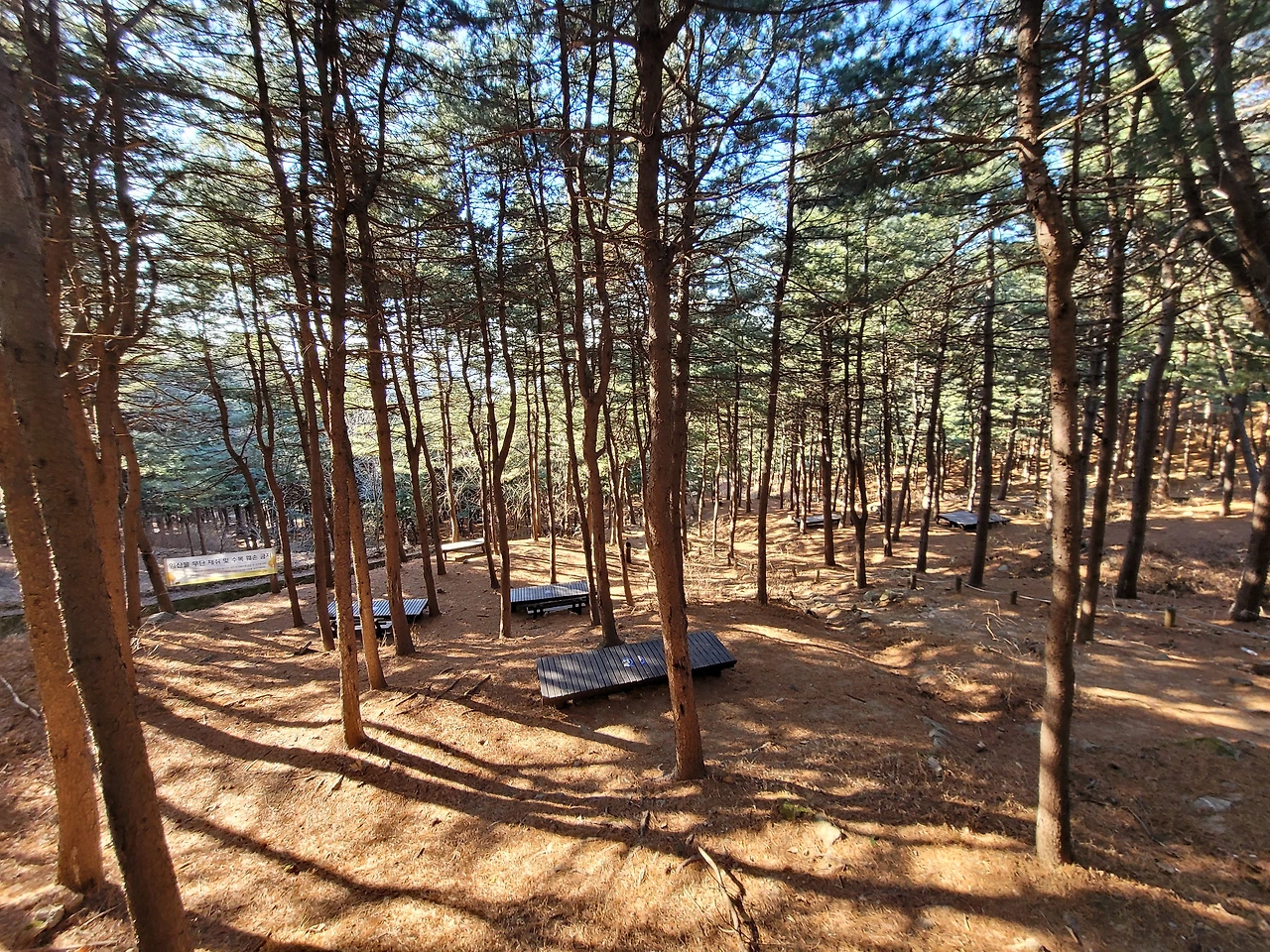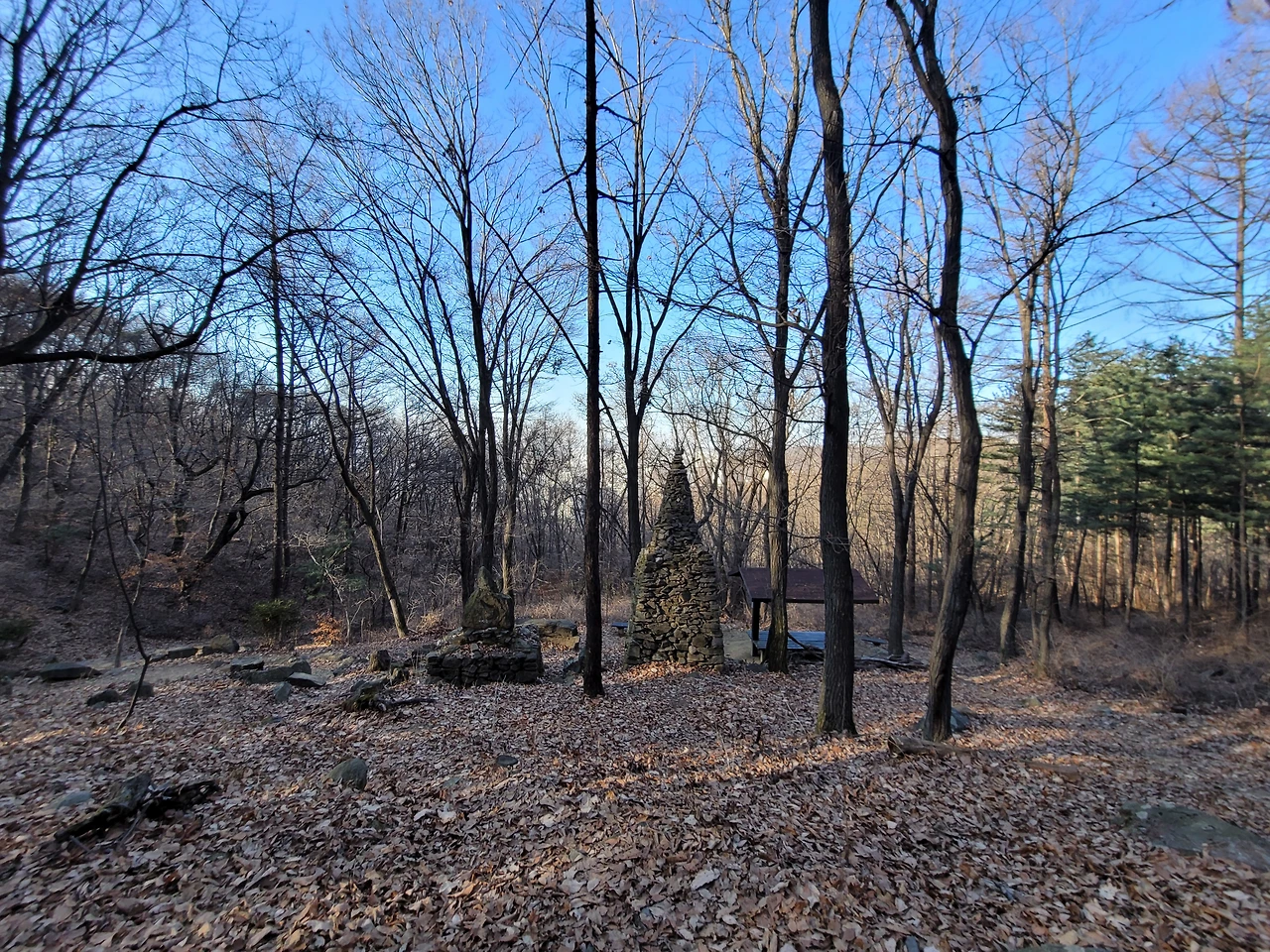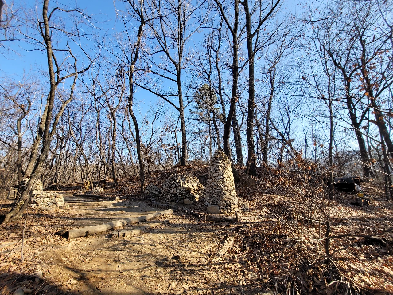 불영암을 지나 능선길을 좀 더 가면 갈래길이 나타난다. 호압사로 내려가는 길, 호암산 정상으로 올라가는 길, 삼성산과 관악산으로 가는 길이 갈라진다. 호암산 정상으로 향하는 길은 쉽게 잘 분간이 되지 않는다. 바위가 많은 경사진 지대여서 딱 하나의 길이 있지 않고 경사 지대 전체가 길이라 해도 과언이 아니다. 계속 올라가면 헬기장이 나타나고 바로 이어서 태극기가 펄럭이는데 민주동산국기대라 적혀 있다. 그리고 그 옆에 전망대가 있다. 호암산 정상이다.