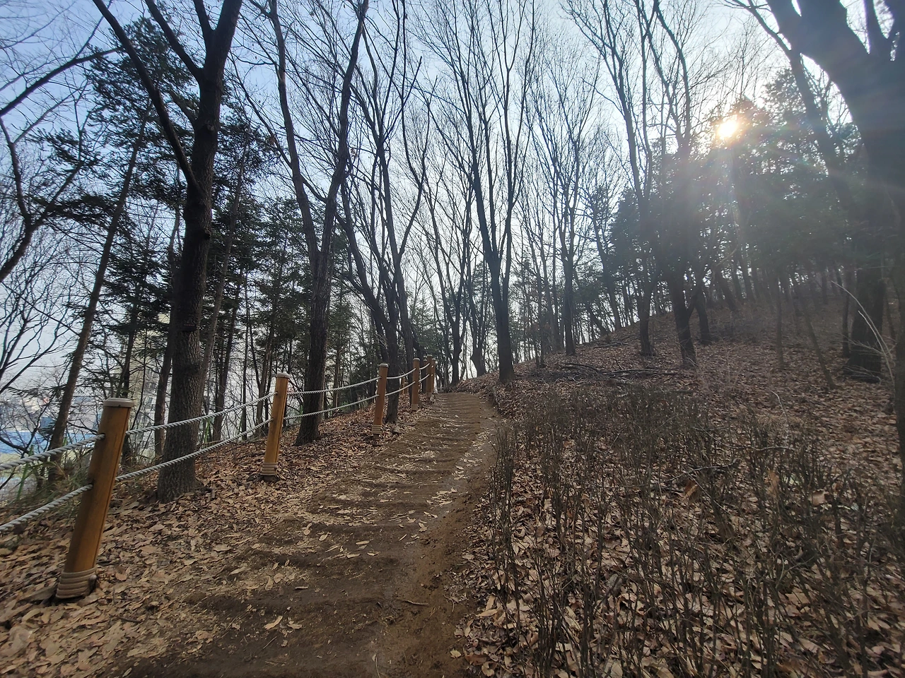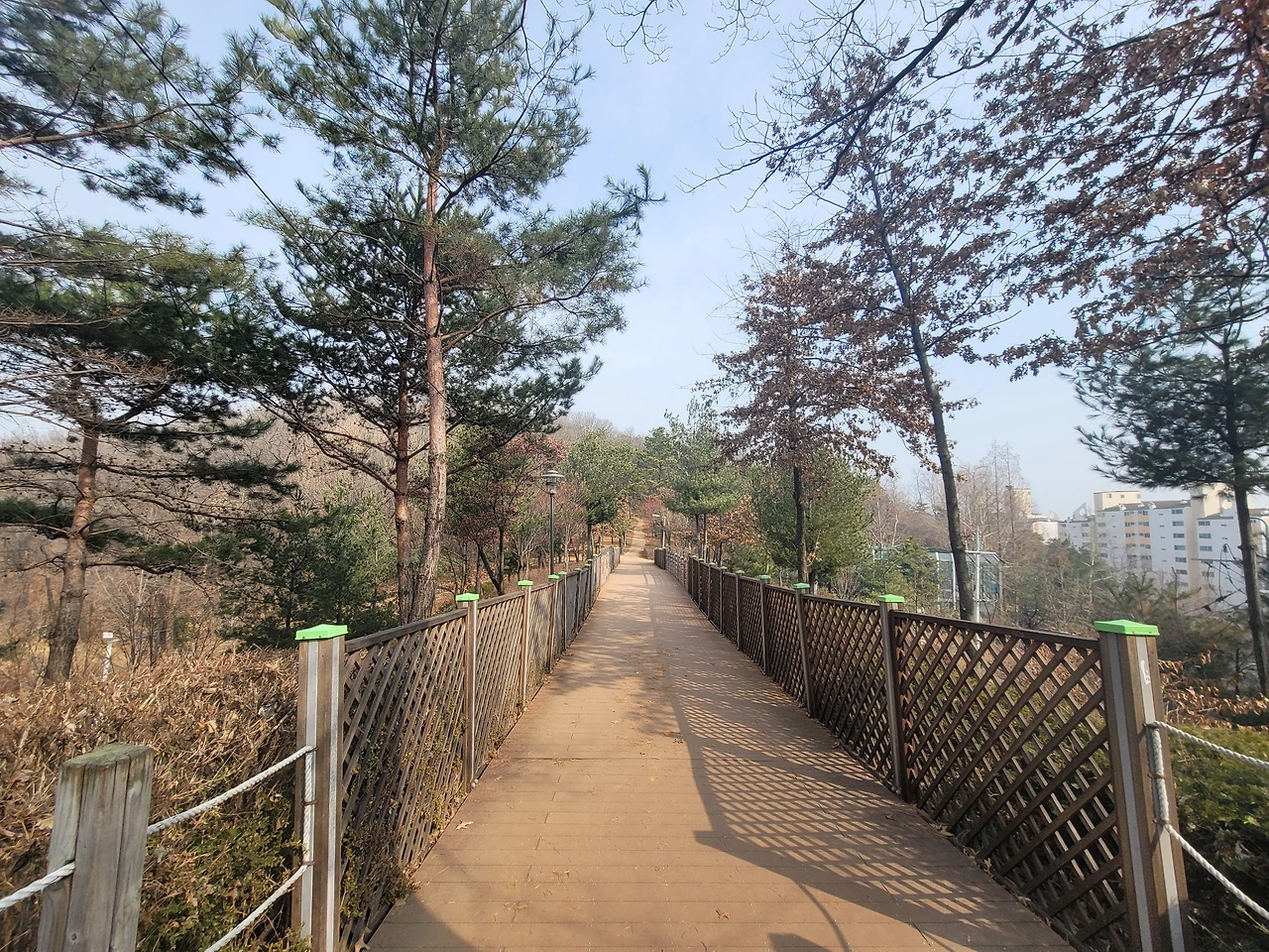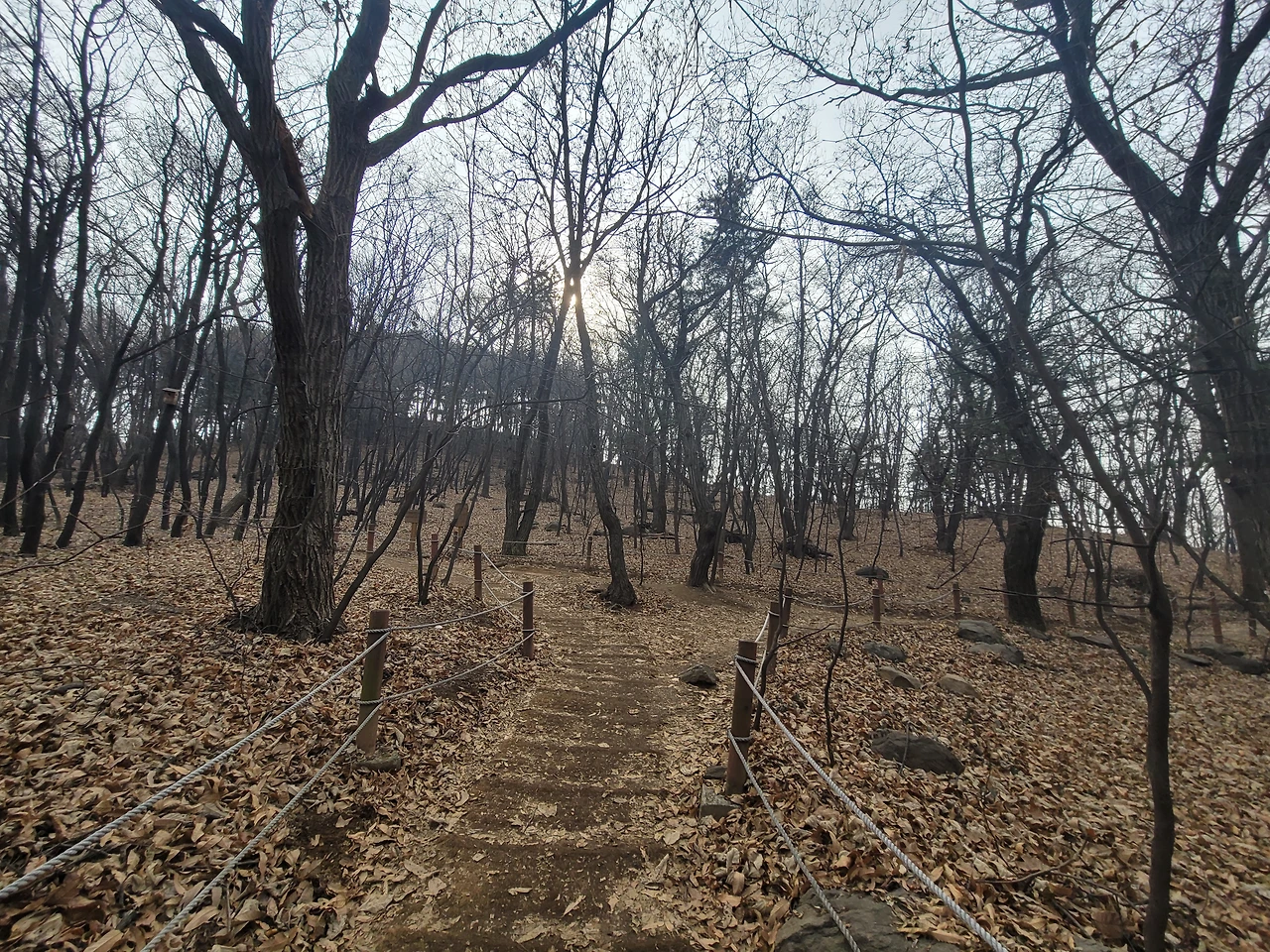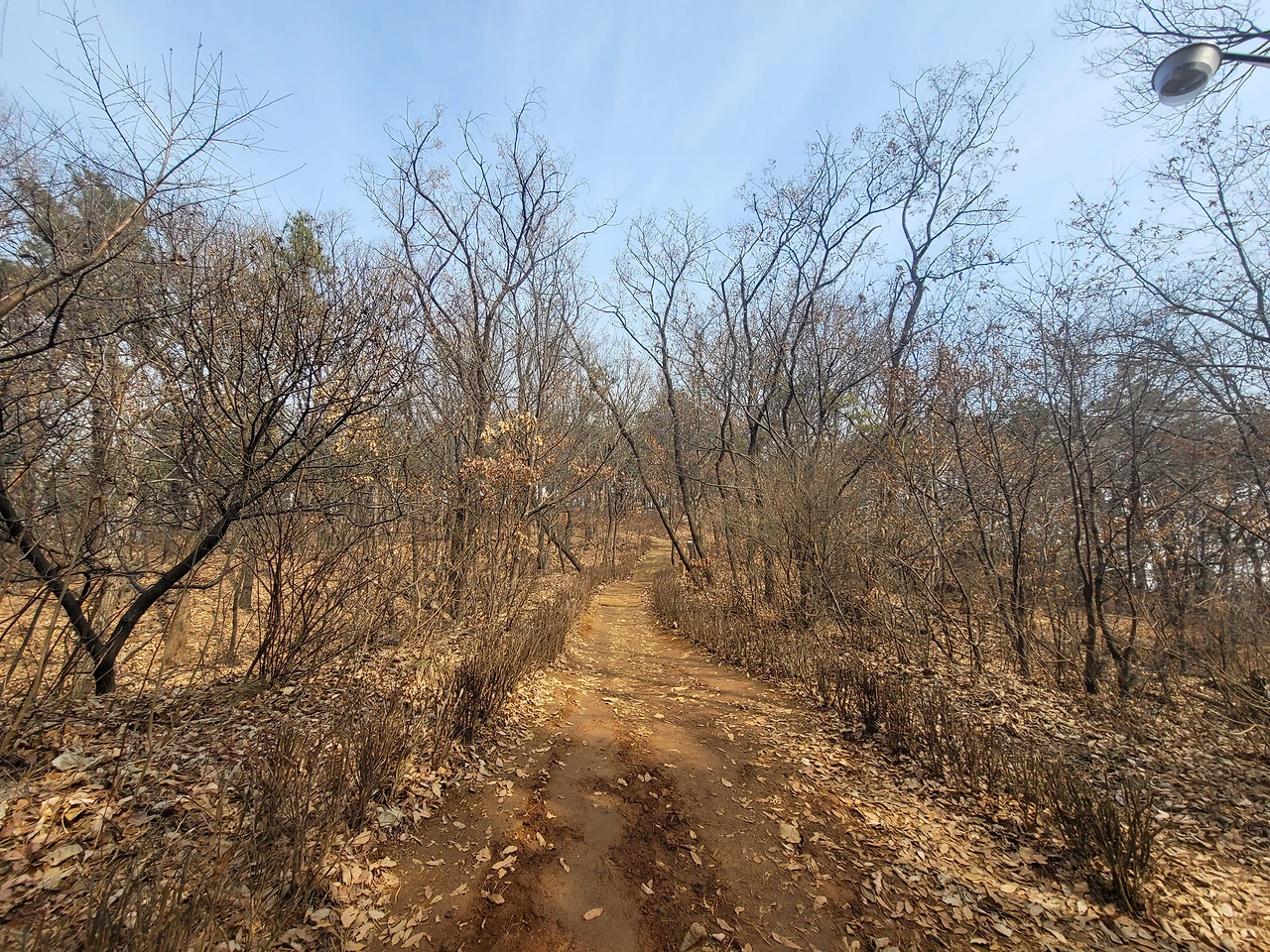 원당산과 검덕산은 크기가 비슷하다. 원당산에도 둘레길이 있고 검덕산에도 둘레길이 있다. 두 산을 합쳐서 우장근린공원이라 하는데 북쪽의 검덕산이 더 조용한 편이다. 원당산 둘레길은 한 바퀴가 온전히 다 포장이 되어 있어 걷기가 아주 편하다. 이에 반해 검덕산 둘레길은 반 정도만 포장된 길이고 나머지는 산중에 난 오솔길이다. 포장된 길이라 해도 자동차가 다닐 수 없는 보행자용 길이어서 아늑한 느낌을 준다.