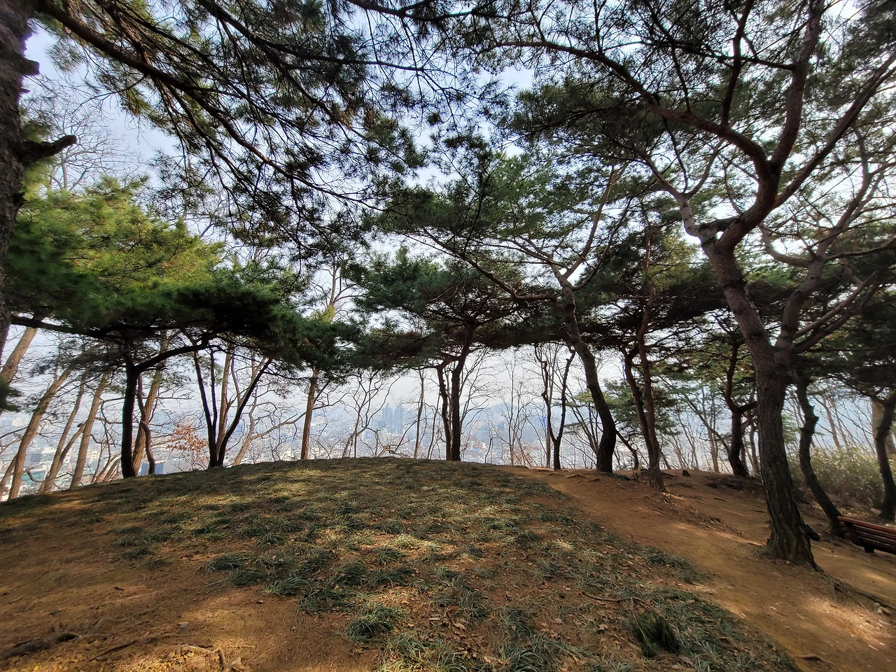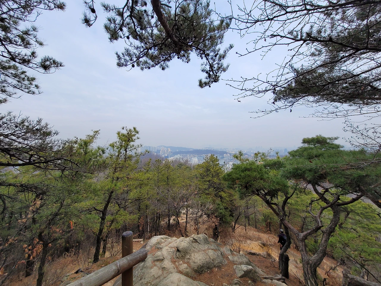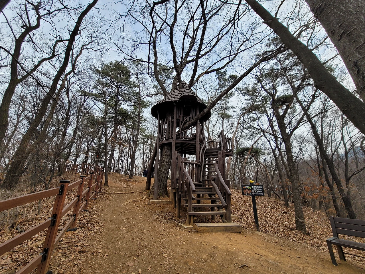 전망대를 지나면 내리막이다. 도중에 '휴게트리전망대'가 있다. 통나무로 세운 집으로 계단을 따라 올라가면 좁은 공간의 전망대가 있다. 큰 나무가 바닥을 뚫고 올라와 있어 놀랍다. 자연을 활용하여 인위적으로 휴게 공간을 만들었다. 그곳을 지나면 낙성대공원쪽으로 내리막길로 오른편에 울창한 산림 지대가 있다.