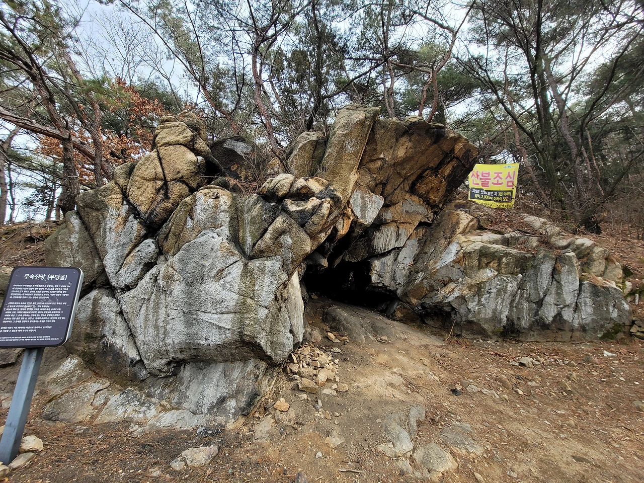 숲속 길을 따라 오르다가 다시 한 번 연주대 가는 길을 지나치면 전망 좋은 쉼터에 이르는데 그곳이 무당골이다. 쉼터 바로 옆에 안으로 움푹 파인 거대한 바위가 있고 바위 아래 기도 드린 흔적이 남아 있다. 옛날부터 이곳은 무속신앙의 현장이었던 것이다. 바위 형상이 대단히 특이하다. 그 부근의 숲속 길은 굽이쳐 돌아가는 모양이다.