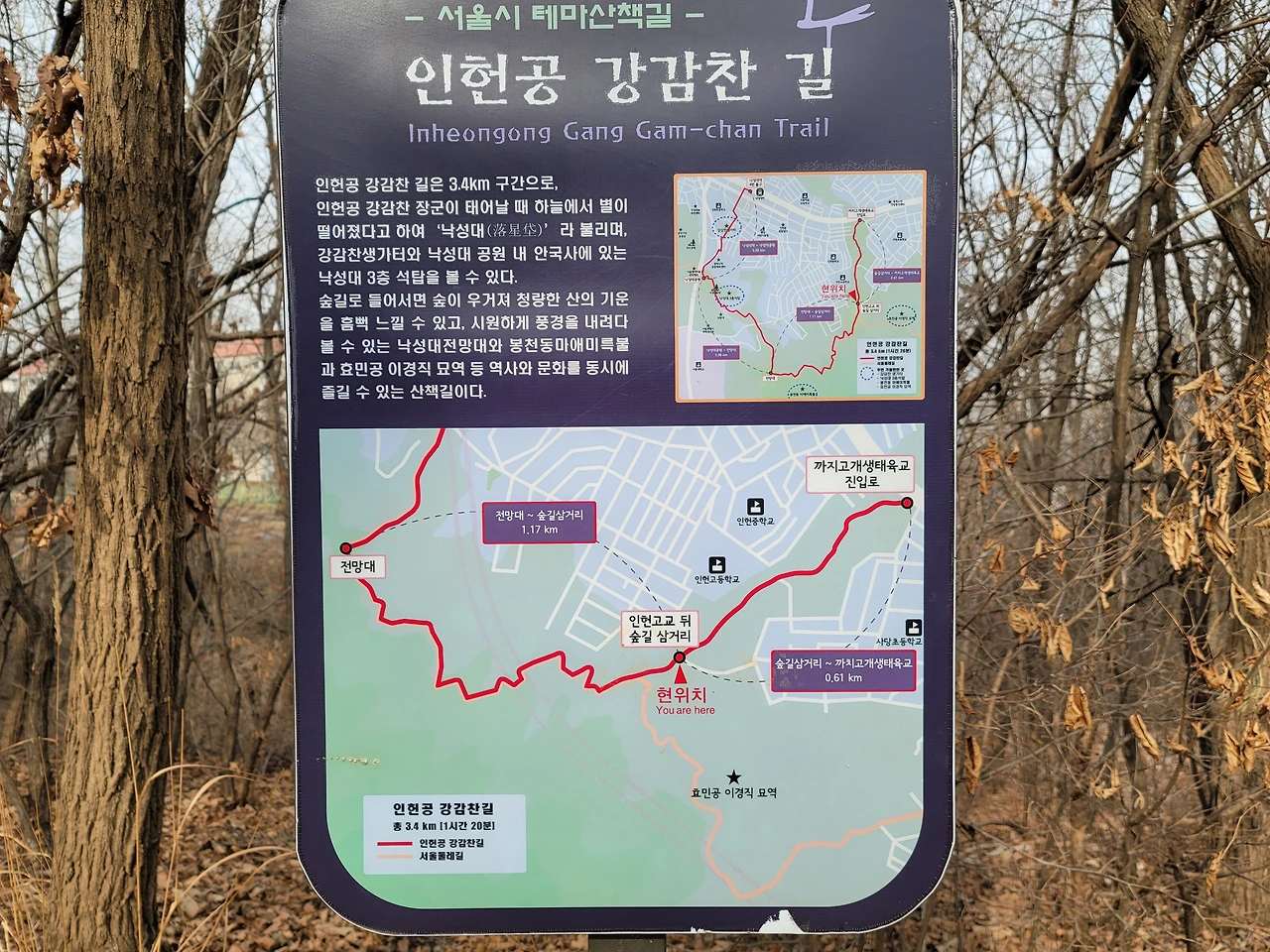 숲속 길을 다 내려오면 강감찬 장군의 사당인 안국사이다. 낙성대공원 넓은 마당에 강감찬 장군의 기마상이 우뚝 서 있다. 용맹한 기상을 한눈에 알 수 있다. 여기서부터 인헌공강감찬길과 관악산둘레길 1구간은 갈라진다. 감감찬길은 남부순환로로 향하고 관악산둘레길 1구간은 다시 길을 횡단해 산으로 향한다.