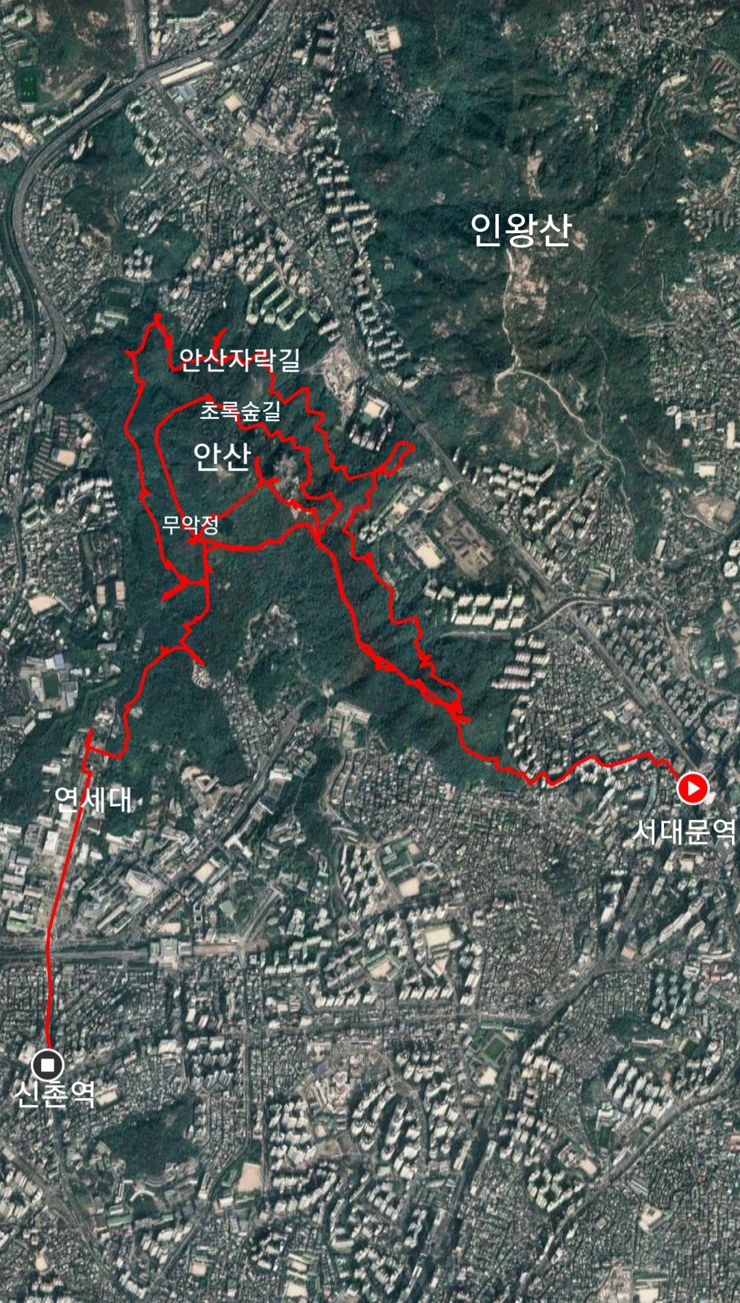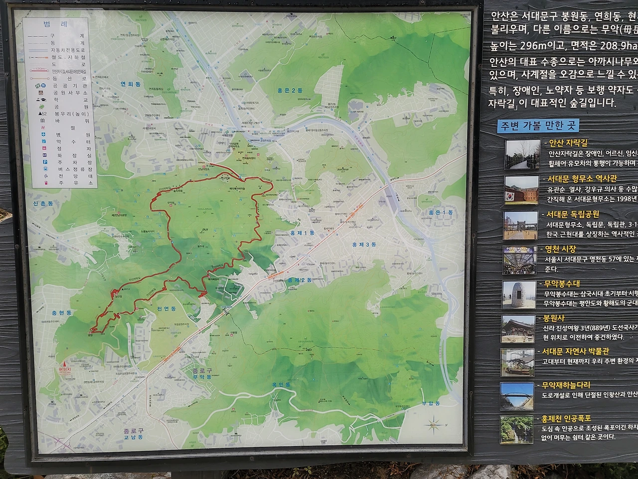 안산은 서울 서대문구의 한가운데에 위치한 해발 296m의 산이다. 안산의 다른 이름은 무악산이다. 무악재를 사이에 두고 인왕산과 마주보고 있다. 안산에는 봉수대가 있고 봉수대에서 내려다보는 전망이 대단하다. 인왕산, 북악산, 북한산, 남산은 물론이고 멀리 불암산, 청계산, 관악산, 삼성산이 눈에 들어온다. 더 멀리는 인천의 계양산까지 보인다.