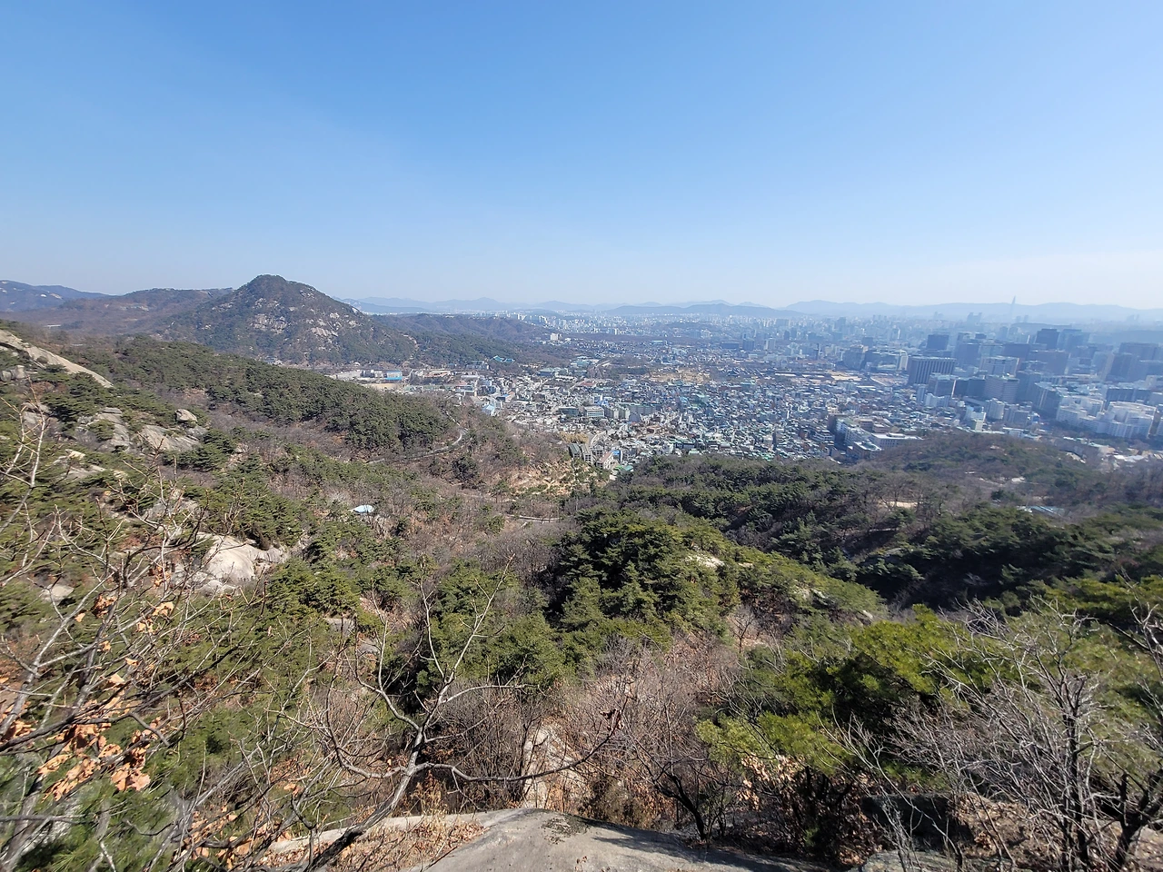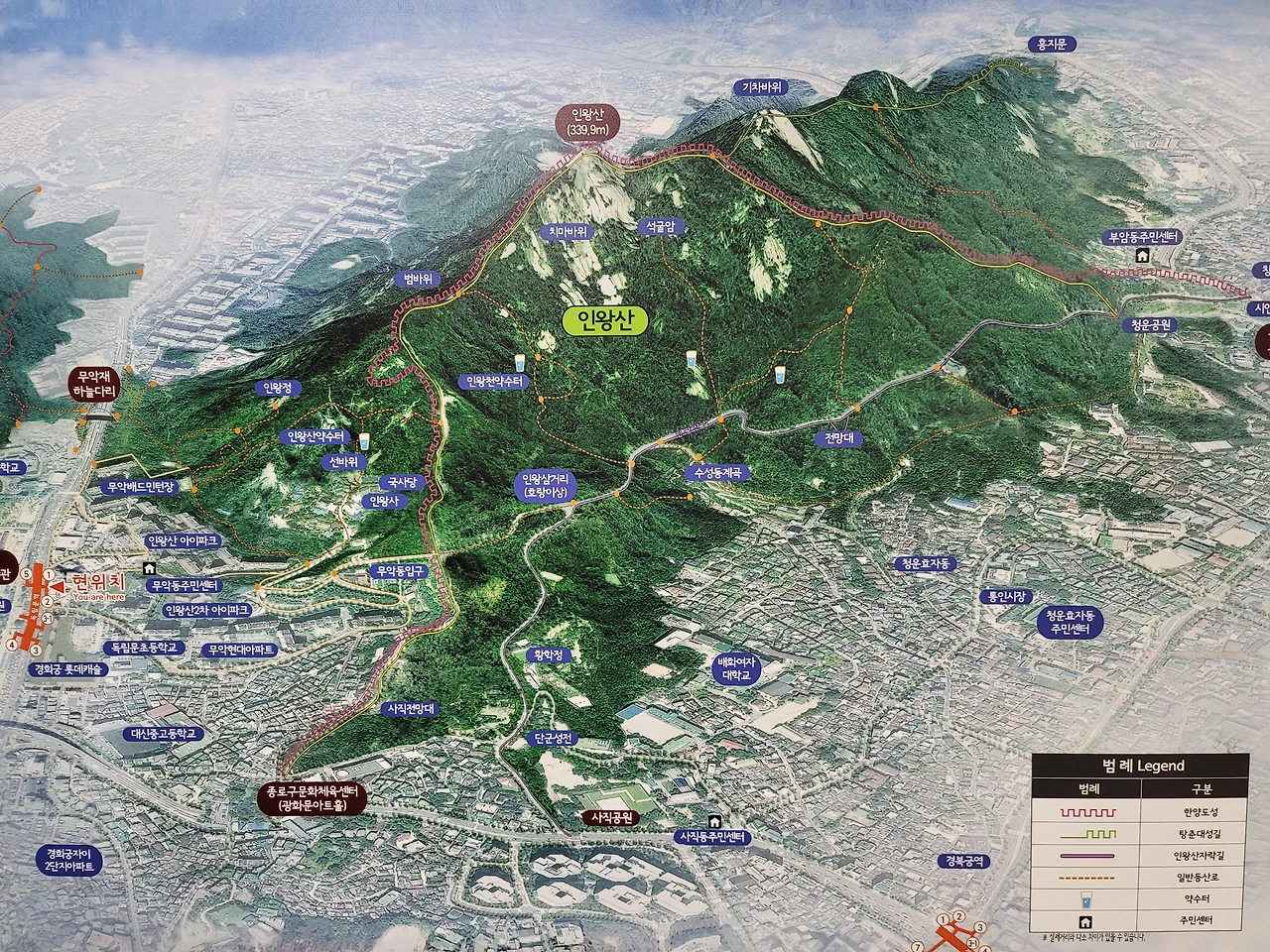 인왕산은 서울시 종로구와 서대문구에 걸쳐 있는 해발 338.2m의 산이다. 조선이 건국할 때 도성의 북쪽에 주산으로 북악산, 남쪽에 안산으로 남산(목멱산)을 두고 좌청룡으로 낙산, 우백호로 인왕산을 삼았다. 인왕산에서는 경복궁이 훤히 내려다보이고 서울 도심이 한눈에 들어온다. 인왕산은 1968년 1.21 사태 후 폐쇄되었다가 25년만인 1993년에 시민에게 개방되어 지금에 이르고 있다.