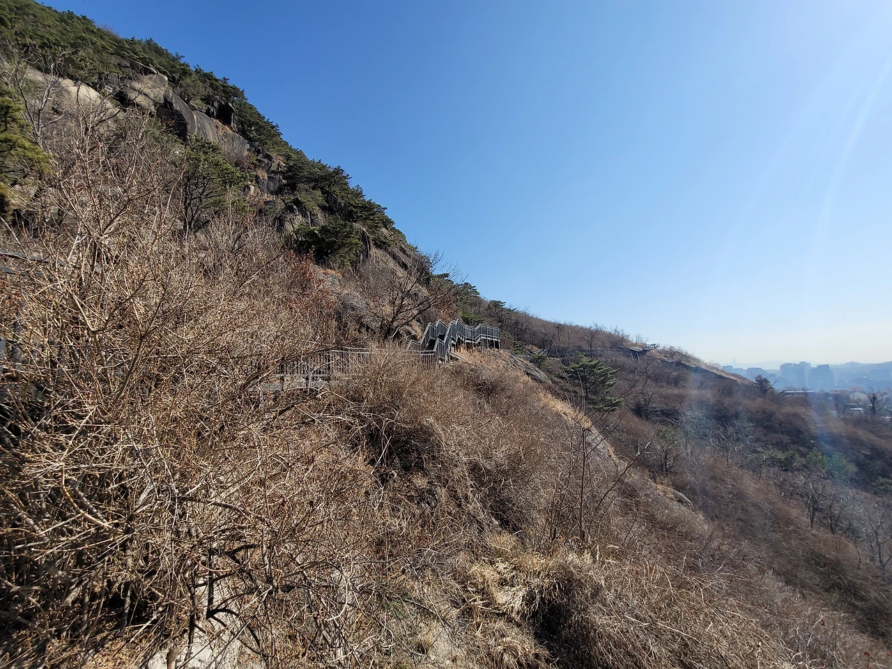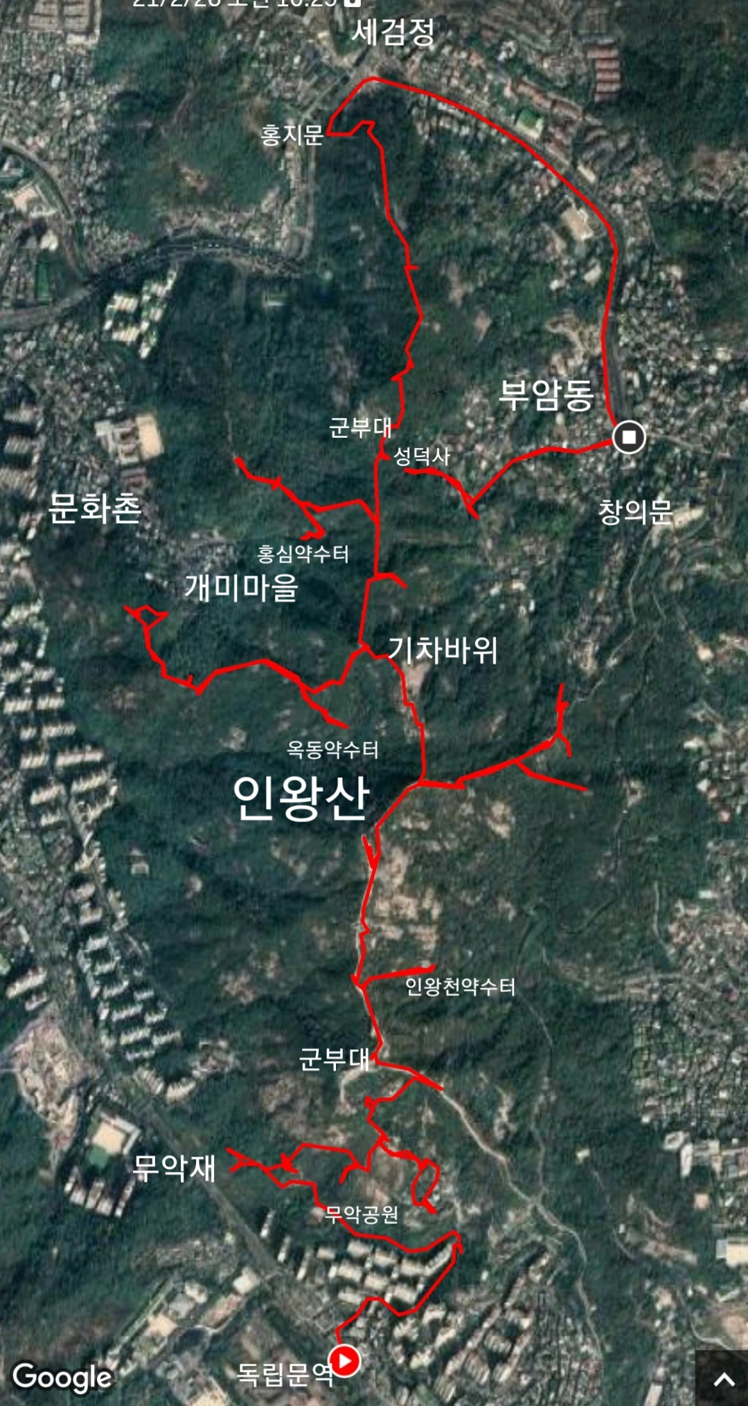인왕산은 여러 곳에서 오를 수 있다. 남쪽에서는 사직공원, 종로체육문화센터, 무악공원 등에서 시작할 수 있고 서쪽에서는 문화촌현대아파트, 개미마을, 유원하나아파트 등에서 오를 수 있다. 북쪽에서는 홍지문, 세검정삼거리에서 오르는 길이 있고 동쪽에서는 부암동 하링각 부근 진각사 옆이나 부암동주민센터 위쪽 성덕사 옆으로 오를 수 있지만 길을 찾기가 대단히 어럽다. 대신 창의문에서는 많은 사람들이 이용하는 길이 있다. 수성동계곡에서도 인왕로에 이른 뒤 인왕천약수터를 지나 인왕산 능선에 오를 수 있다. 부근에 지하철 3호선 경복궁역, 독립문역, 무악재역이 있다. 2021. 2. 26.