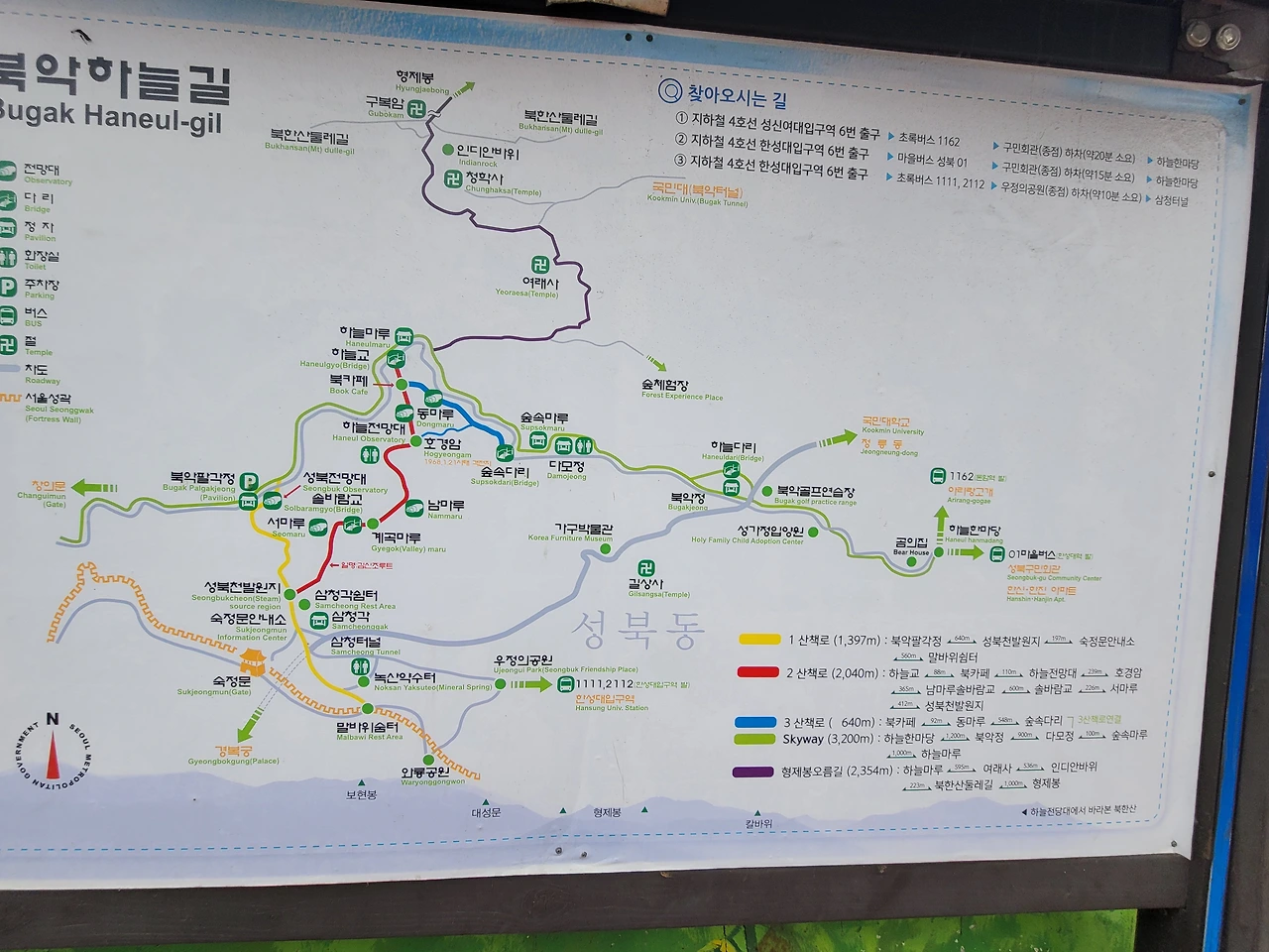 북악산에는 북악스카이웨이라 불렸던 자동차 도로인 북악산로가 동서를 가로지르고 사람이 걸어다니는 길로 북악하늘길이 있다. 북악하늘길은 자동차 도로인 북악스카이웨이와 거의 나란히 나 있는 북악스카이웨이 산책로, 북악팔각정에서 말바위쉼터까지의 1 산책로, 하늘교에서 성북천발원지까지의 2 산책로, 북카페에서 숲속다리까지의 3 산책로 그리고 하늘마루에서 형제봉에 이르는 형제봉오름길을 뭉뚱그려 가리킨다.