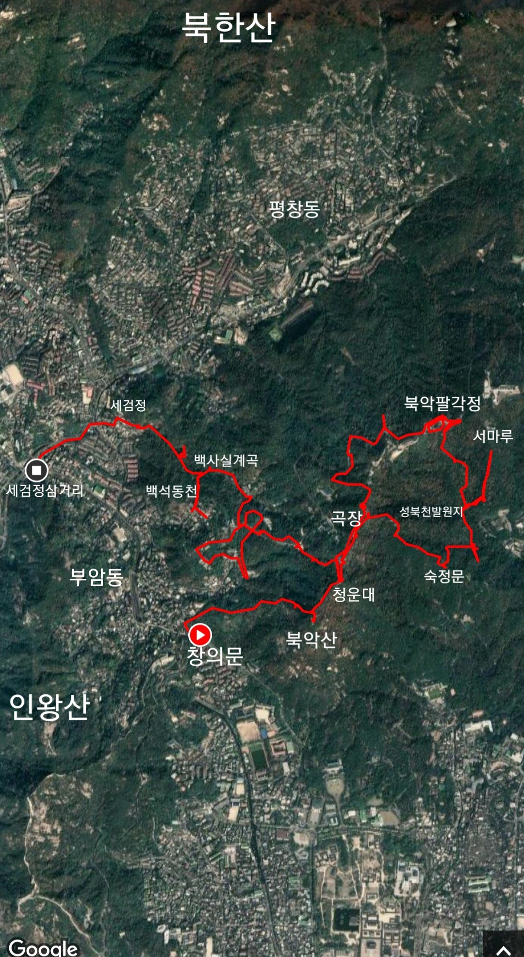 정상에서 내려오면 청운대가 있고 좀 더 아래에 테이블이 여러 개 있는 쉼터와 화장실이 있다. 창의문 안내소에서 순례를 시작해 청운대 안내소와 곡장 안내소를 통해 북악산의 북쪽으로 나올 수도 있지만 성곽을 따라 계속 걸으면 촛대바위와 숙정문까지 이른다. 촛대바위와 숙정문 사이에는 대단히 울창한 소나무 군락지가 있다. 숙정문에서 동쪽으로 빠져서 숙정문 안내소를 통해 나오면 북악하늘길과 만난다.