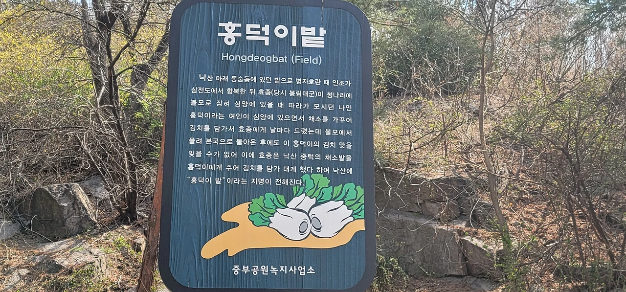 낙산공원에는 팔각정인 낙산정이 있다. 낙산정에서는 북서쪽으로 북악산이 보이고 그 사이에 후원, 창경궁 그리고 연건동, 동숭동, 혜화동 일대가 펼쳐져 있다. 낙산정에서 아주 가까운 곳에 홍덕이밭이 있다. 홍덕이밭은 병자호란 때 볼모로 청나라 심양에 잡혀갔던 봉림대군이 나인 홍덕이 담가준 김치 맛을 잊지 못해 한양에 돌아온 뒤에도 홍덕이에게 낙산에 밭을 주어 김치를 담게 했다는 밭이다.