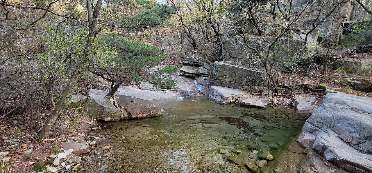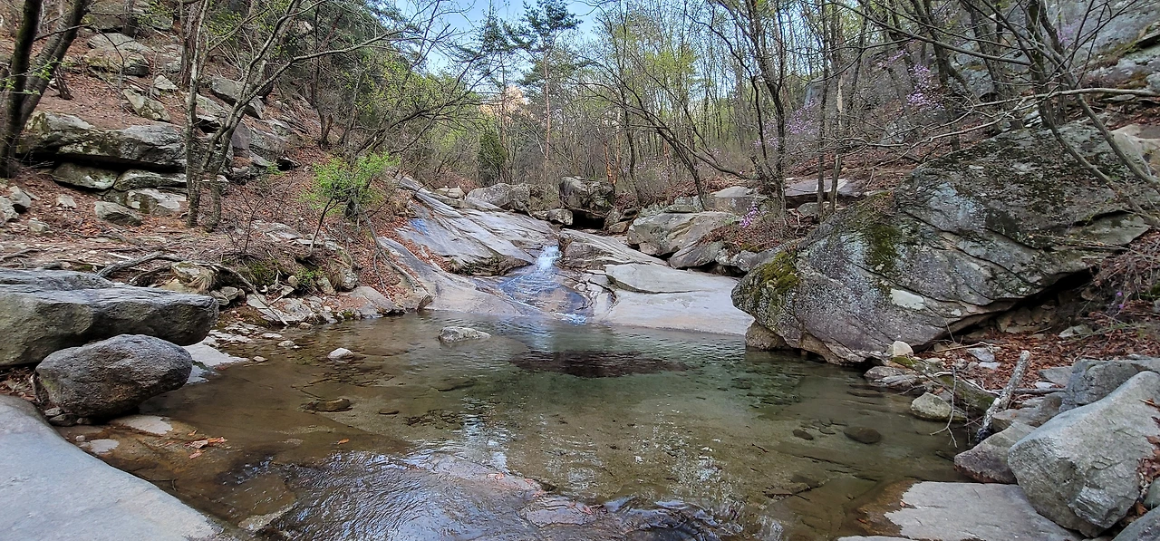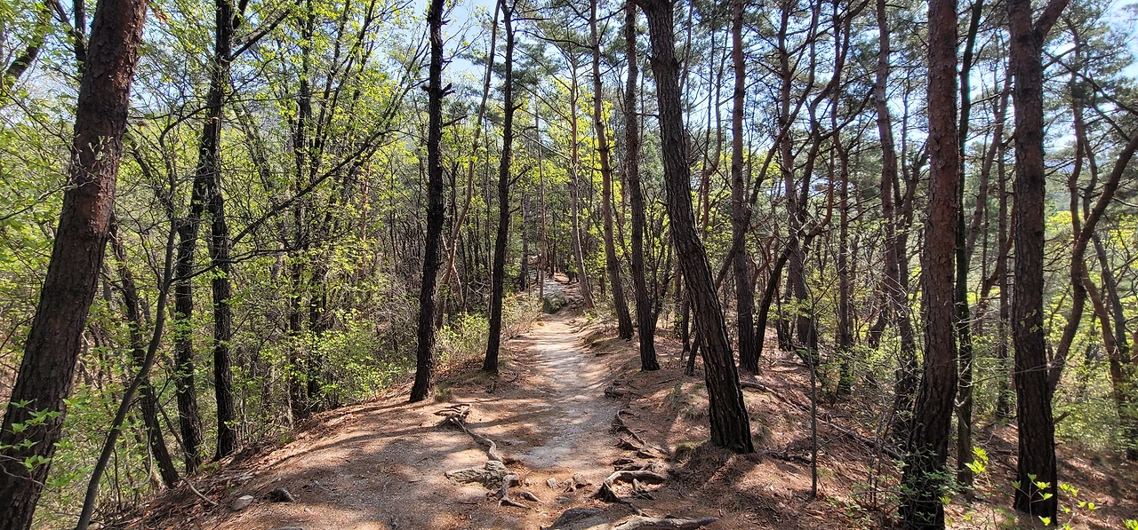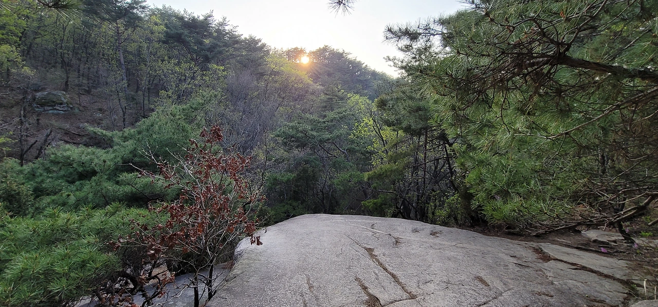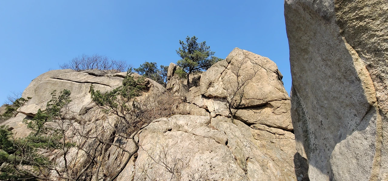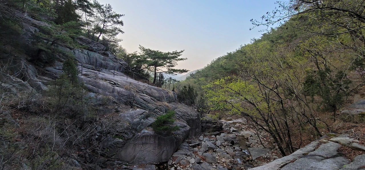 샘터를 지나 얼마 가지 않아 갈림길이 있다. 밤골공원지킴터와 사기막공원지킴터로 갈라지는 길이다. 밤골공원지킴터 방향의 길은 밤골계곡으로 내려가는 계곡길이고, 사기막공원지킴터 방향의 길은 숨은벽능선 가는 길이다. 계곡길로 가면 밤골계곡의 굽이굽이 흐르는 물길을 만날 수 있고 숨은벽능선으로 가면 탁 트인 전망과 함께 숨은벽과 갖가지 바위들의 형상을 볼 수 있다.
