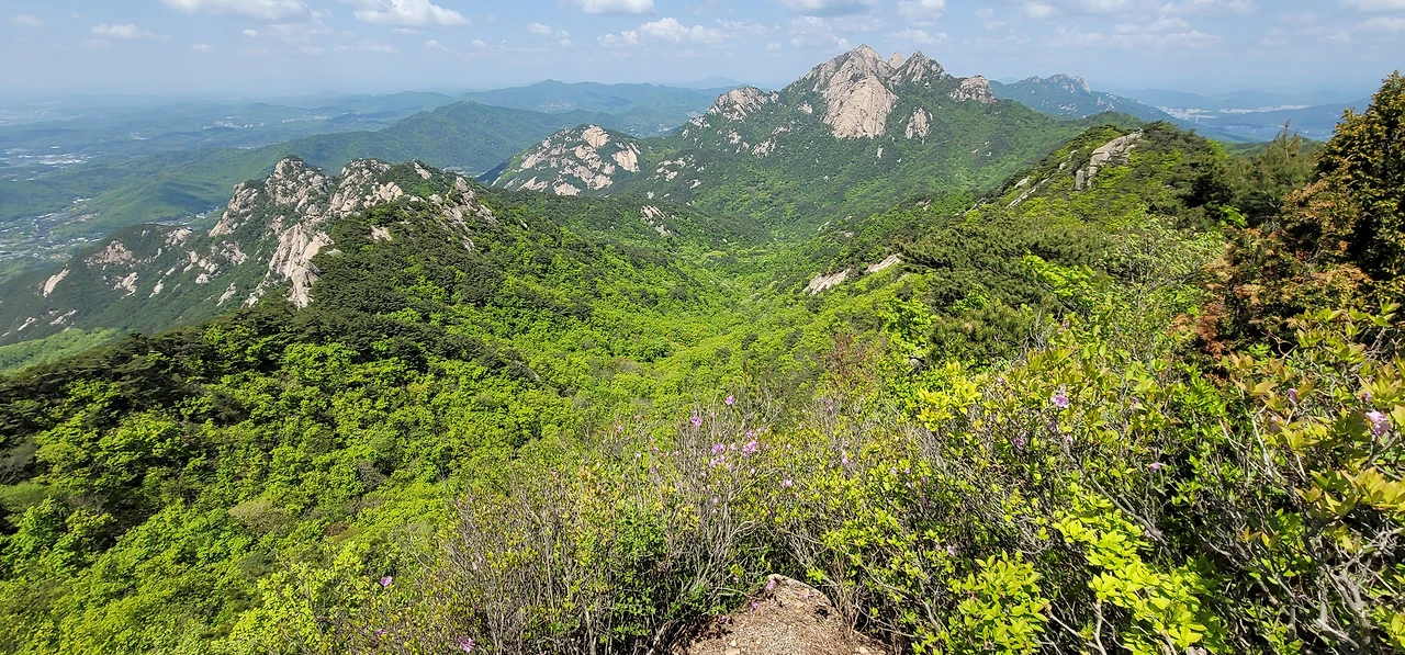 칼바위에서 조망을 즐기다 하산하다 보면 뾰죽뾰죽한 길이 이어져 긴장하게 만든다. 지형이 참으로 독특하다. 능선길에 바위가 갈라진 모습이 어떤 지질 현상이 있었음을 추측하게 한다. 경사가 가파른 곳에는 쇠봉이 설치되어 있어 오르고 내려가는 것을 도와준다. 이 구간을 지나면 좀 더 아래에 덜 가파른 쇠봉 구간을 지나고 그 후로는 비교적 수월하다. 특히 문필봉 아래로는 편하게 걸을 수 있다.