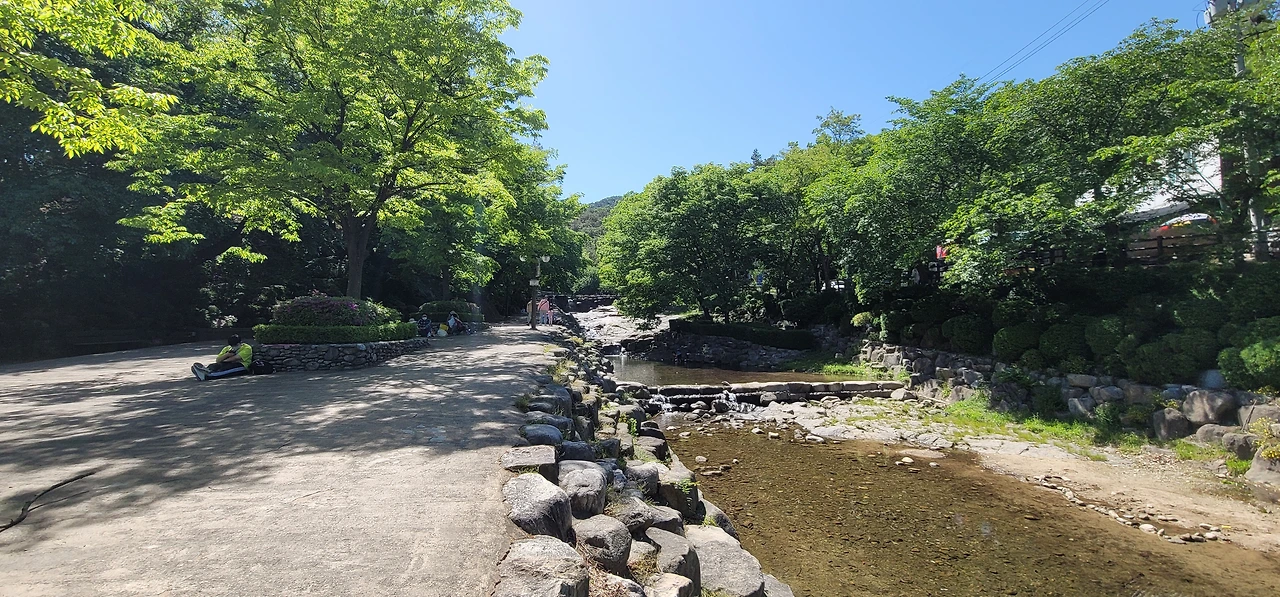 연주암 아래로 하산하다 보면 전에 산장이 있던 자리에 커다란 쉼터가 있고 그 후로 제2약수터, 제1약수터가 있다. 약수는 고인 샘물이다. 그 아래로 제2깔딱고개, 깔딱고개 표지판이 있지만 깔딱고개같은 느낌은 들지 않는다. 과천향교로 가는 계곡길에 몇 개의 징검다리가 있어 탐방로에 운치를 더한다. 길은 계곡 따라 과천향교까지 이어지고 향교 부근의 계곡은 매우 넓어져 많은 사람들이 계곡에서 즐기는 것을 볼 수 있다.