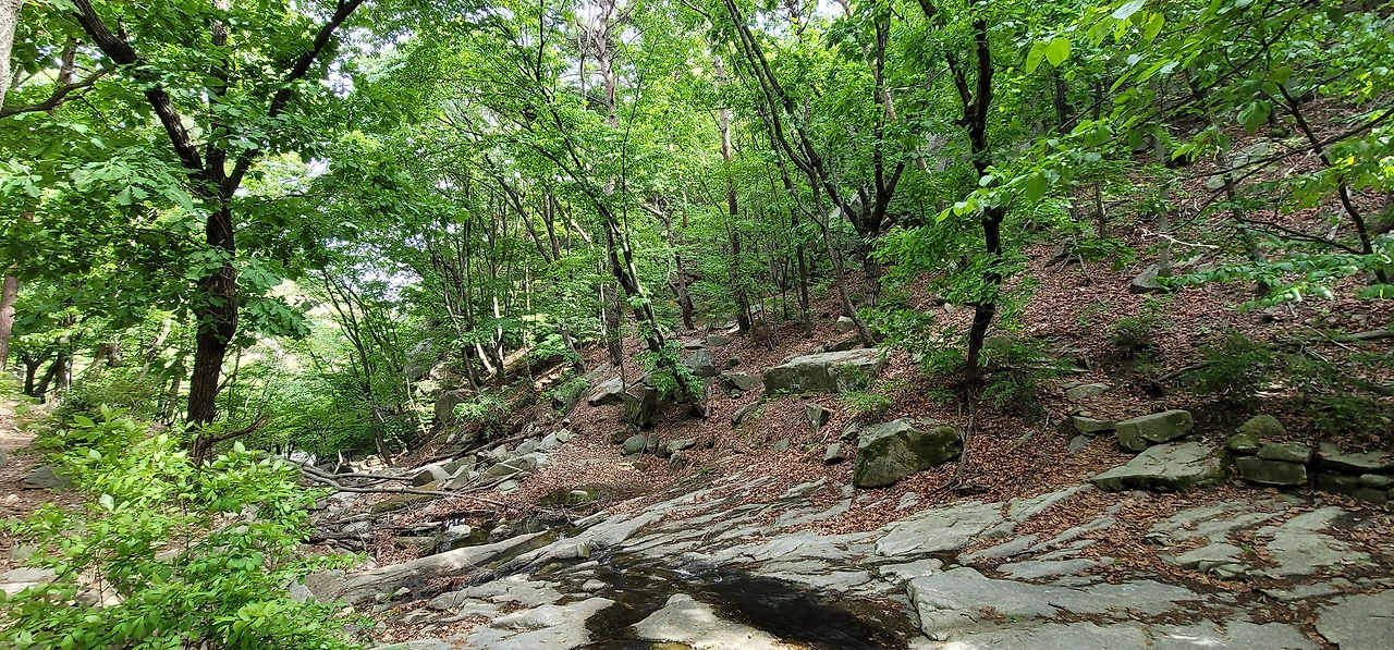호수공원을 지나 계속 남쪽으로 가면 어느덧 넓은 쉼터가 나오고 그곳이 제4쉼터로 부근에 제4야영장이 있다. 지도에는 수중동산이라 표시되어 있다. 연주대로 가려면 좌측 동쪽으로 들어서야 무너미고개로 가려면 계속 남쪽으로 직진한다. 무너미고개는 삼거리약수터를 지나면 나타난다. 좁은 통로에 위치한 무너미고개는 길이 동서남북 네 갈래로 갈라지는 곳이다. 학바위능선은 무너미고개에서 동쪽으로 난 오르막길로 올라서서 가게 된다.