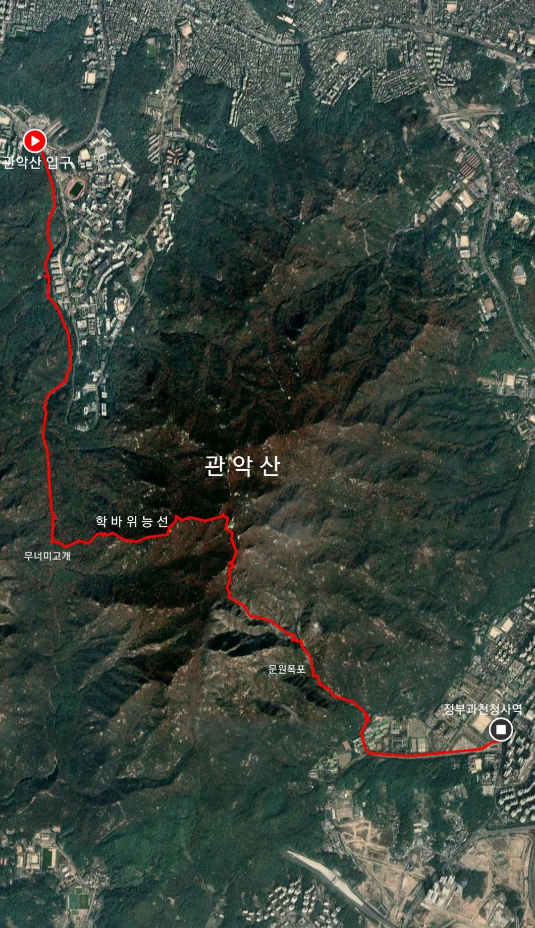 전망을 즐기다 계속 능선을 따라 오르면 KBS송신소 아래까지 이르고 능선을 따라 남쪽으로 내려가다가 과천 문원폭포, 마당바위 방향으로 내려가는 능선으로 빠진다. 산자능선이다. 이곳은 사람이 별로 없고 자칫 길을 놓치기 쉬우니 주의해야 한다. 마당바위에 이르면 비로소 길이 매우 넓어진다. 관악산 산불 초소를 지나 화학융합시험연구원, 국사편찬위원회를 차례로 지나면 정부과천청사역에 이르게 된다.