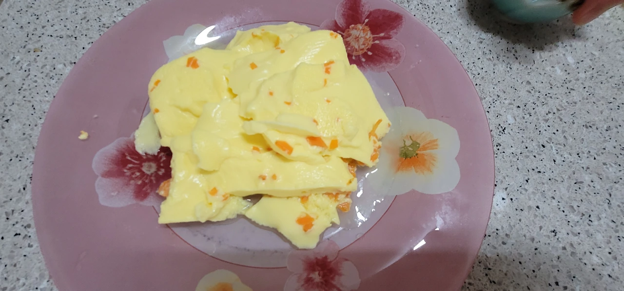 중탕을 하기로 했다. 물을 담은 솥에 삼발이를 놓고 그 위에 유리 그릇을 올려서 그릇에 담긴 계란물을 익히는 방식이다. 계란 3개를 깨뜨린 뒤 믹서기에 넣고 갈았다. 그리고 물과 우유를 약간 부은 뒤 유리 그릇에 담았다. 꺼낼 때 부드럽게 꺼낼 수 있게 유리 그릇에 기름칠을 하는 게 좋다 해서 그렇게 했다. 계란만 하면 심심하니 당근을 잘게 썰어 넣었다.