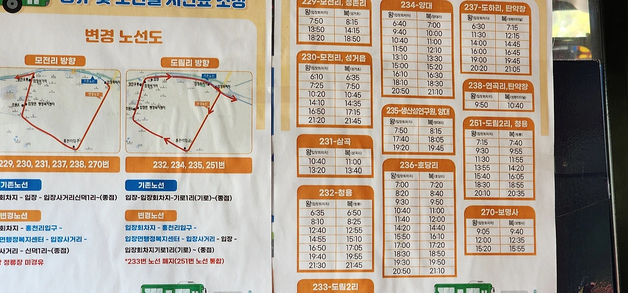 232번의 시간표를 알 수 있었다. 배차 간격이 1시간 반 또는 두 시간 반이었다. 하루 7번 다님을 알 수 있었다. 그렇게 배차 간격이 뜸한 것은 무엇을 말하는가. 타는 사람이 적다는 뜻이다. 이용하는 사람이 많다면 배차 간격이 그렇게 뜸할 수가 없을 것이다. 아닌게 아니라 그렇게 한두 시간에 한 대씩 있는 버스지만 차 안에는 사람이 거의 없었다. 텅 비다시피했다.