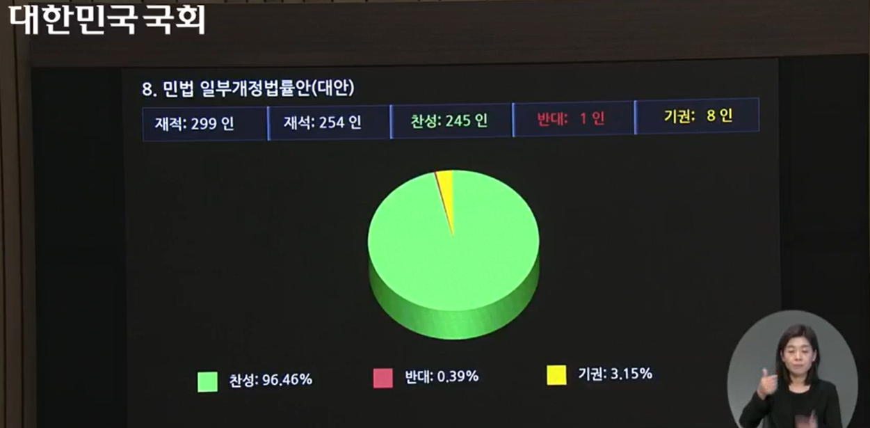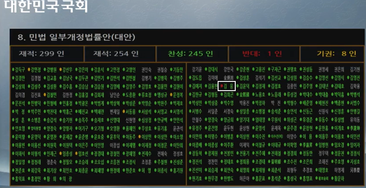 표결에 오른 법률안 중에서 민법 일부개정법률안과 행정기본법 일부개정법률안이 있었습니다. 표결이 이루어졌는데 민법은 재석 254인 찬성 245인 기권 8인 반대 1인이었고, 행정기본법은 재석 250인 찬성 241인 기권 8인 반대 1인이었습니다. 그리고 반대 1인은 모두 국민의힘 김웅 의원이었습니다.
