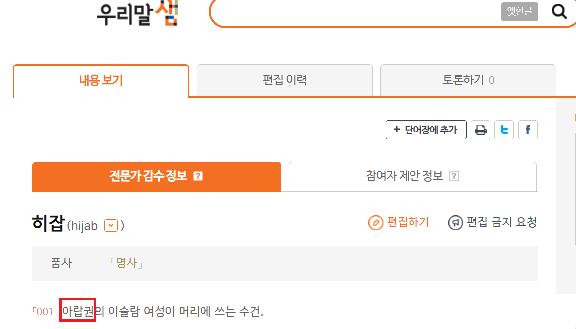 하나 더 지적할 것이 있습니다. 히잡을 '아랍권의 이슬람 여성이 머리에 쓰는 수건'이라고 뜻풀이한 우리말샘 사전에 '아랍권'이란 말이 표제어로 올라 있지 않습니다. 뜻풀이에 사용된 말이 국어사전에 없으면 그 뜻풀이를 어떻게 이해할 수 있습니까? 국어사전에 '아랍권'이란 말이 없는 이상 '아랍권'이란 말을 단어 뜻풀이에 써서는 안 되고 딴 말을 이용해 뜻풀이를 해야 합니다. 뜻풀이에 '아랍권'을 쓰려면 '아랍권'을 국어사전에 올려야 합니다.