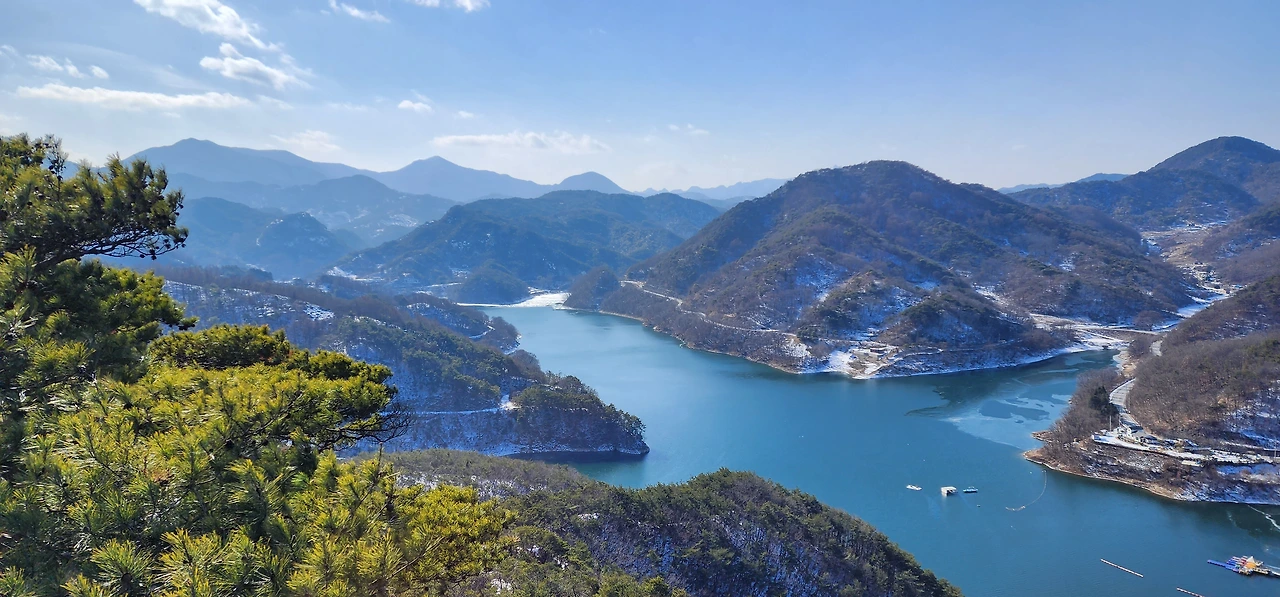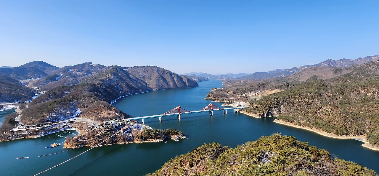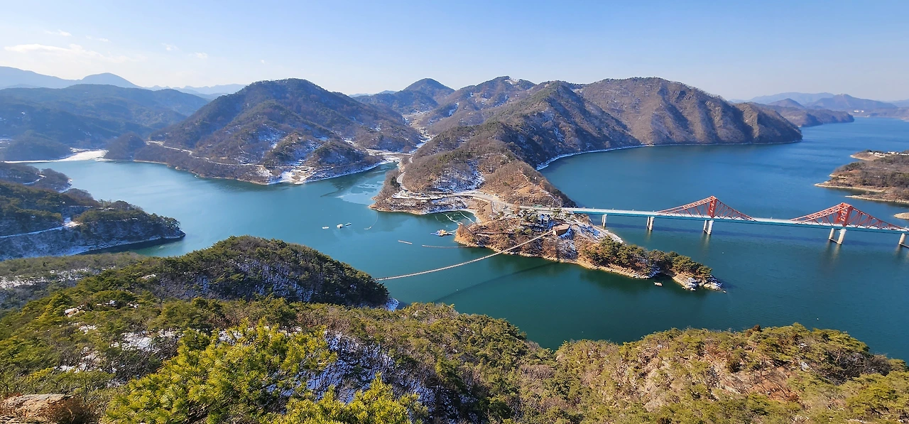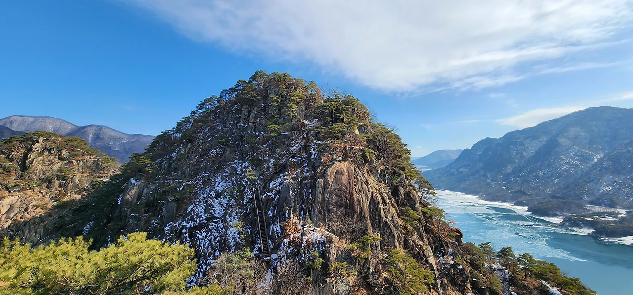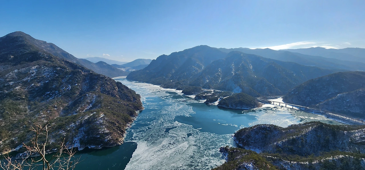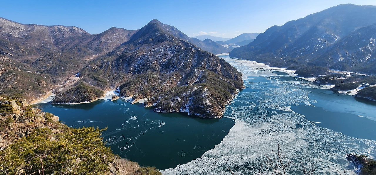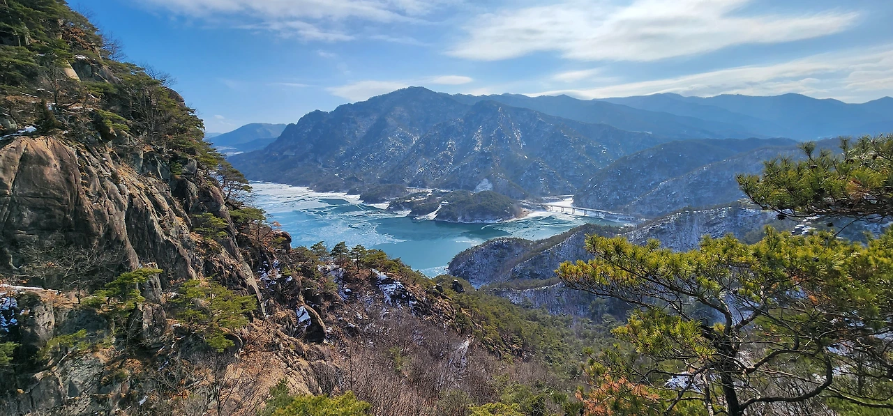 온 사방에 병풍처럼 산이 둘러싸고 있는 것도 탄성을 자아내지만 유유히 흐르는 청풍호 호수가 또한 장관이다. 겨울이라 호수에 얼음이 얼어 있는데 배가 얼음을 깨고 길을 내고 있었다. 장회나루 앞이었다. 구담봉에서는 장회나루가 저 멀리 내려다보이고 옥순봉에서는 옥순대교와 새로 생긴 옥순봉출렁다리가 시선을 사로잡는다.