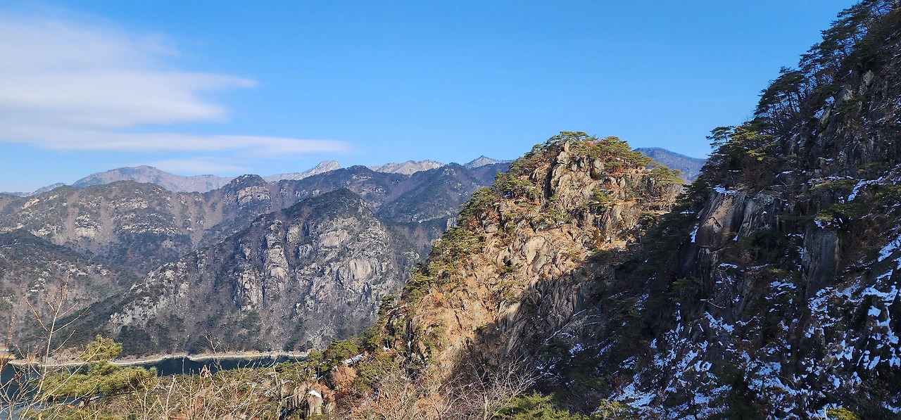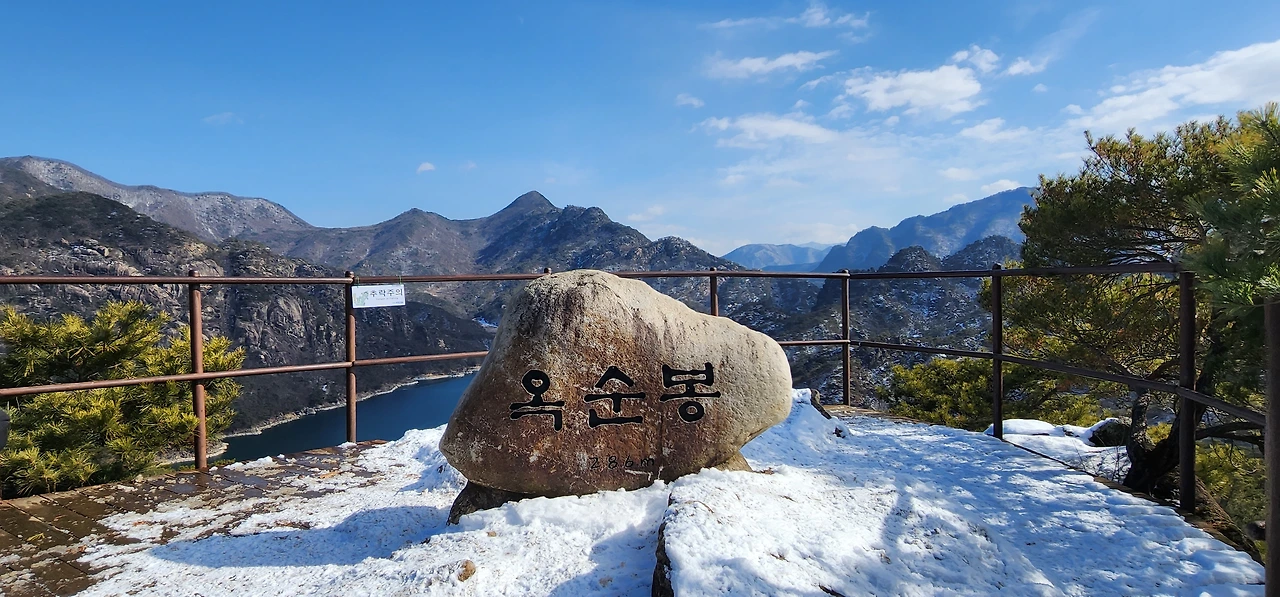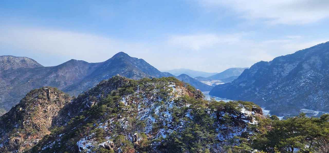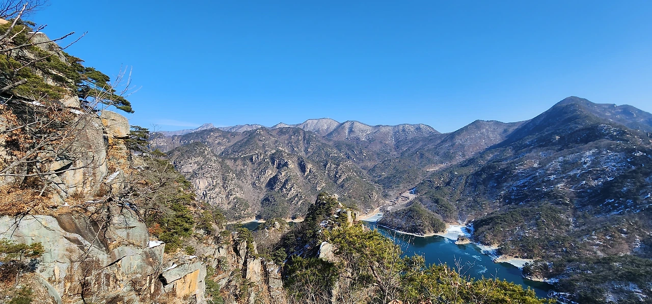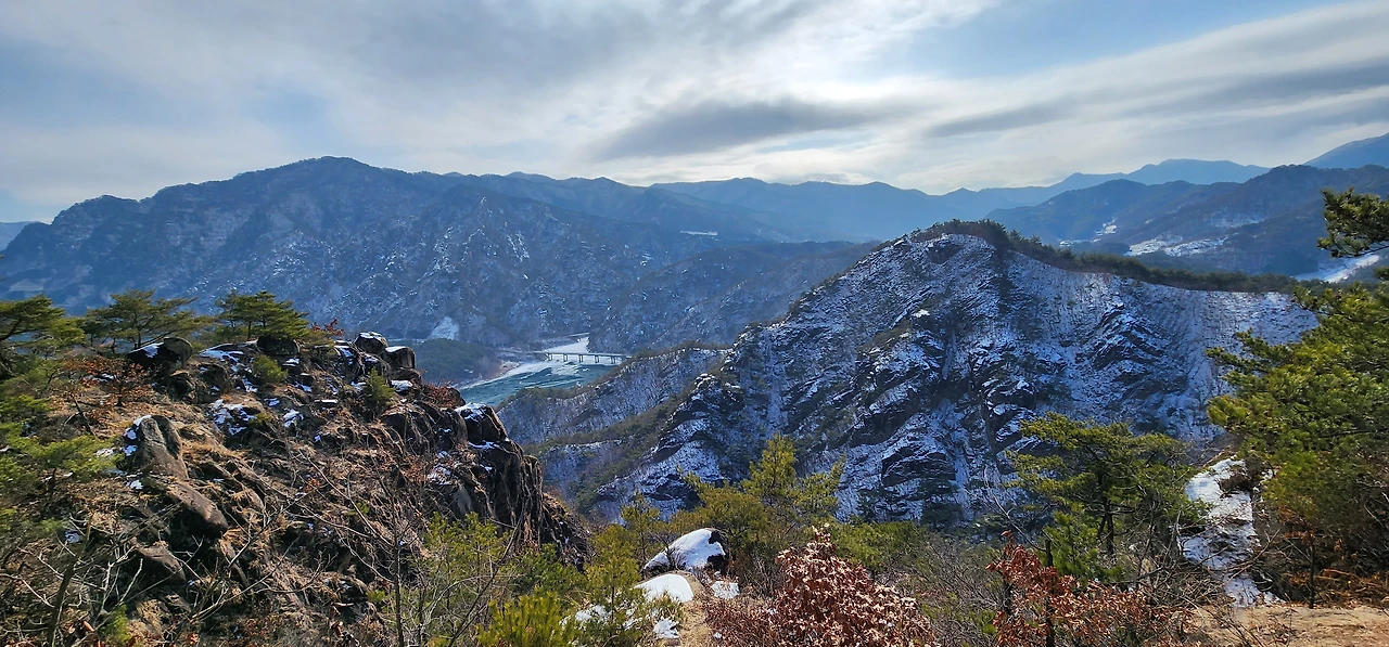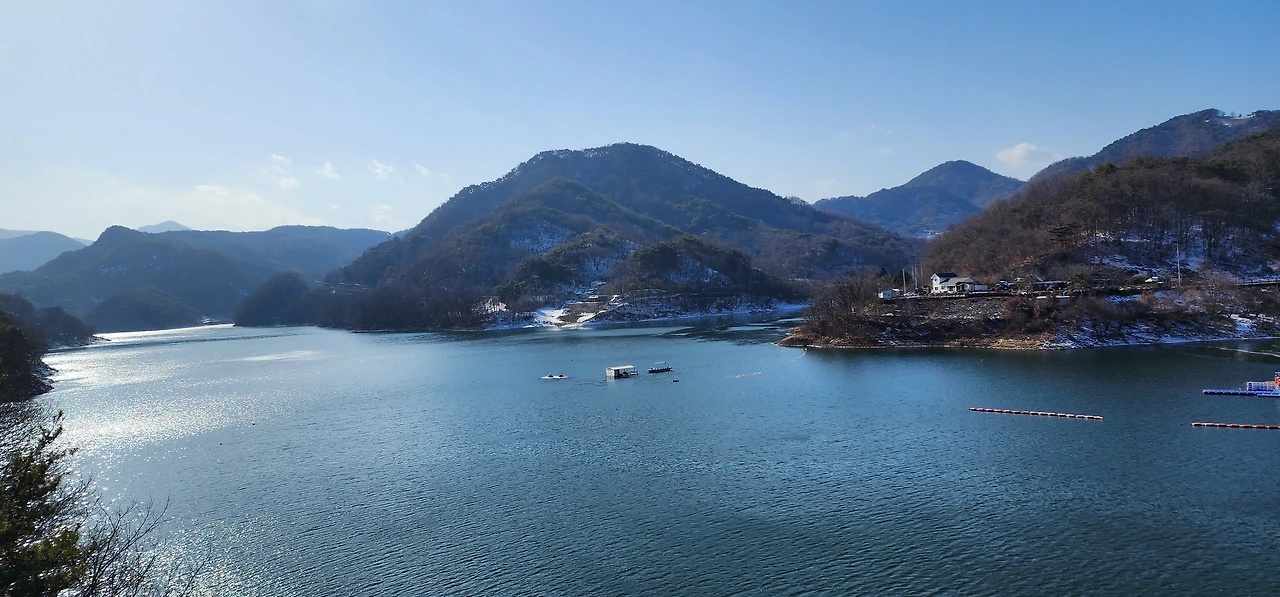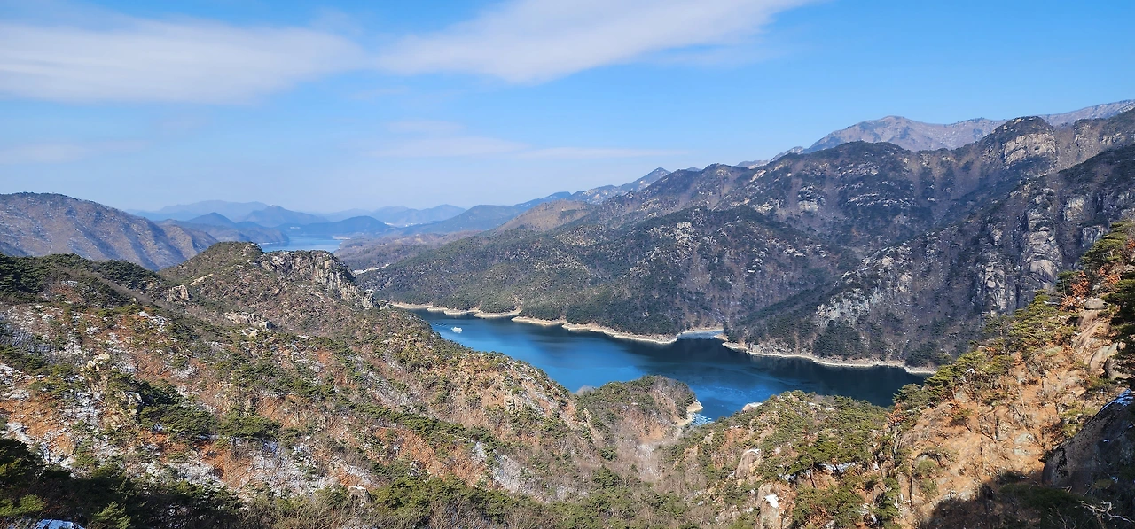 온 사방에 병풍처럼 산이 둘러싸고 있는 것도 탄성을 자아내지만 유유히 흐르는 청풍호 호수가 또한 장관이다. 겨울이라 호수에 얼음이 얼어 있는데 배가 얼음을 깨고 길을 내고 있었다. 장회나루 앞이었다. 구담봉에서는 장회나루가 저 멀리 내려다보이고 옥순봉에서는 옥순대교와 새로 생긴 옥순봉출렁다리가 시선을 사로잡는다.
