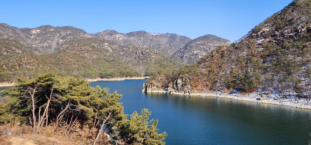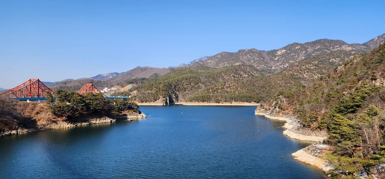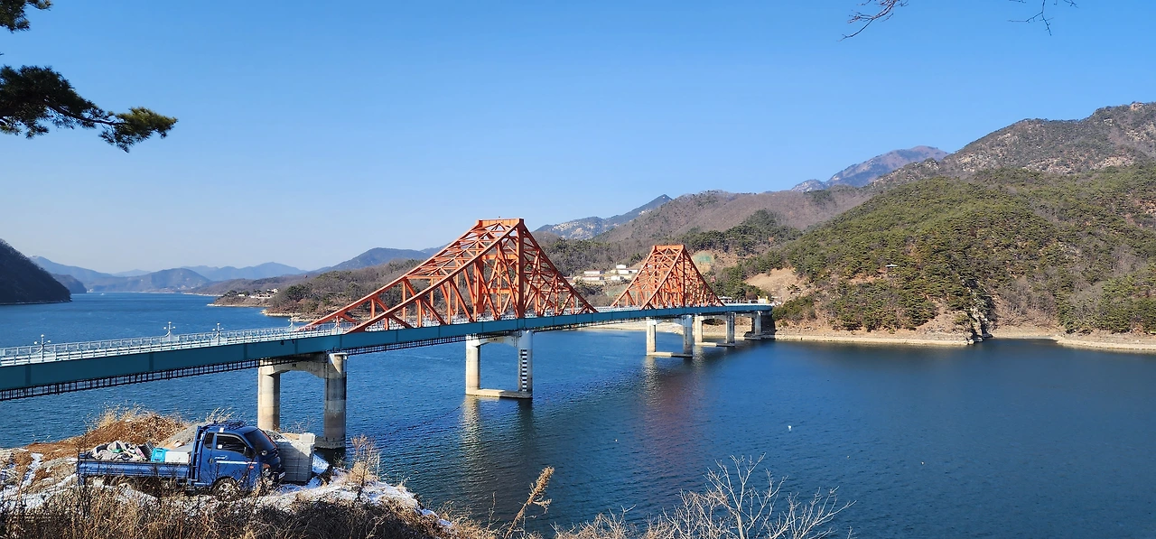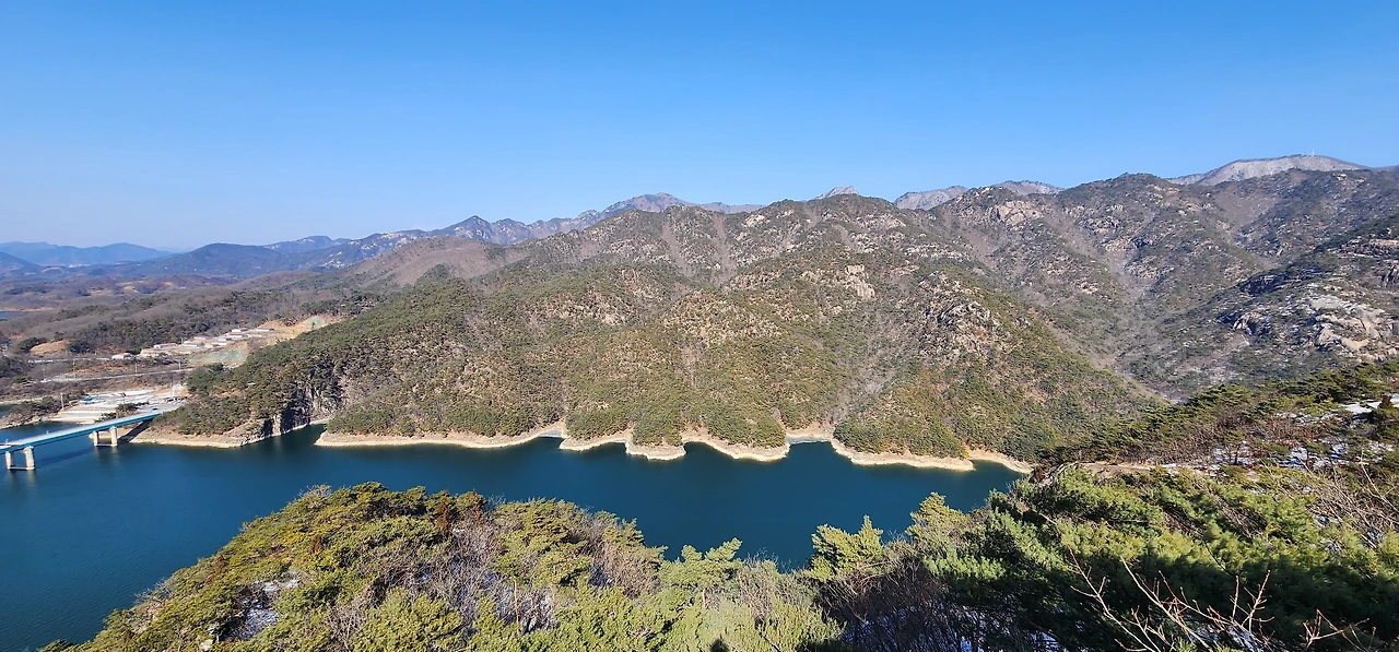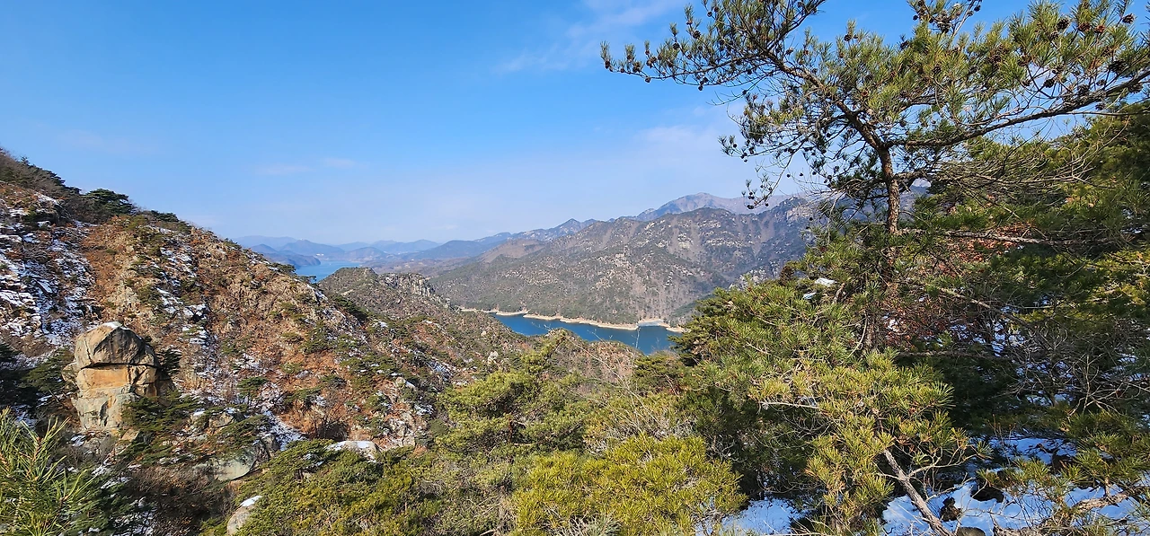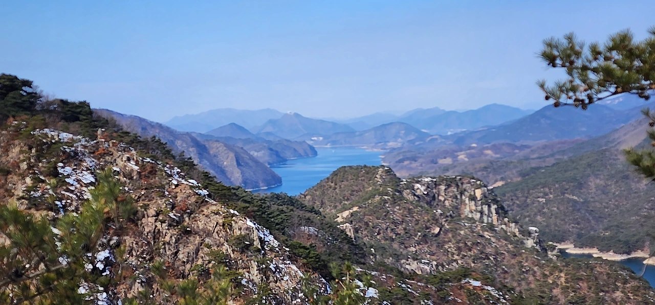 온 사방에 병풍처럼 산이 둘러싸고 있는 것도 탄성을 자아내지만 유유히 흐르는 청풍호 호수가 또한 장관이다. 겨울이라 호수에 얼음이 얼어 있는데 배가 얼음을 깨고 길을 내고 있었다. 장회나루 앞이었다. 구담봉에서는 장회나루가 저 멀리 내려다보이고 옥순봉에서는 옥순대교와 새로 생긴 옥순봉출렁다리가 시선을 사로잡는다.