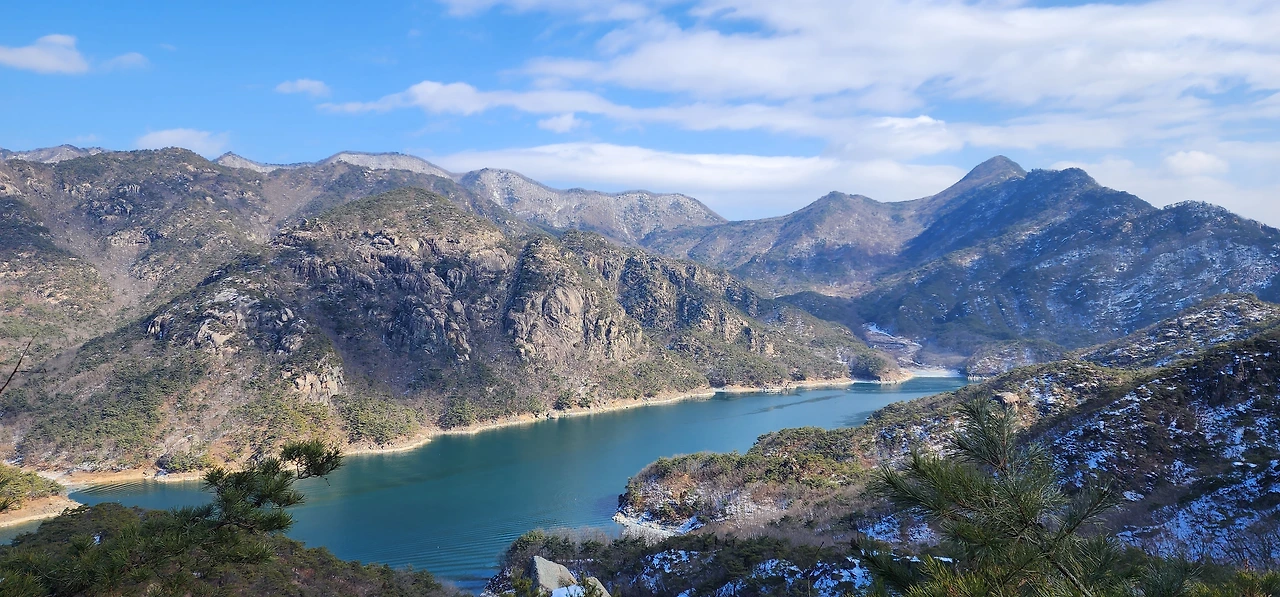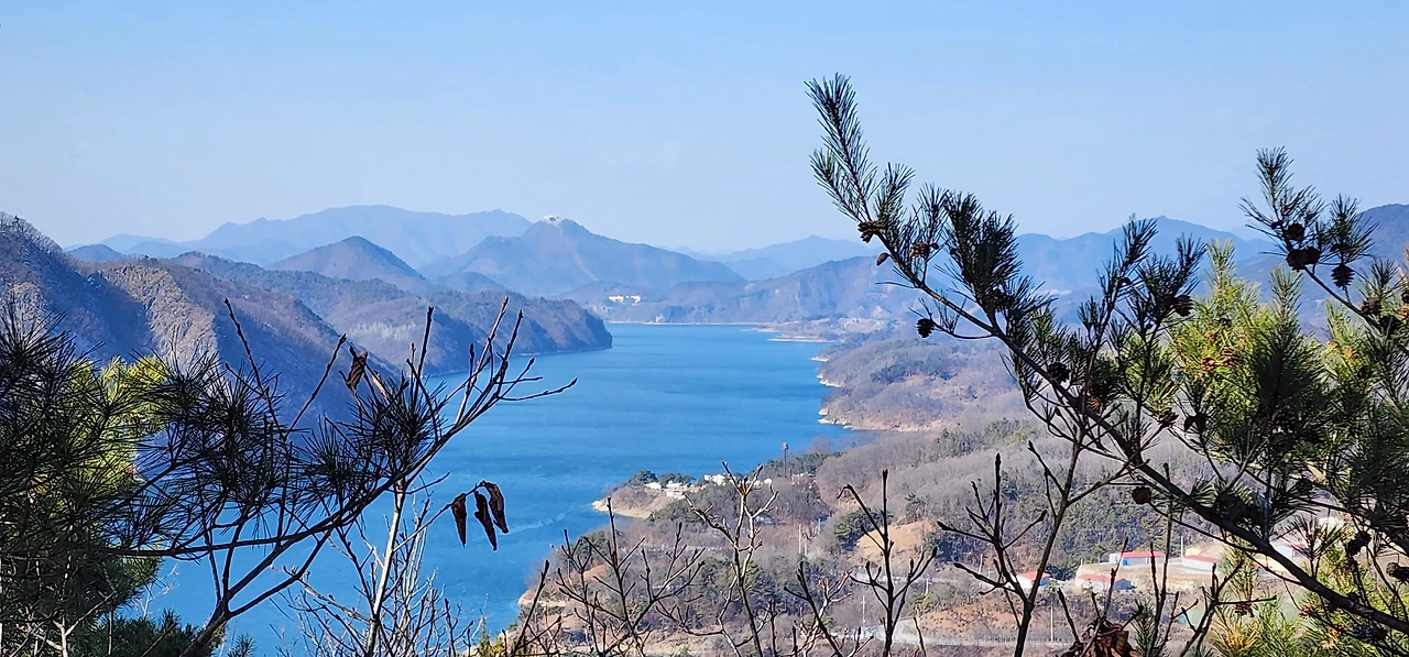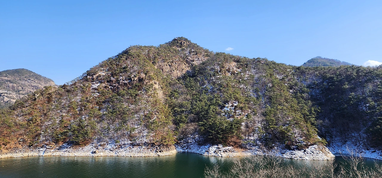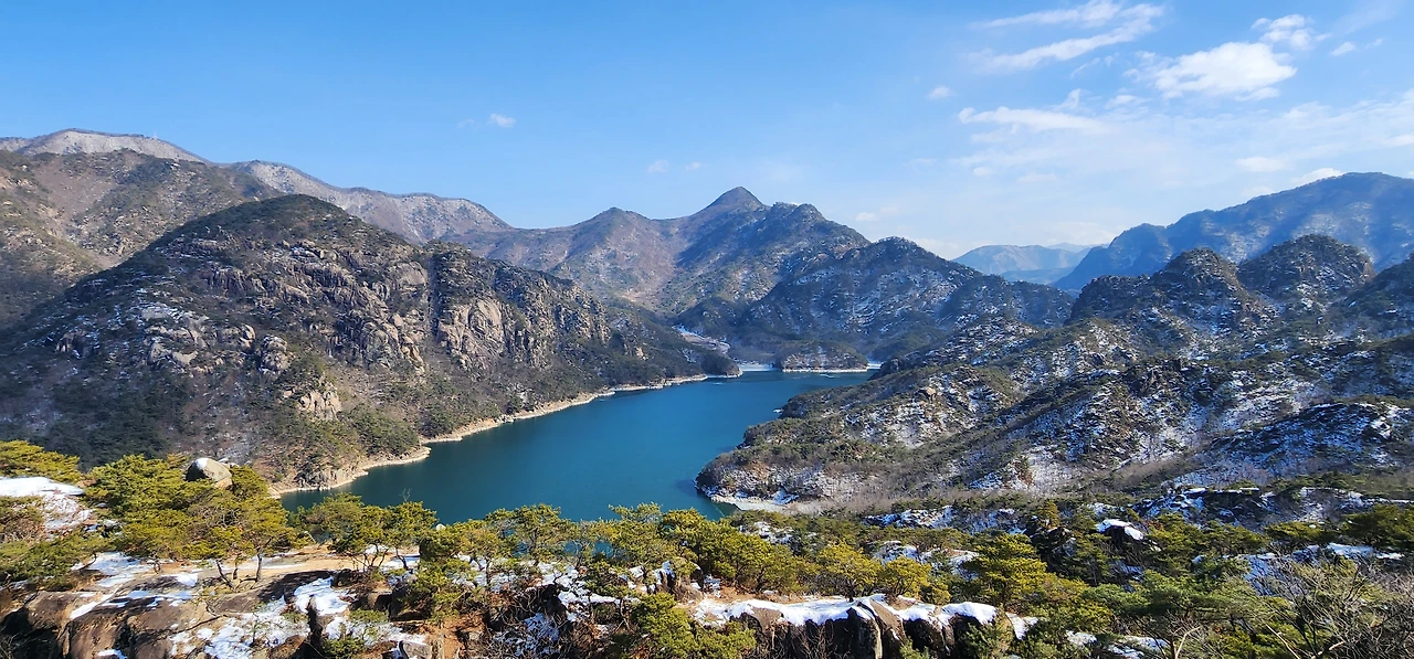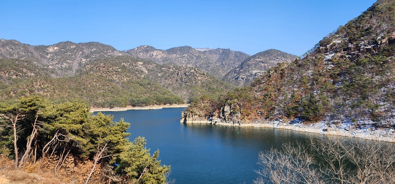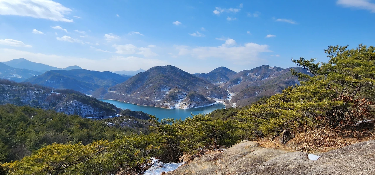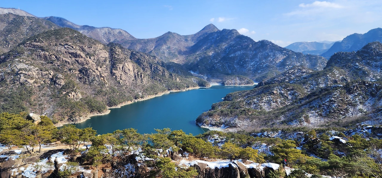 온 사방에 병풍처럼 산이 둘러싸고 있는 것도 탄성을 자아내지만 유유히 흐르는 청풍호 호수가 또한 장관이다. 겨울이라 호수에 얼음이 얼어 있는데 배가 얼음을 깨고 길을 내고 있었다. 장회나루 앞이었다. 구담봉에서는 장회나루가 저 멀리 내려다보이고 옥순봉에서는 옥순대교와 새로 생긴 옥순봉출렁다리가 시선을 사로잡는다.