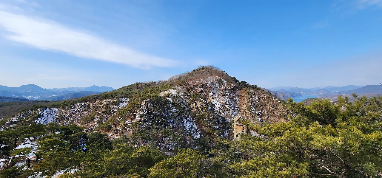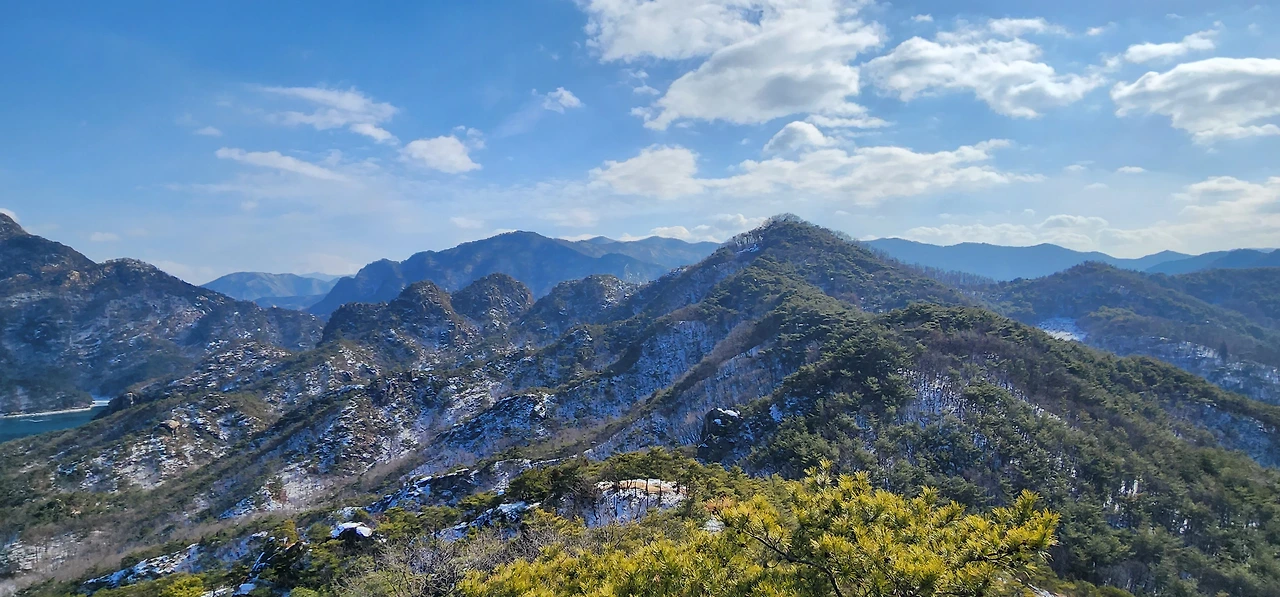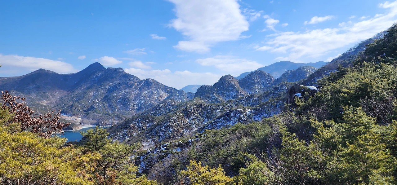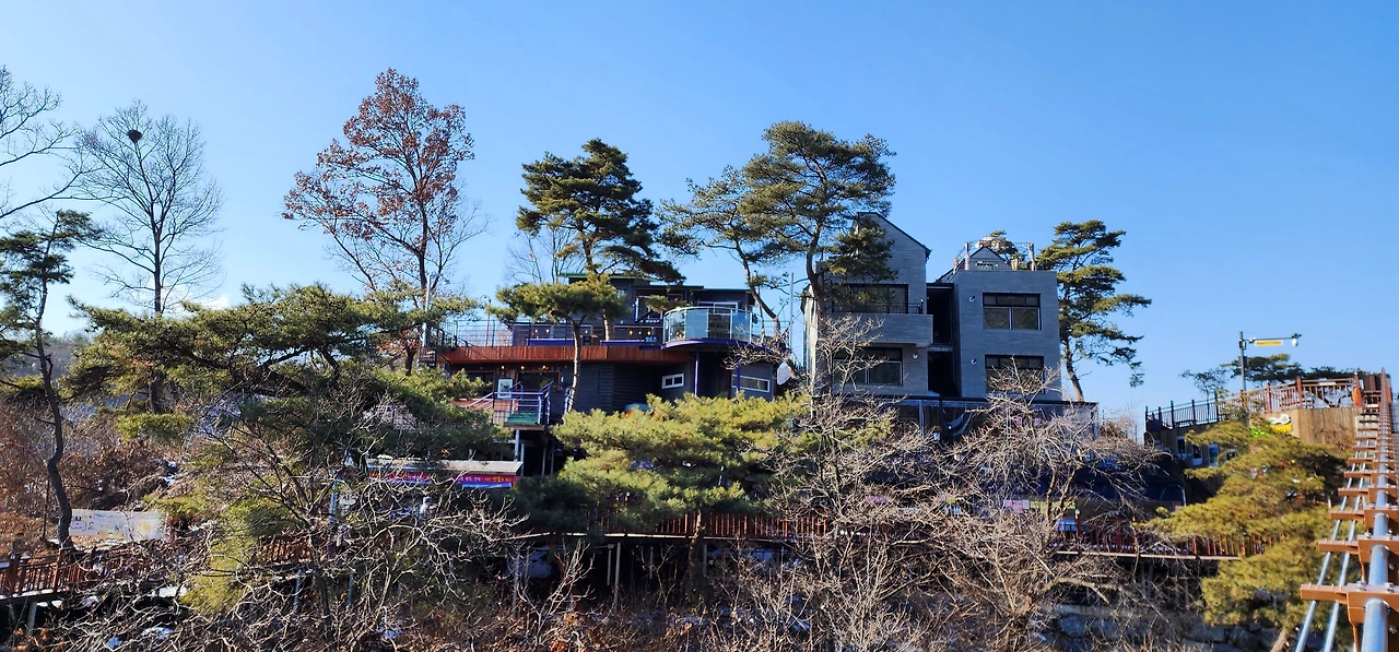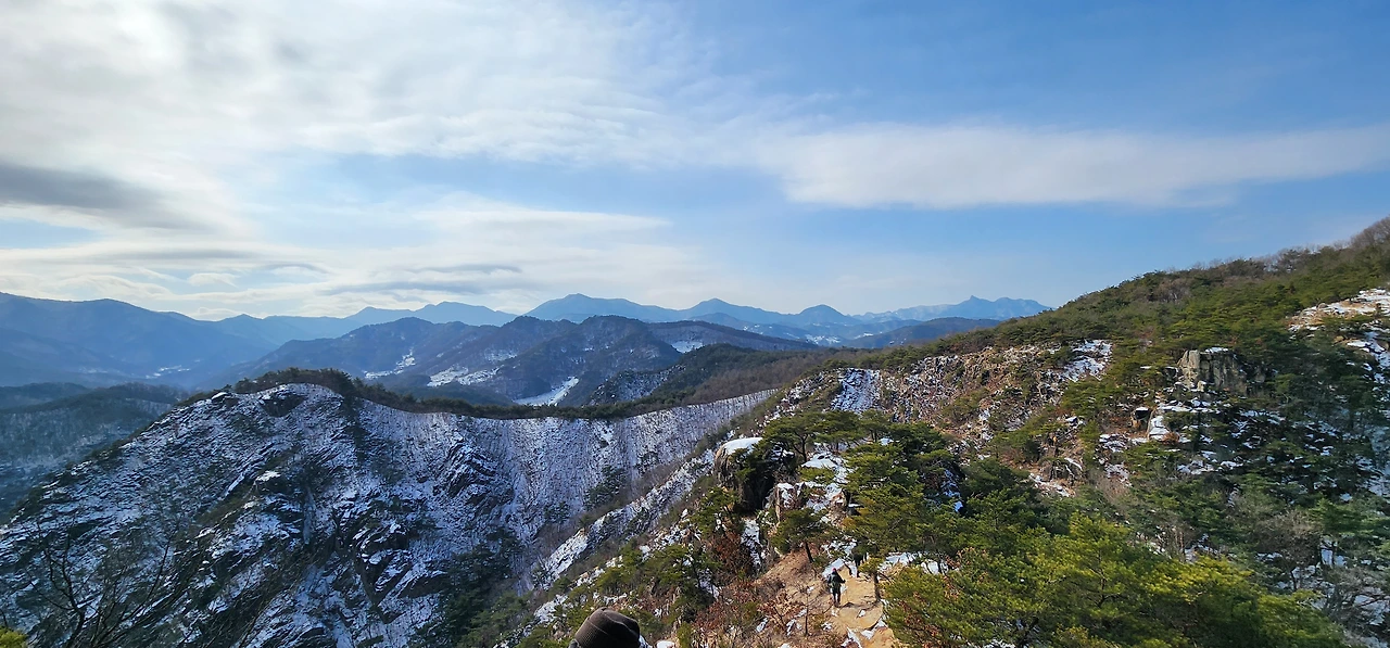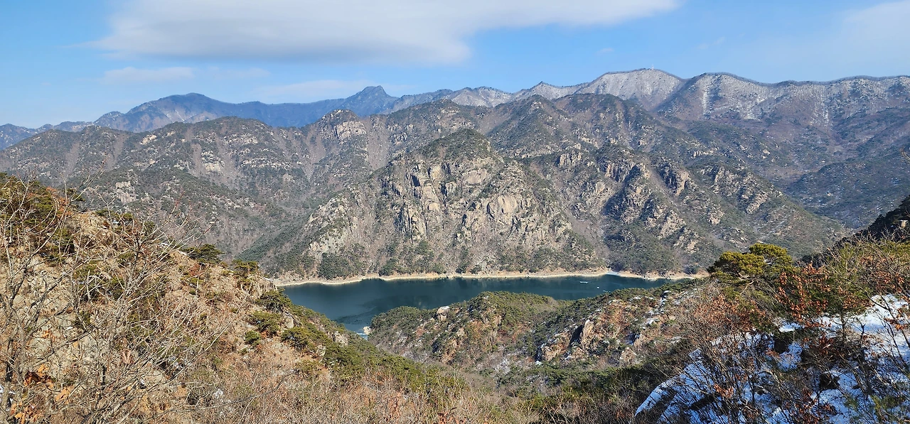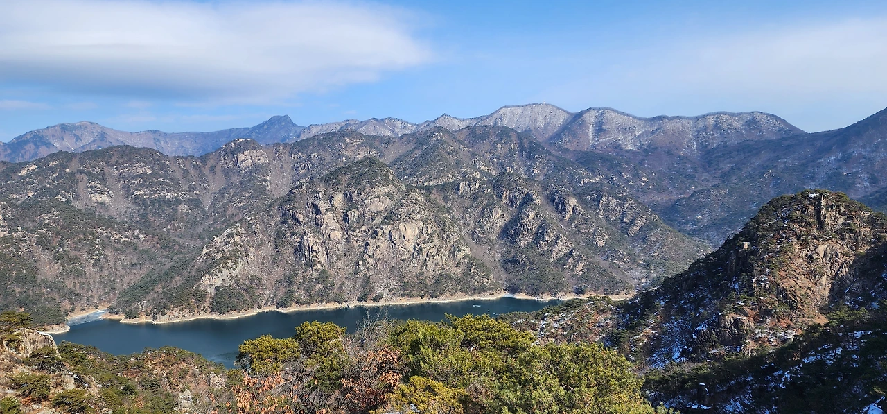 온 사방에 병풍처럼 산이 둘러싸고 있는 것도 탄성을 자아내지만 유유히 흐르는 청풍호 호수가 또한 장관이다. 겨울이라 호수에 얼음이 얼어 있는데 배가 얼음을 깨고 길을 내고 있었다. 장회나루 앞이었다. 구담봉에서는 장회나루가 저 멀리 내려다보이고 옥순봉에서는 옥순대교와 새로 생긴 옥순봉출렁다리가 시선을 사로잡는다.