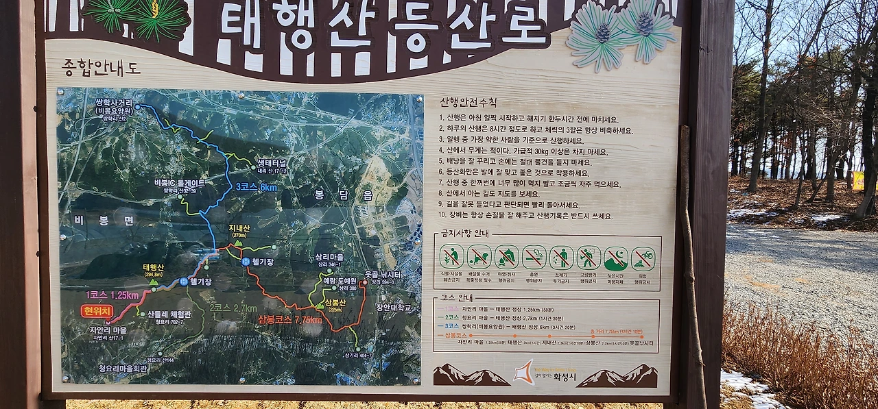 화성시 비봉면에 태행산(295m)이 있다. 칠보산 남쪽이고 건달산 북쪽이다. 비봉면 자안리나 청요리에서 산행은 시작된다. 태행산 남쪽 등산로 들머리에 산행 안내도가 잘 세워져 있다. 비교적 완만한 길을 따라 오르다 보면 조금씩 경사가 높아져 가고 돌탑이 여러 개가 세워져 있어 눈길을 끈다. 누군지 참 정성스럽게도 쌓았다.