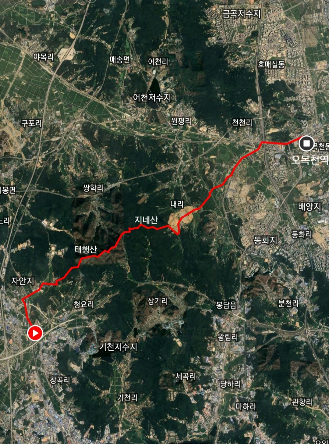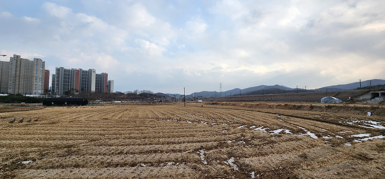 지네산을 내려오면 거대한 아파트 단지 공사가 한창이다. 화성시 봉담읍 내리다. 머지 않아 이곳은 도시로 변할 것이다. 전철을 타기 위해 수인분당선 오목천역으로 부지런히 걷다 보면 고속철도를 지나는데 이따금 마주치는 KTX 열차는 정말 번개처럼 지나간다. 부근에 여기 저기 목장이 있고 젖소들이 끊임없이 뭔가 먹고 있다. 밭에서 떼 지어 모여 있는 새떼도 특이한 볼거리다. 내리의 아파트 단지가 완공되어도 새떼들을 볼 수 있을까 모르겠다.