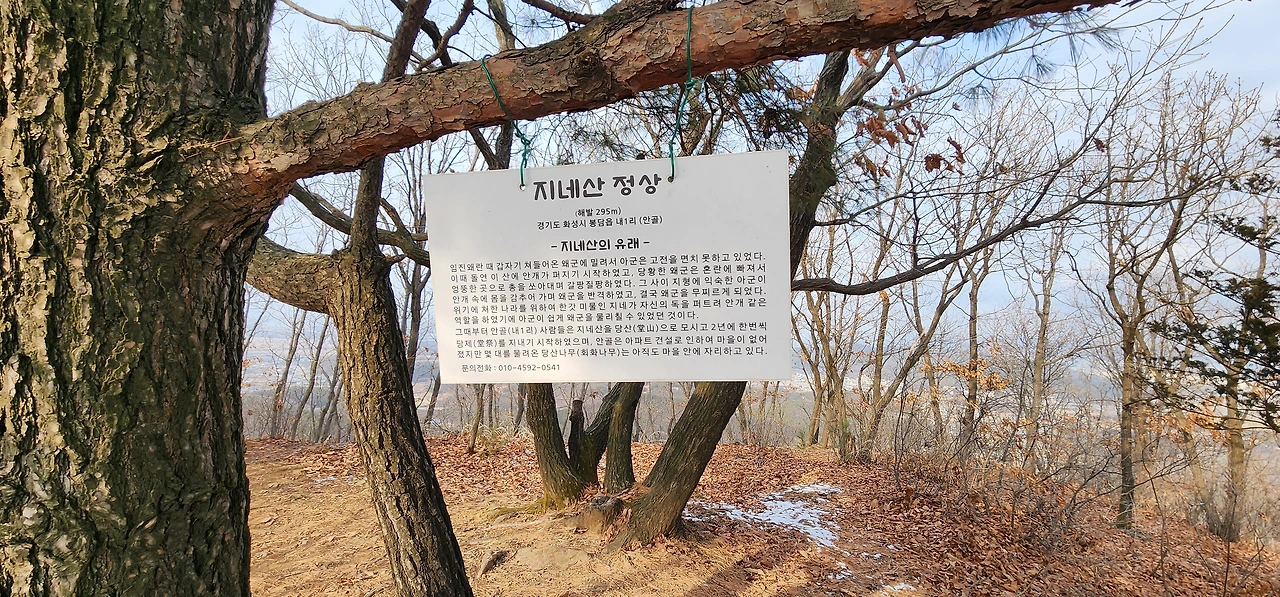 왔던 길로 되돌아가면 편하지만 내처 산길을 걷다 보면 등산로는 계속 이어지고 네이버 지도에는 삼봉산으로 표시되어 있지만 정작 실제로는 지네산이라는 표지가 나무에 걸린 산에 이른다. 거기 지네산의 유래가 적혀 있다. 임진왜란 때 왜군과 전투가 벌어졌는데 지네가 독을 퍼뜨려 안개가 자욱하게 생겼고 안개 속에서 당황한 왜군을 무찔렀다는 것이다.