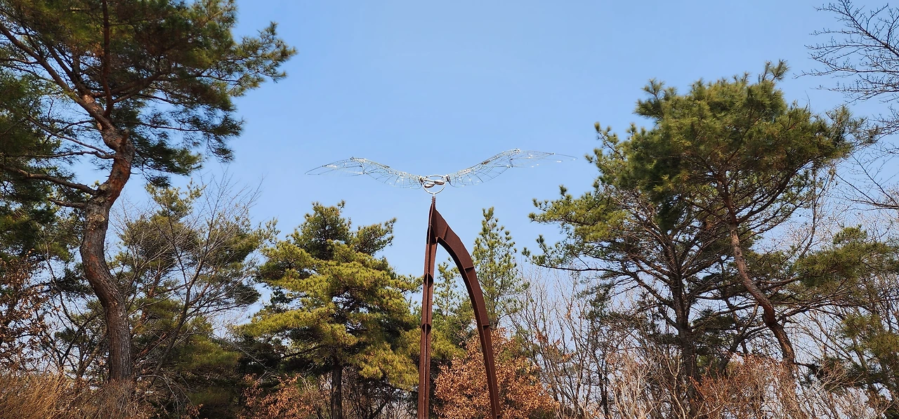 산행 들머리를 김포국제조각공원으로 잡았다. 조각공원은 무척 조용했다. 도무지 사람을 볼 수 없었다. 산허리에 난 숲길에 들어서서야 비로소 사람을 만날 수 있었다. 산책로 곳곳에 조각 작품이 있었다. 작품들은 대체로 규모가 컸다. 한 작품 앞에 벤치가 있어 앉아서 쉬며 작품을 감상했다. '산들거리는 속삭임'이라는 일본 작가의 작품이었다. 잠자리 날개가 천천히 빙글빙글 돌고 있었다. 저건 전기의 힘으로 돌아갈까. 네거리가 나오고 오른쪽으로 접어들면서 조각공원에서 벗어나 문수산 등산로가 시작됐다. 거의 평지나 다름없었다.