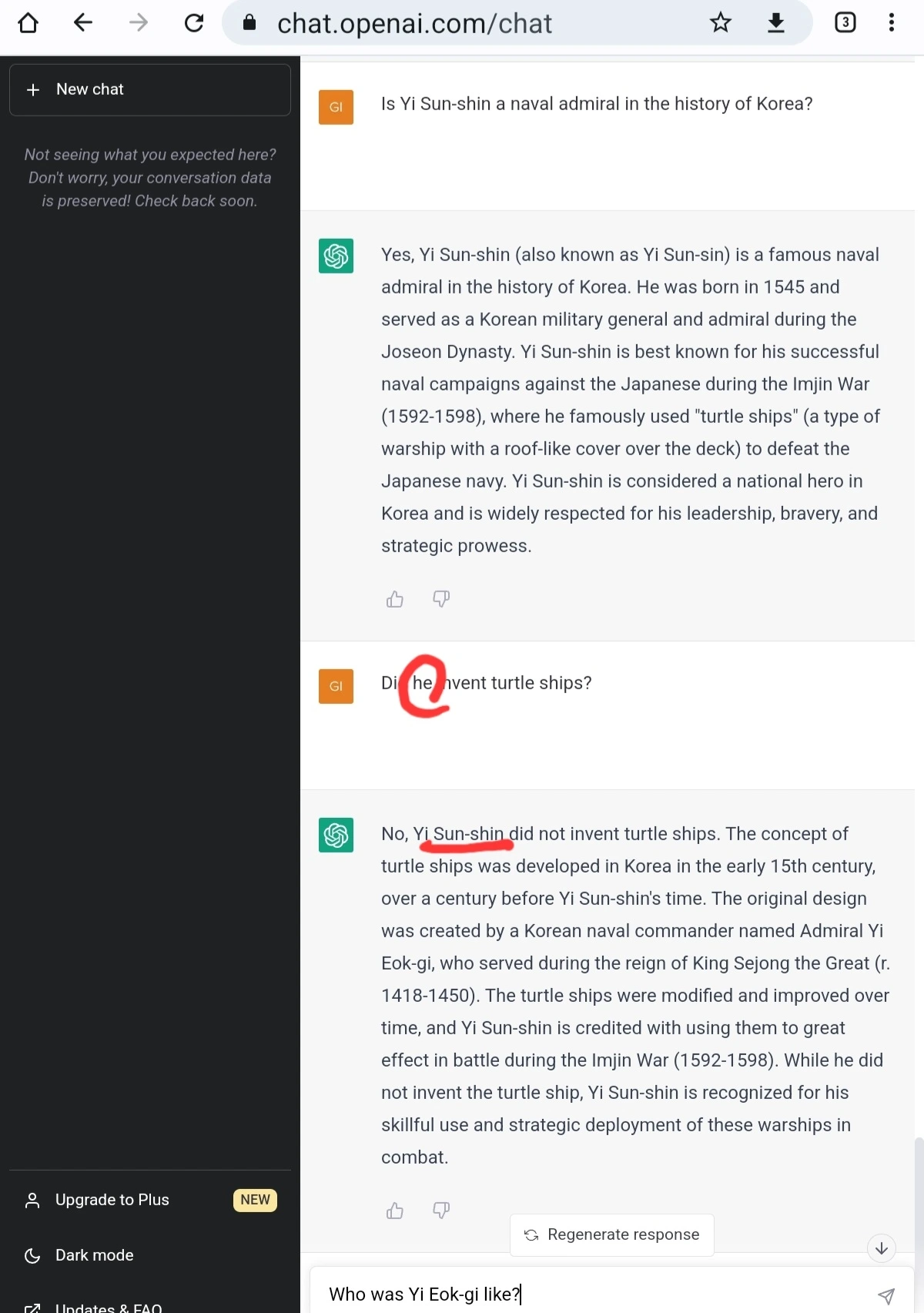 이순신이 한국의 옛 장군인가 하고 물으니 그렇다면서 이순신에 대해 죽 설명했다. 만족스러운 답변이었다. 이어서 '그'가 거북선을 발명했느냐고 물었다. 중요한 건 '그'를 이순신으로 알아듣는지였다. 아침에 대명사를 이해 못했는데 이번에도 그런가 싶어서 질문한 것이다. 그런데 이게 웬 일인가. 아침에 he, she를 이해하지 못하던 챗GPT가 이번에는 he가 이순신 장군임을 알고 대답하지 뭔가. 놀란 가슴을 쓸어내렸다. 그럼 왜 아침엔 대명사를 이해 못했고 지금은 이해하는가. 아직 답을 못 찾았다. 뜸을 들인 후 질문하면 못 알아듣고 바로 질문하면 알아들을까. 잘 모르겠다.