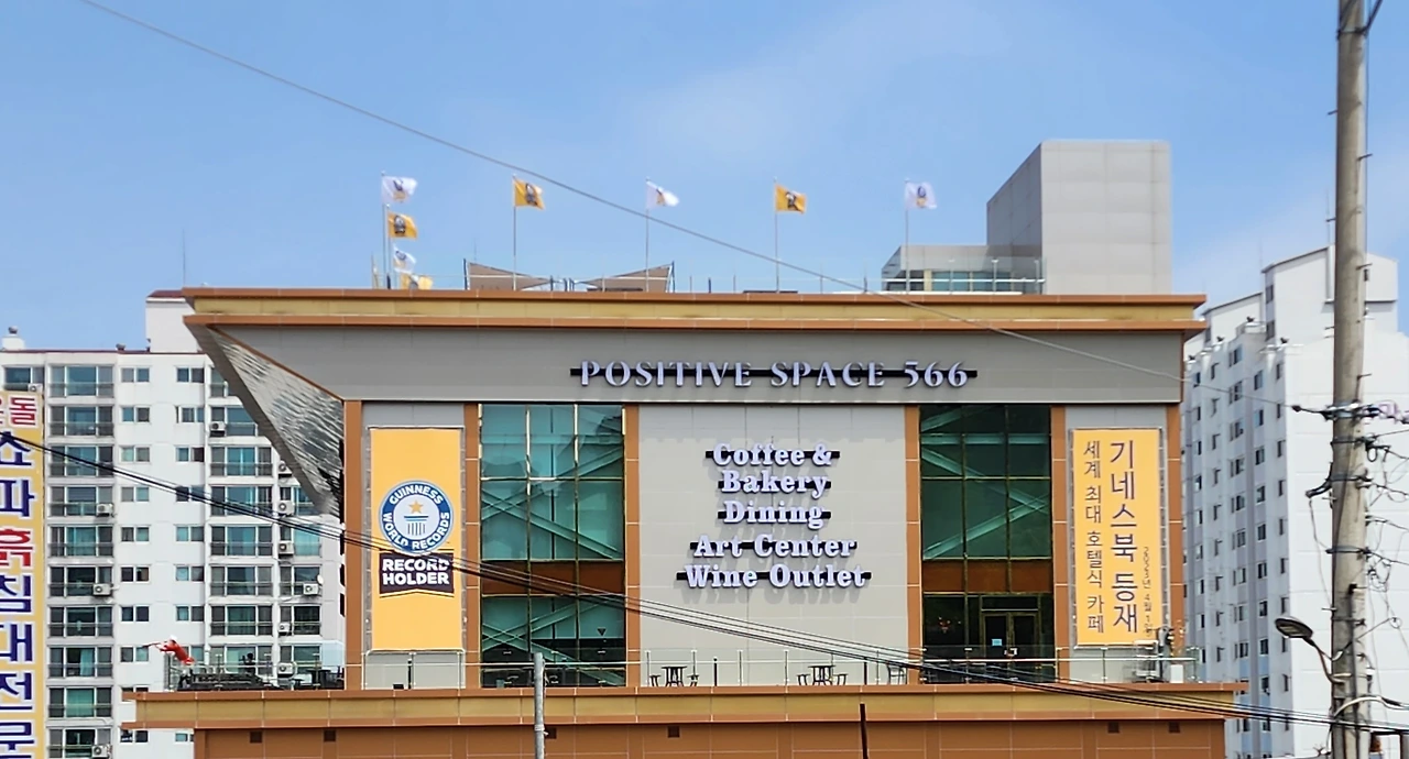 포지티브 스페이스 566... 카페의 이름인데 566은 김포시 감정동 566번지에 있다고 해서 붙여졌단다. 이 호텔식 카페는 2022년 9월 문을 열었고 2023년 4월 1일 세계 최대 카페로 기네스북에 등재되었다. 좌석이 2,190석이라니 놀랍다.