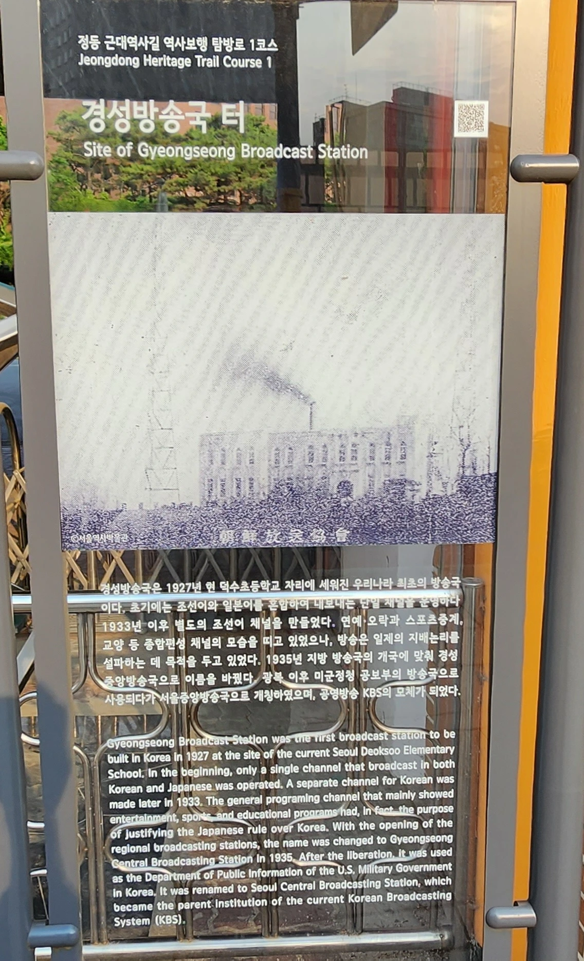 시청역으로 지하철을 타러 가면서 덕수초등학교 앞을 지날 때였다. '경성방송국 터'라는 팻말이 세워져 있었다. KBS의 뿌리인 경성방송국은 1920년대에 지금 덕수초등학교 자리에 있었다는 것이다. 방송의 역사가 100년이 가까워 온다. 최초의 방송국은 정동에서 시작됐다. 정동은 여간 유서 깊은 곳이 아니다.